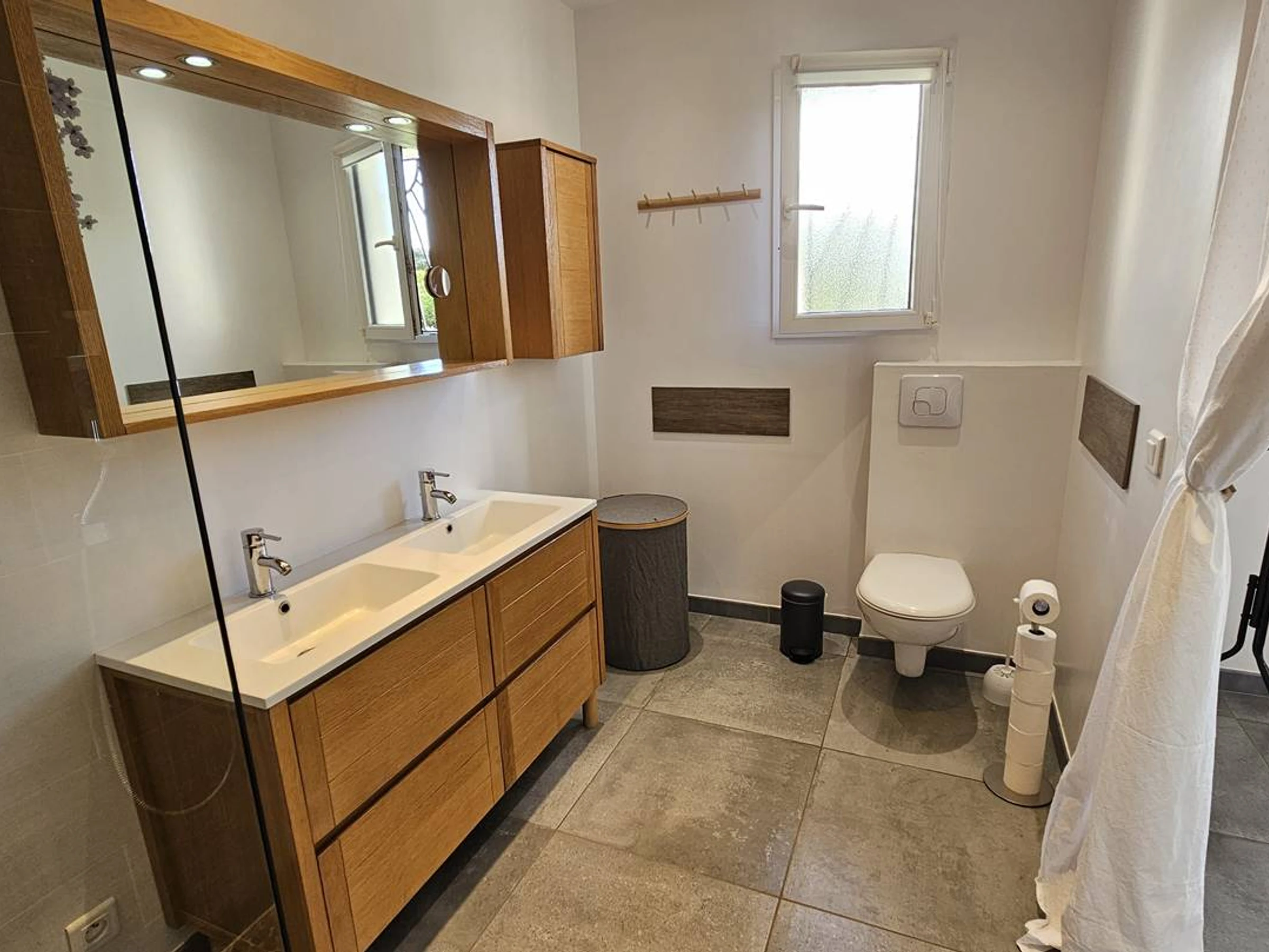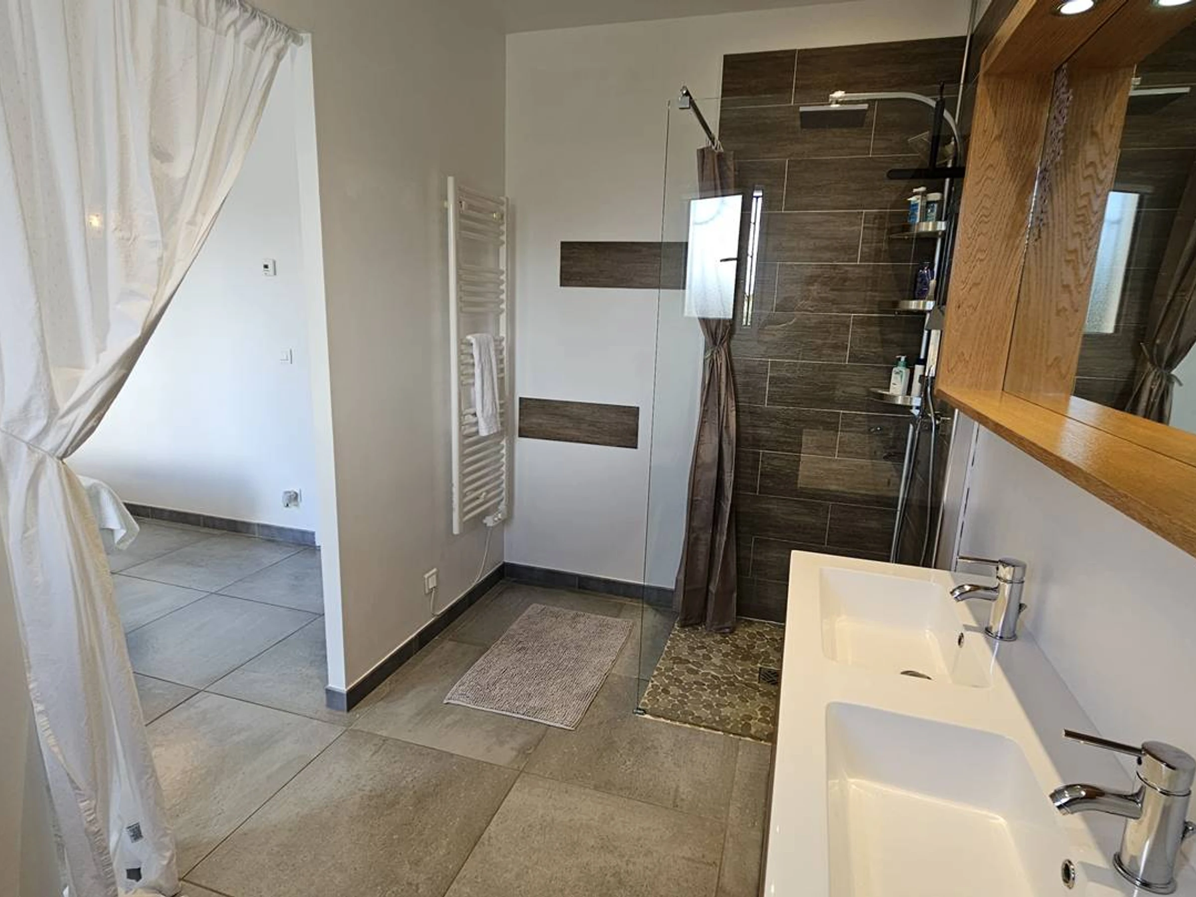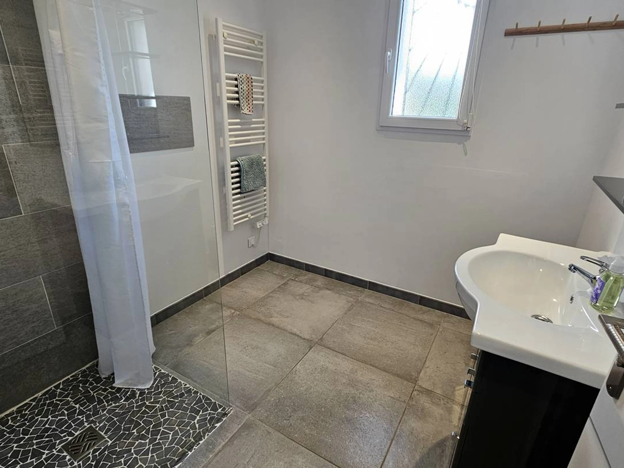 Badezimmer: Dusche, Waschbecken, Handtuchtrockner, Haartrockner.