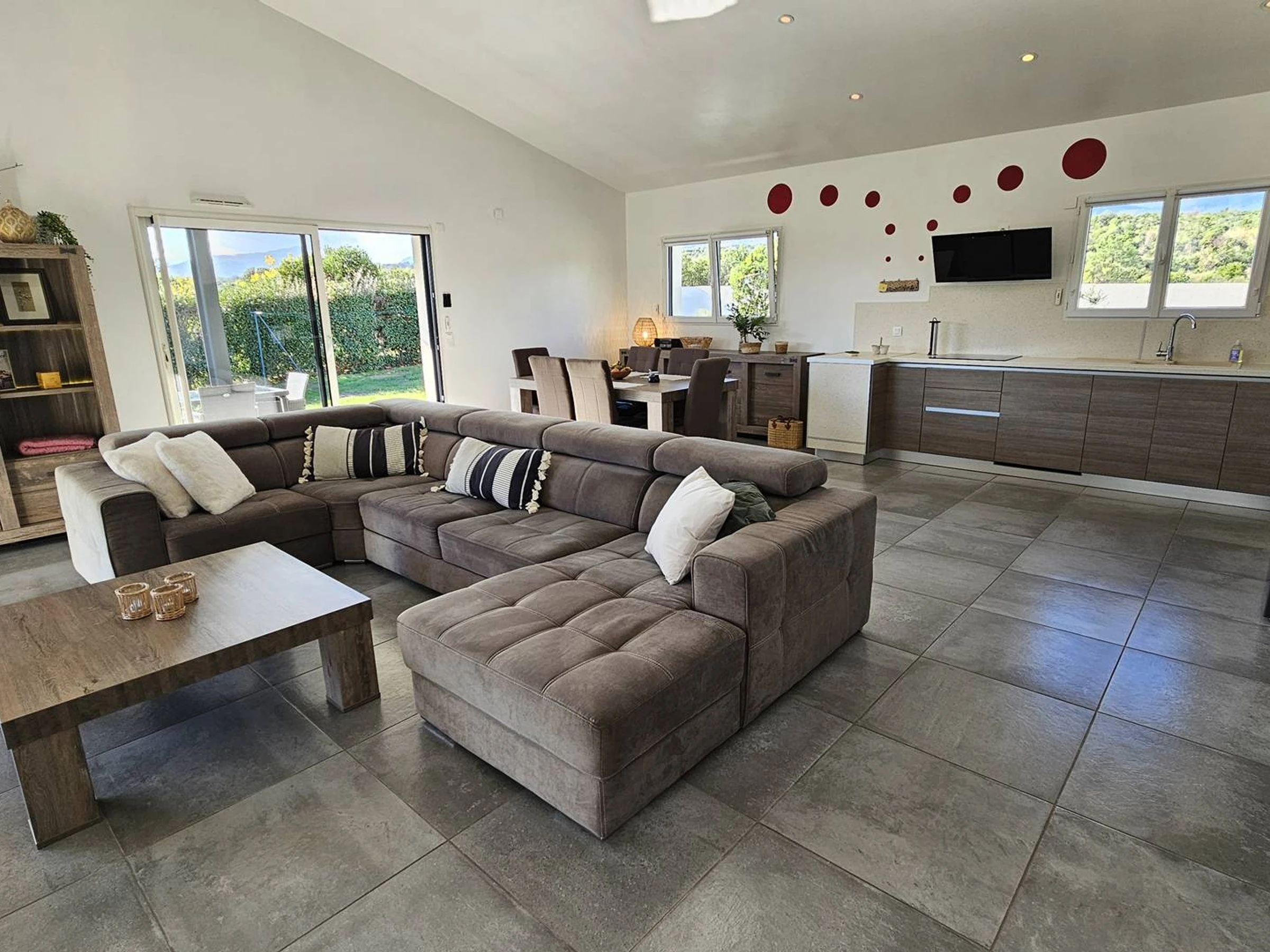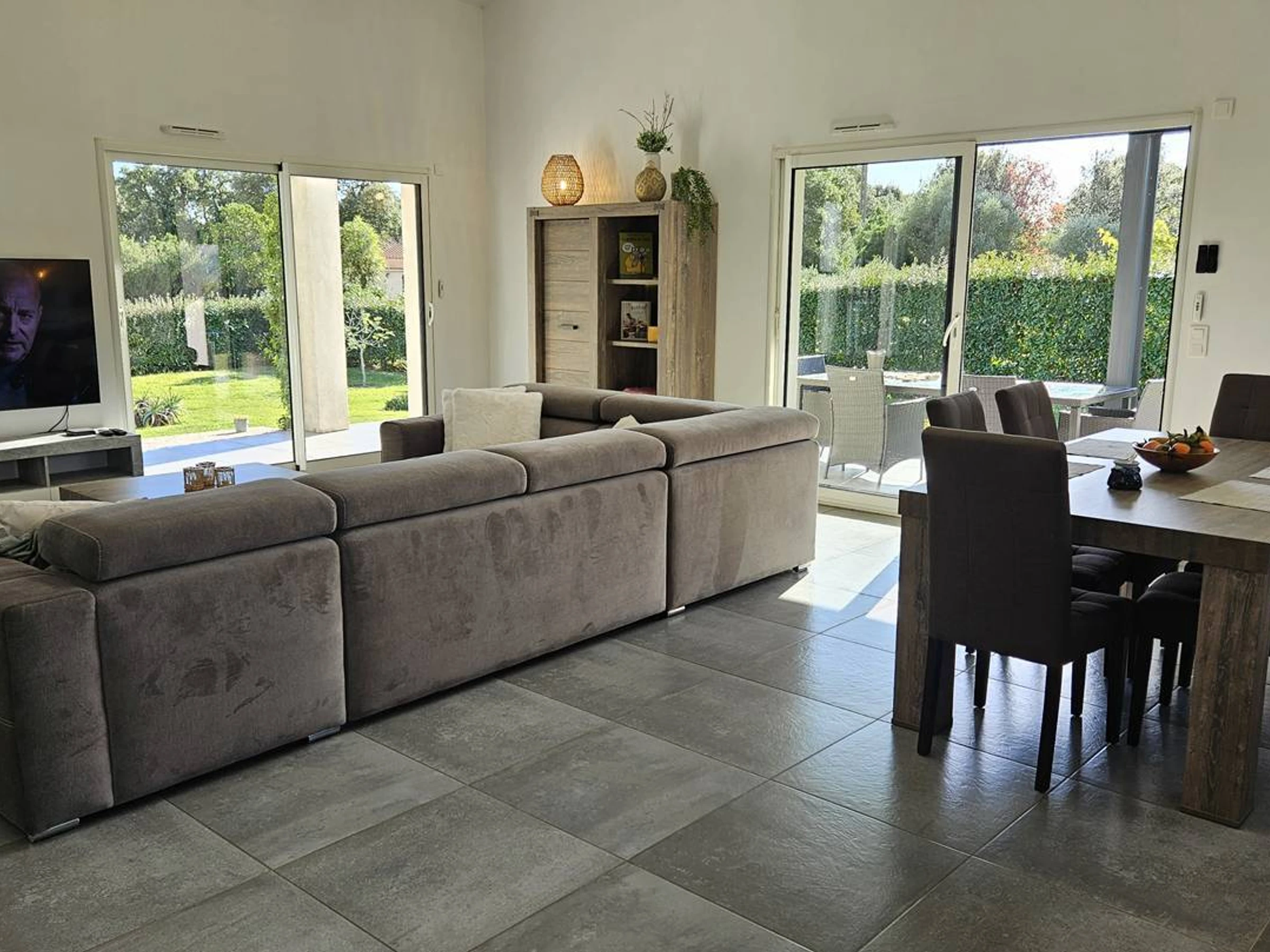 Eingang zu einem schönen Wohn-/Esszimmer (zentrale Klimaanlage): Ecksofa, 65-Zoll-Satellitenfernseher, WLAN, Tisch mit 6 Stühlen, Stauraum.
