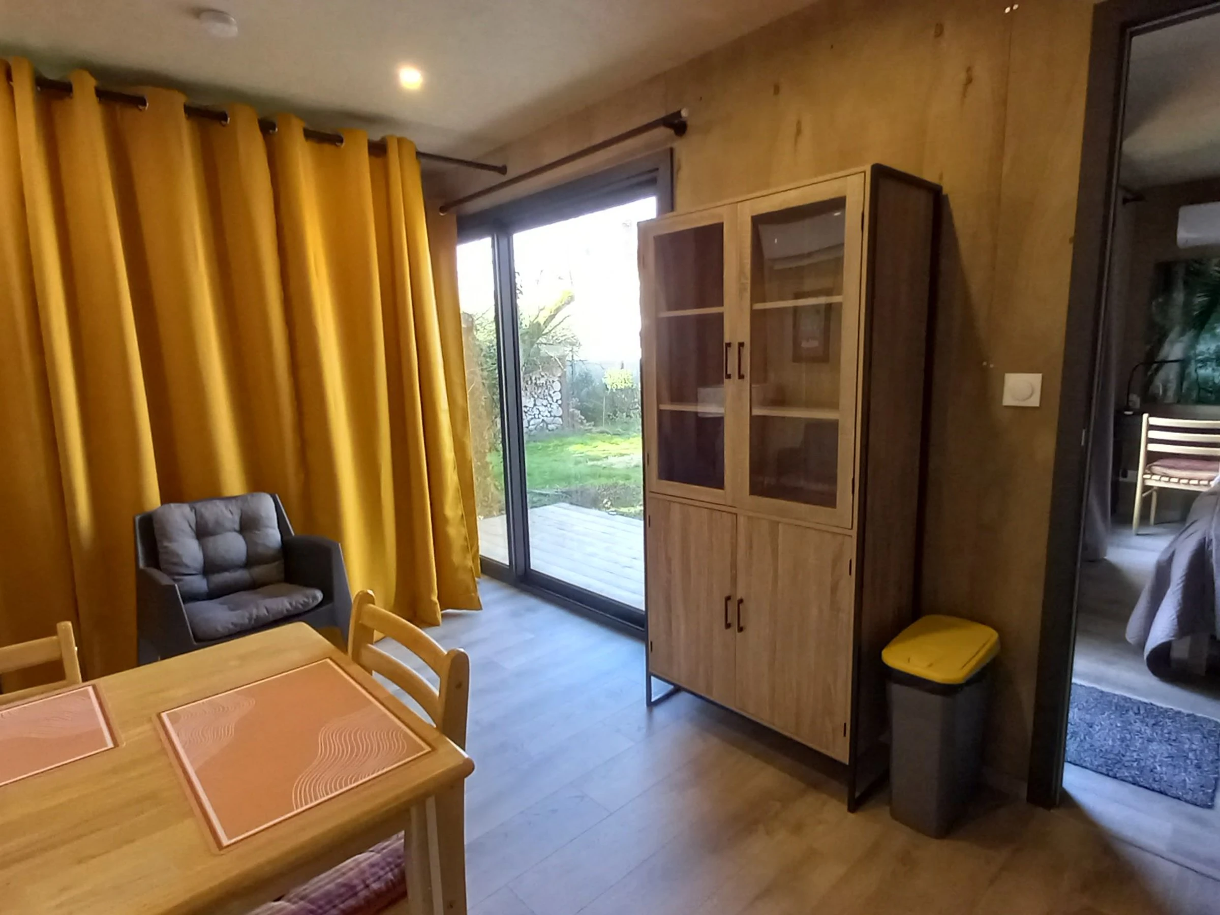 Kleine Terrasse mit Tisch, Stühlen, Sesseln und zwei Sonnenliegen. Der All-inclusive-Preis beinhaltet: Bettwäsche und Handtücher für den Aufenthalt, Endreinigung (ausgenommen Geschirr und Müll), Heizung und Strom nach Verbrauch (Heizung und Klimaanlage werden durch Solarmodule betrieben).