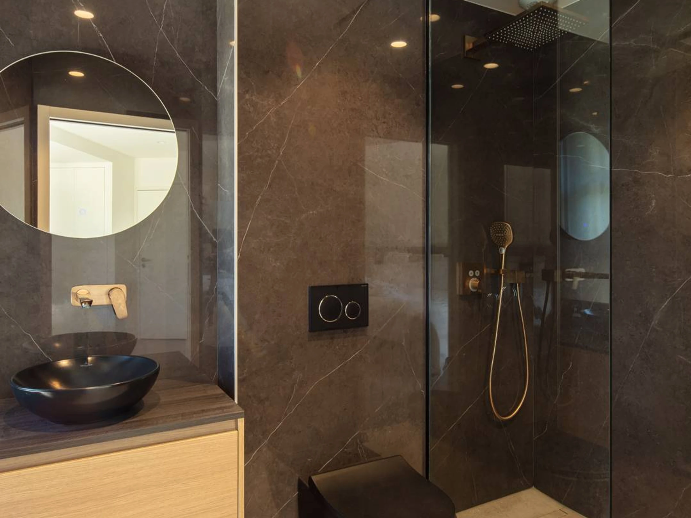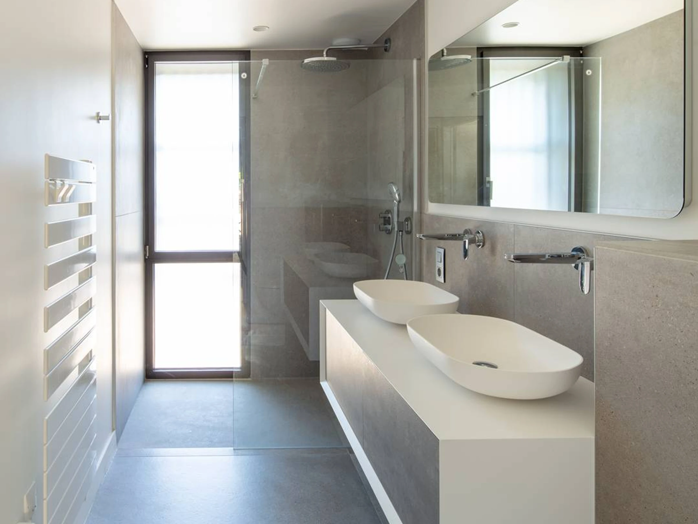 Master-Suite mit Kingsize-Bett (180 x 200), Ankleidezimmer, privatem Badezimmer mit Badewanne, italienischer Dusche, separatem WC und direktem Zugang zur Terrasse.