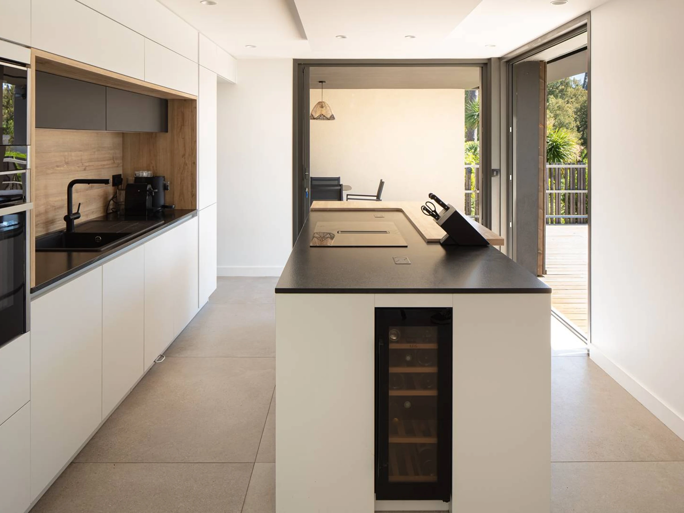 Hochwertige offene Küche mit Kochinsel, Induktionskochfeld, Dampfgarer, Weinkeller, Nespresso und allem, was Sie zum Kochen mit Familie oder Freunden brauchen.