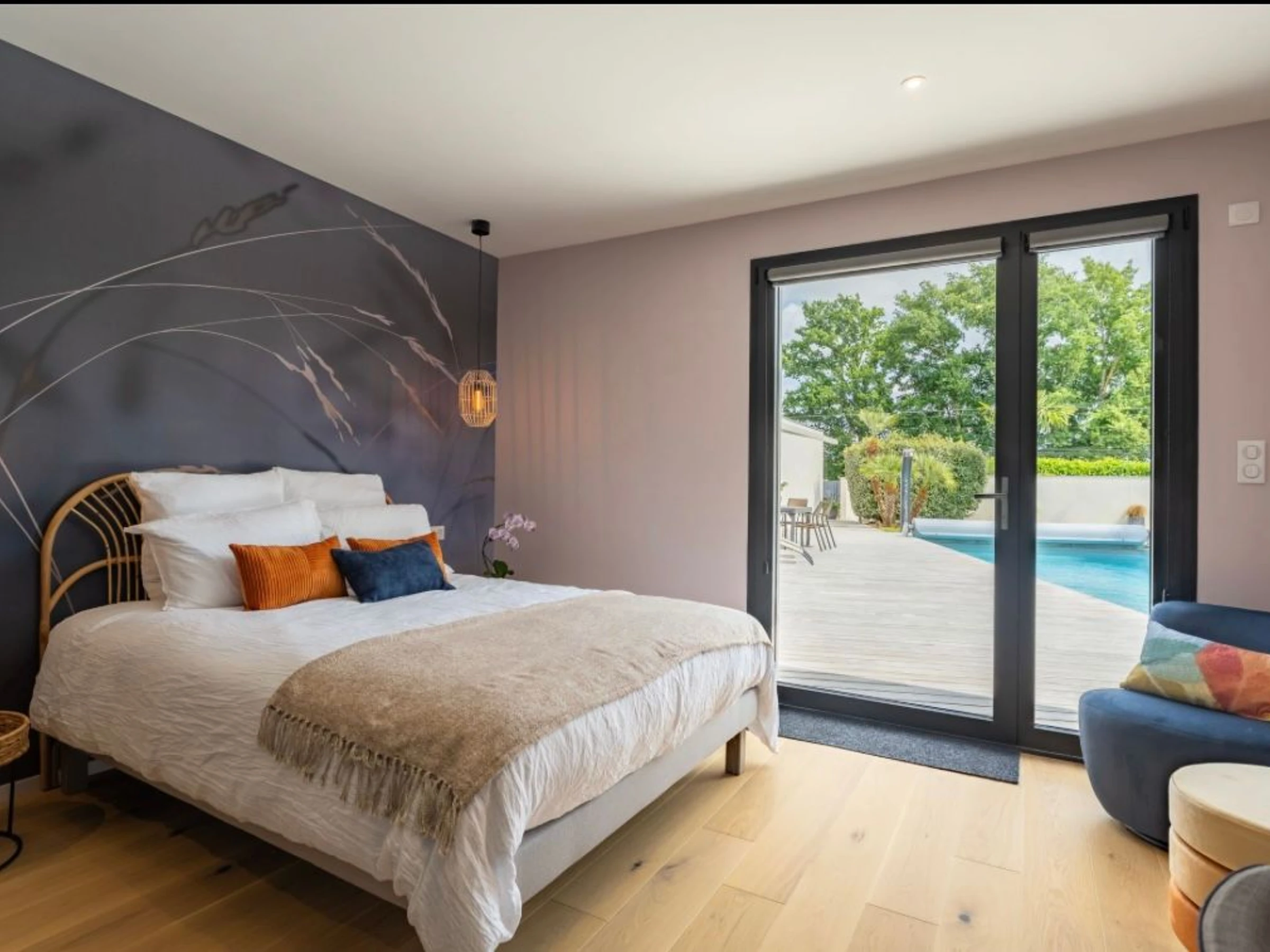 Zimmer im Erdgeschoss mit separatem Eingang und Zugang zur Terrasse und zum Pool. Die pastellfarbene Einrichtung sorgt für Ruhe und Entspannung und lädt zu einem erholsamen Schlaf ein. Das Zimmer verfügt über ein Queensize-Bett (160 x 200 cm), ein eigenes Badezimmer mit Dusche und separatem WC sowie einen Fernseher und einen Haartrockner.