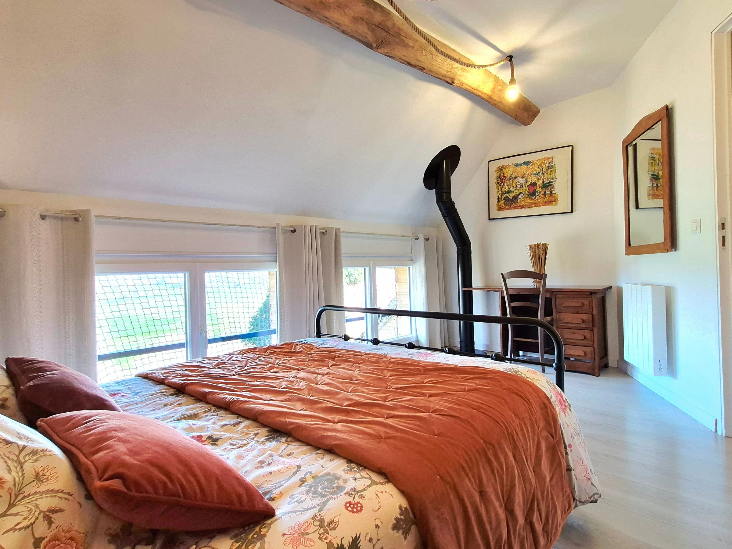 Im Erdgeschoss befinden sich eine große, voll ausgestattete Küche, ein helles und geräumiges Wohnzimmer mit Zugang zur Terrasse, TV, Glasfaser-Internet und WLAN, ein Büro, ein WC mit Waschbecken, eine Waschmaschine und ein Trockner. Der Zugang zum ersten Stock erfolgt über eine etwas steile Treppe. Vom Treppenabsatz aus gelangt man in drei Schlafzimmer: ein Schlafzimmer mit einem Einzelbett (90 x 200 cm) und zwei Schlafzimmer mit je einem Doppelbett (140 x 200 cm). Außerdem gibt es ein Büro sowie ein Badezimmer (mit Badewanne) und ein WC. Kleine Hunde sind auf Anfrage erlaubt. Die Wohnung ist nicht barrierefrei.