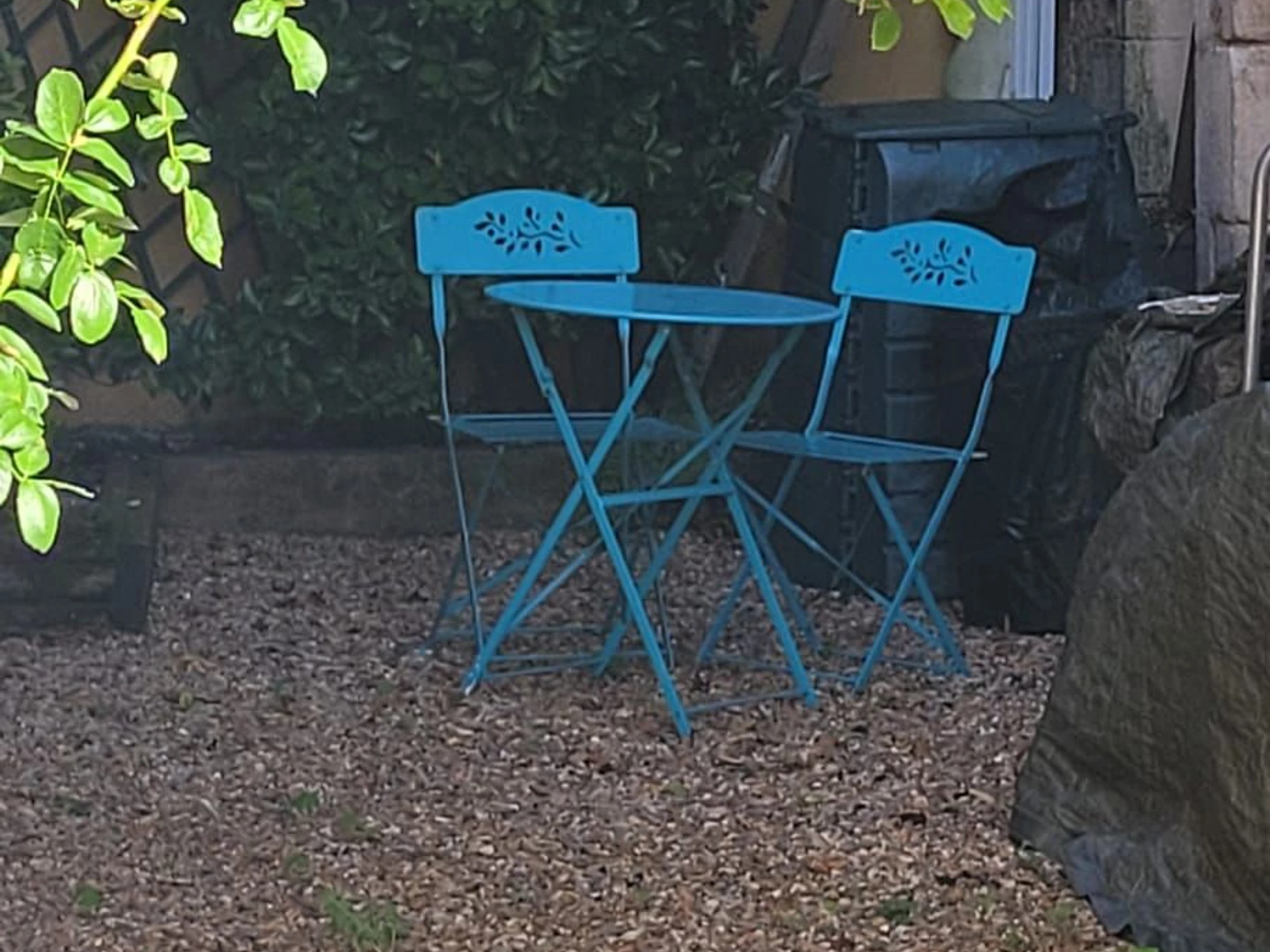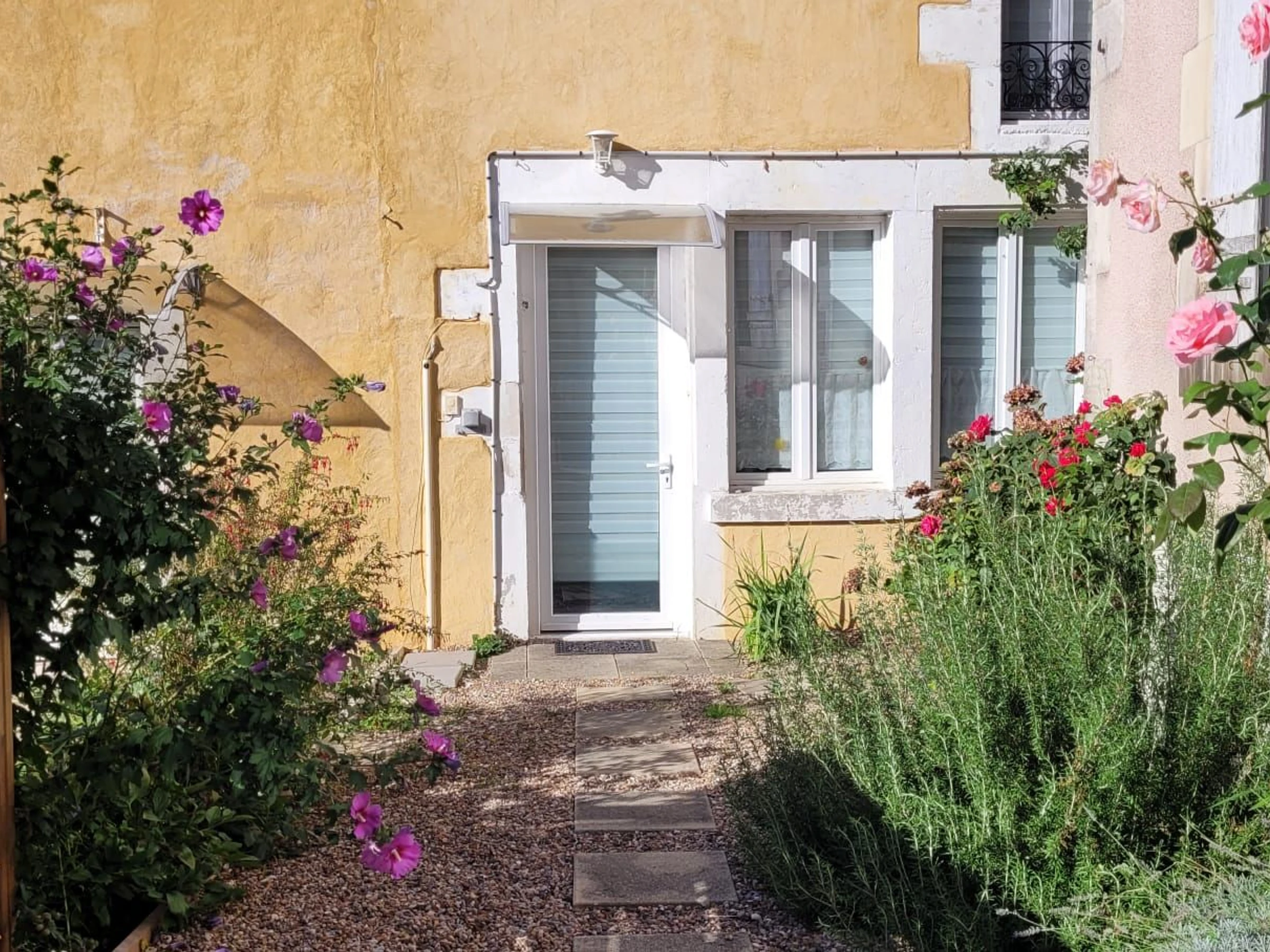 Das Haus liegt etwas zurückgesetzt von der Straße; das Nebengebäude ist unbewohnt. Der Vorgarten ist umzäunt und mit einer Green-Up-Ladestation für Elektrofahrzeuge ausgestattet (10 € pro Ladung).