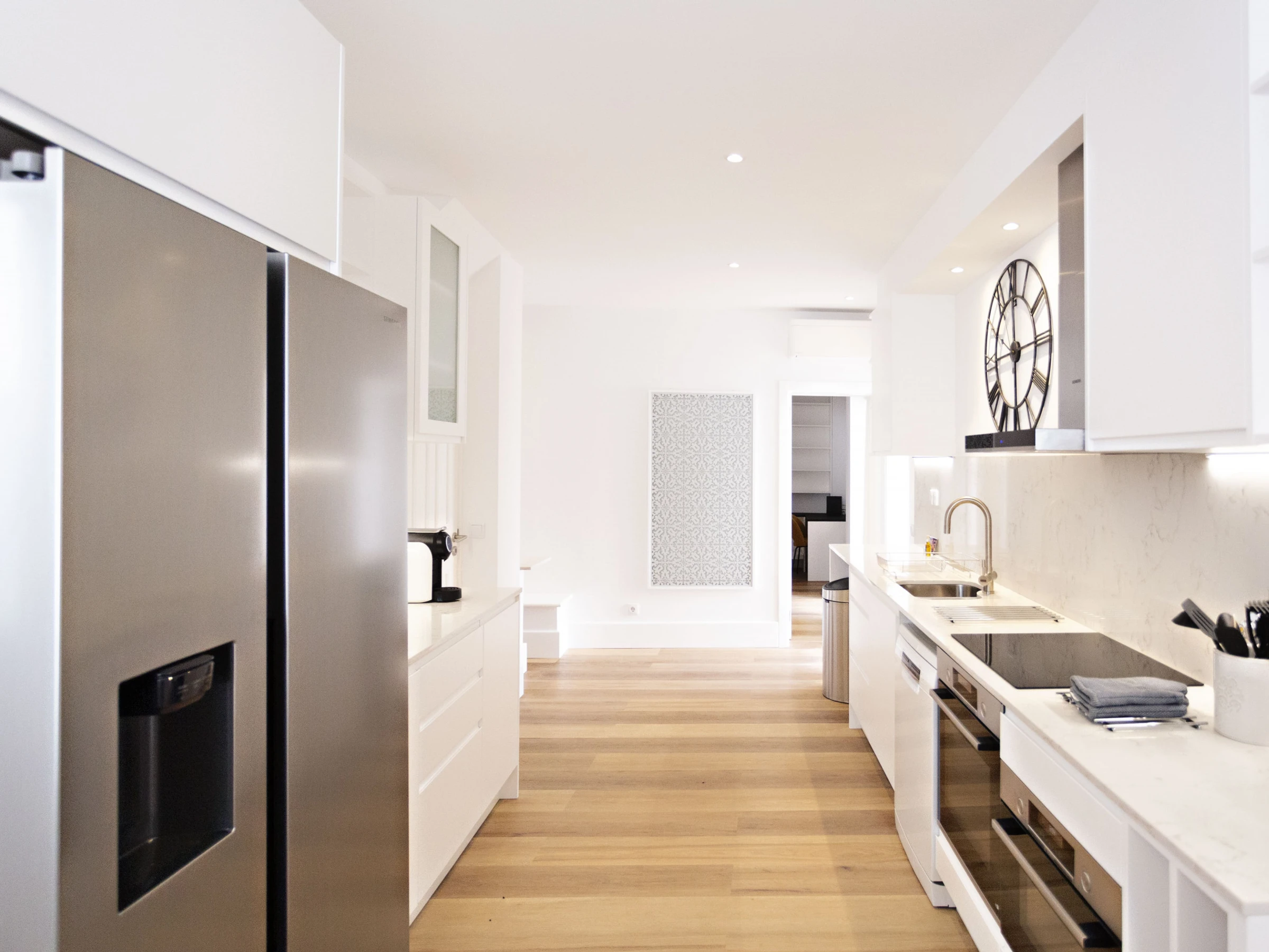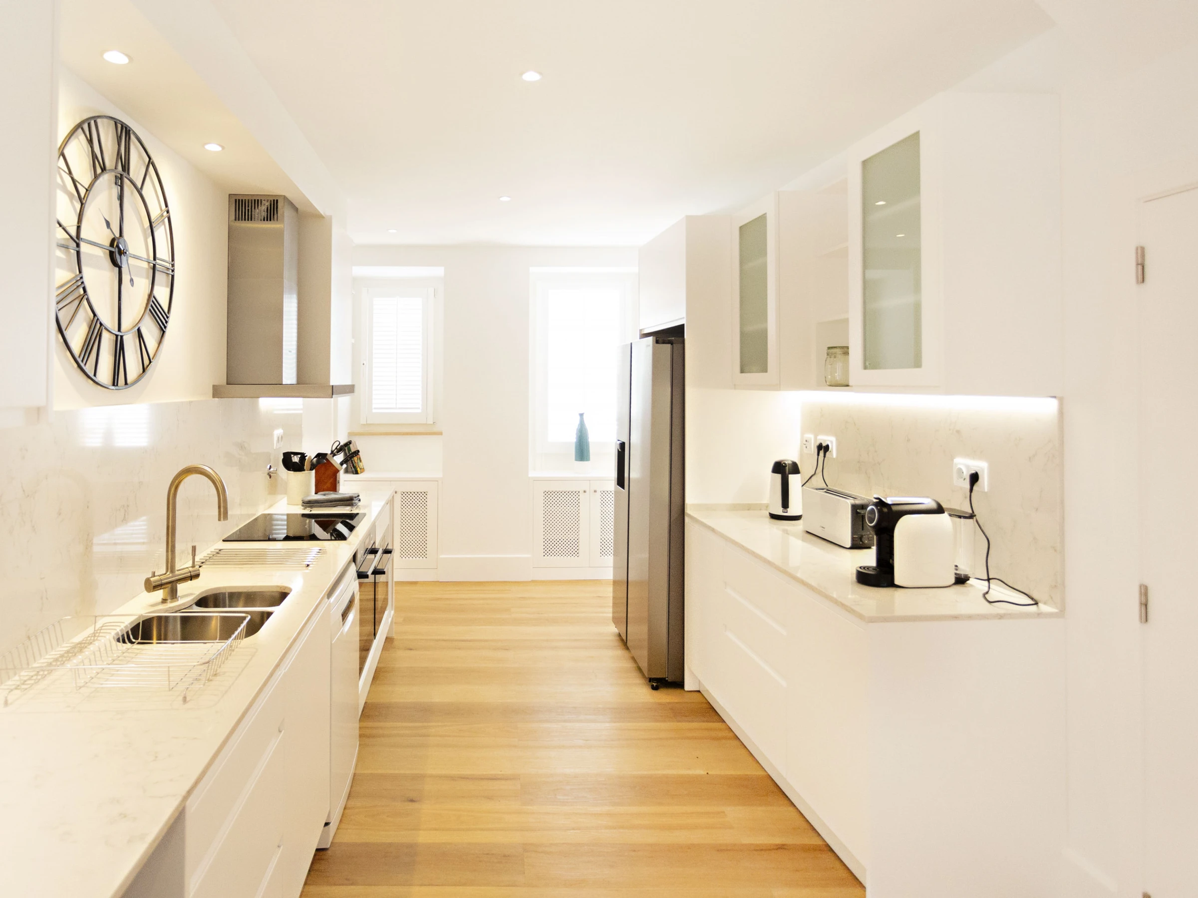 Dieses separate küche, mit induktions-kochfeld, ist ausgestattet in kühlschrank, mikrowelle, backofen, gefrierschrank, spülmaschine, geschirr/besteck, kochutensilien, kaffeemaschine, toaster, wasserkocher, saftpresse, küchengeschirr, teller und schüsseln, herdplatte.