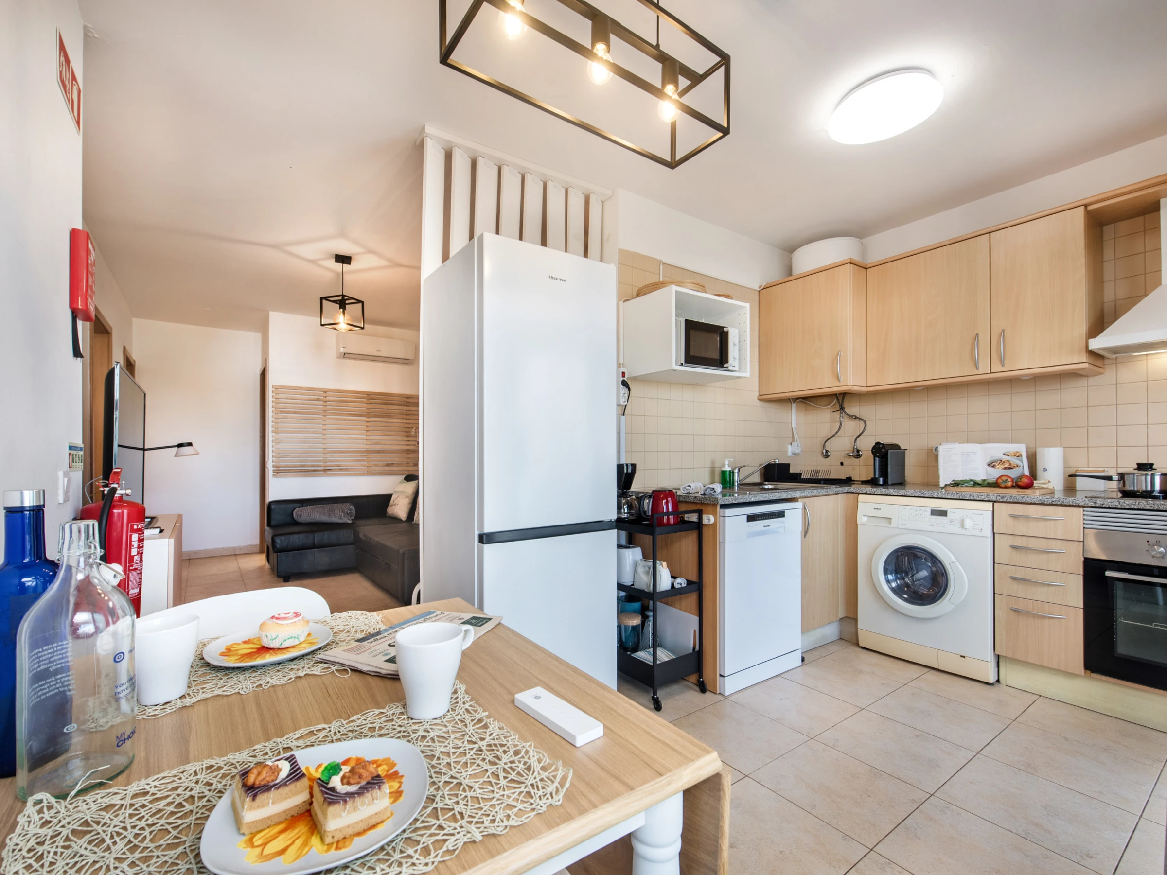 Dieses separate küche, mit ceranfeld, ist ausgestattet in kühlschrank, mikrowelle, backofen, gefrierschrank, spülmaschine, geschirr/besteck, kochutensilien, kaffeemaschine, toaster, wasserkocher, küchengeschirr, teller und schüsseln, herdplatte.