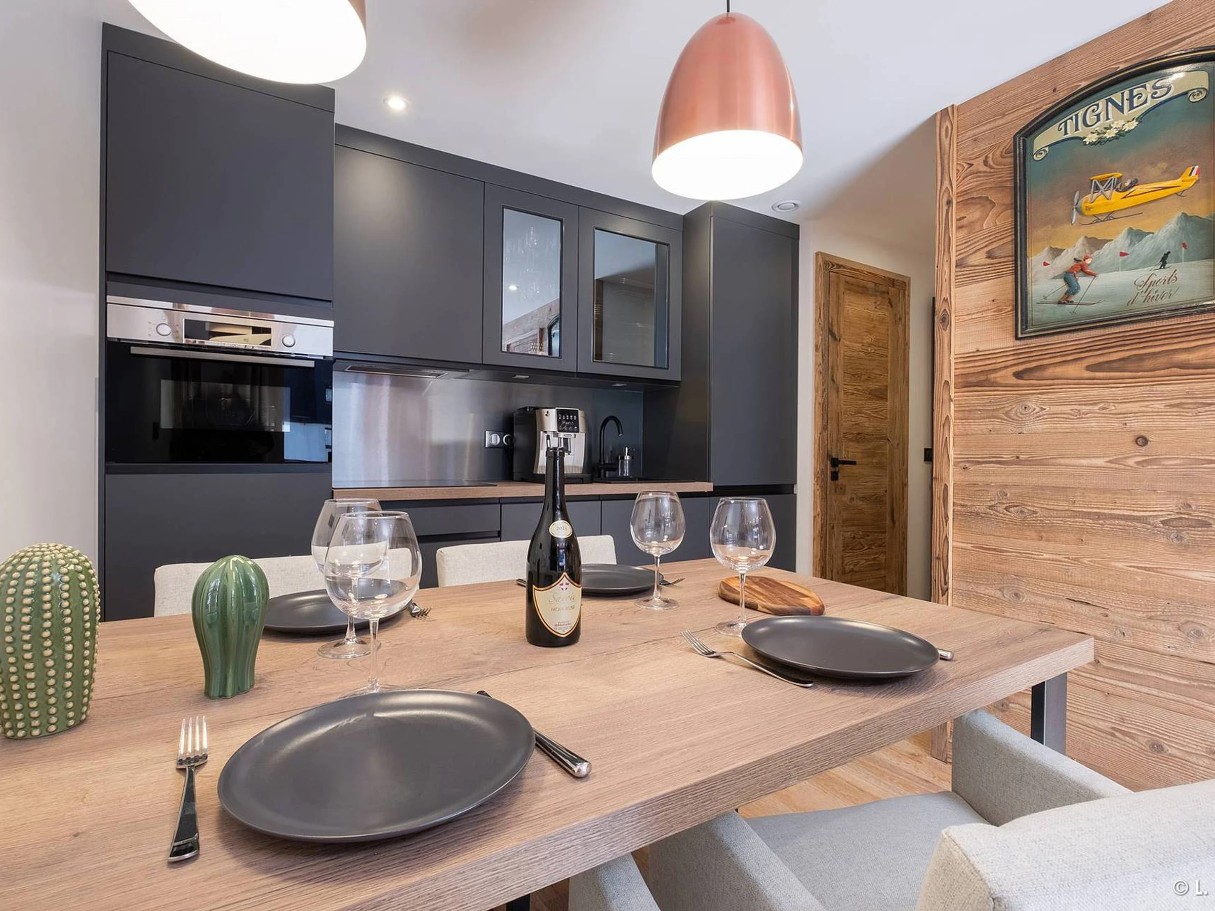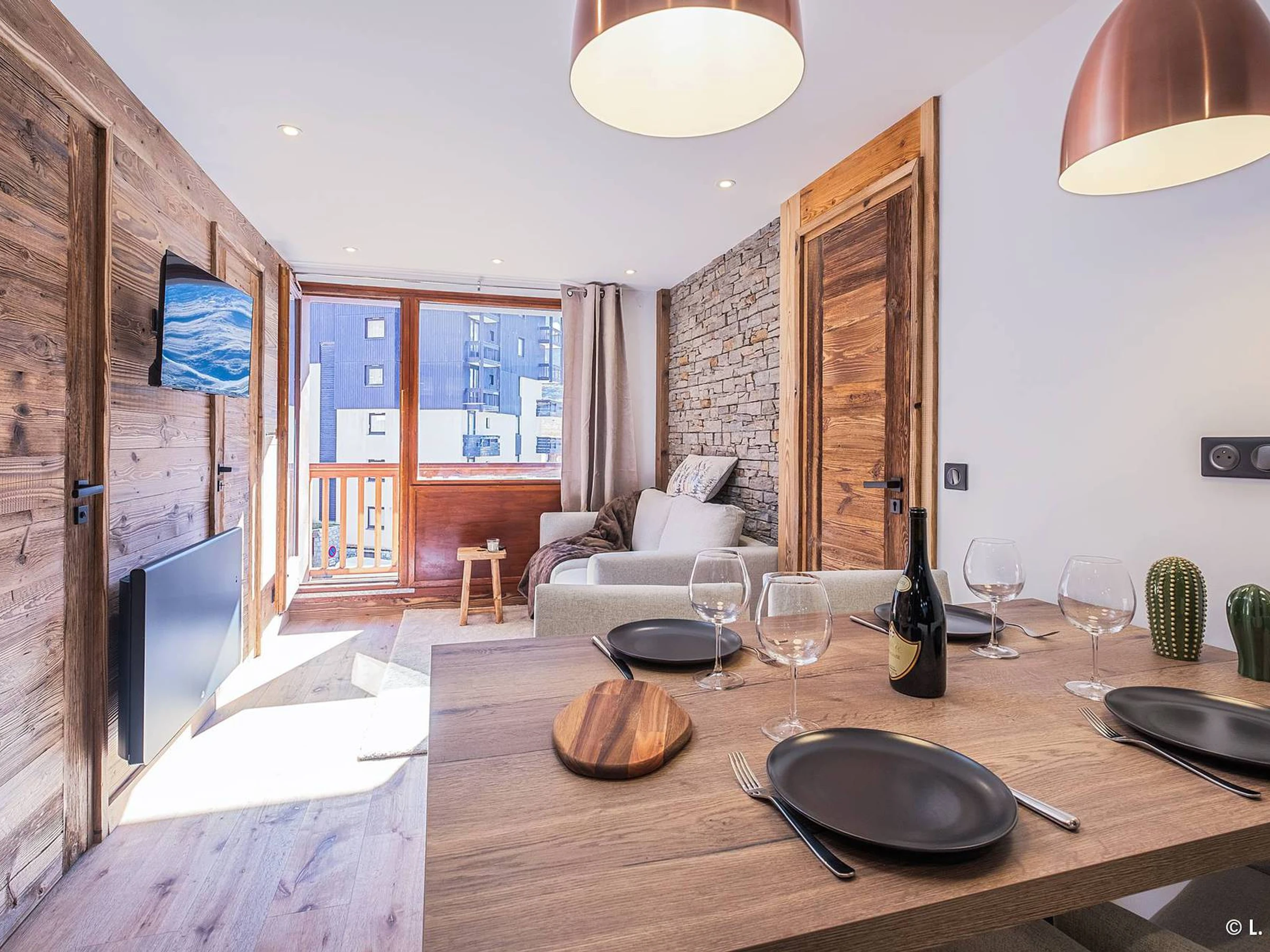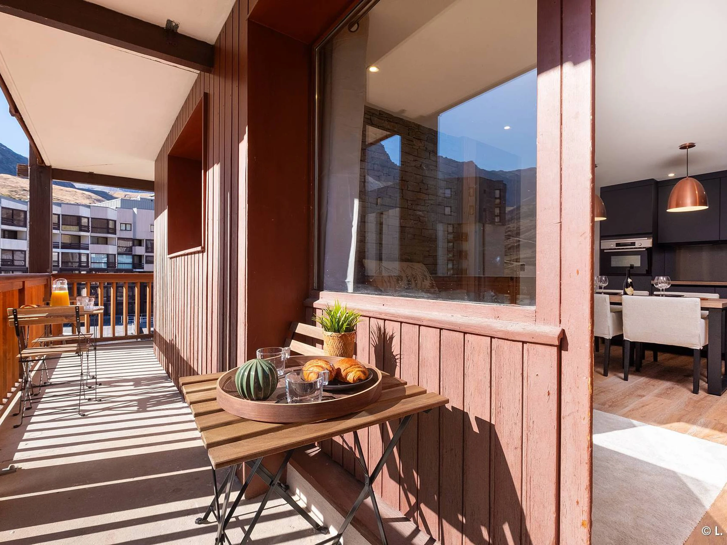 Renoviertes 2-Zimmer-Apartment (35 m²) für 4 Personen im 3. Stock (mit Aufzug) der Anlage „Hameau du Borsat I&II“ in Tignes Val Claret. Direkter Zugang zur Piste. Südlage mit Balkon.