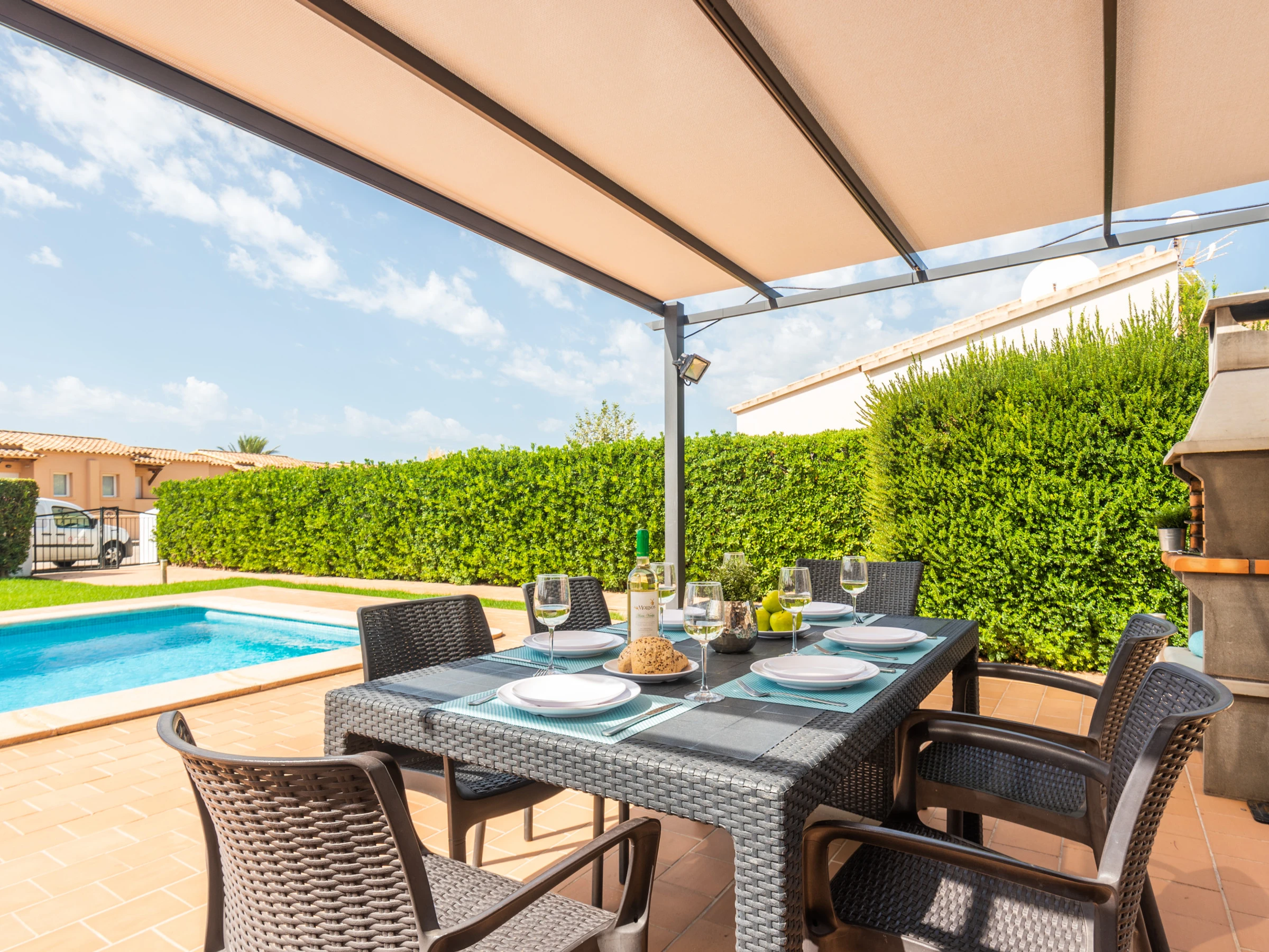 Terrasse mit Tisch und Stühlen. Privater Garten und privater Swimmingpool mit Außendusche mit 6 Sonnenliegen und gemauertem Grill.