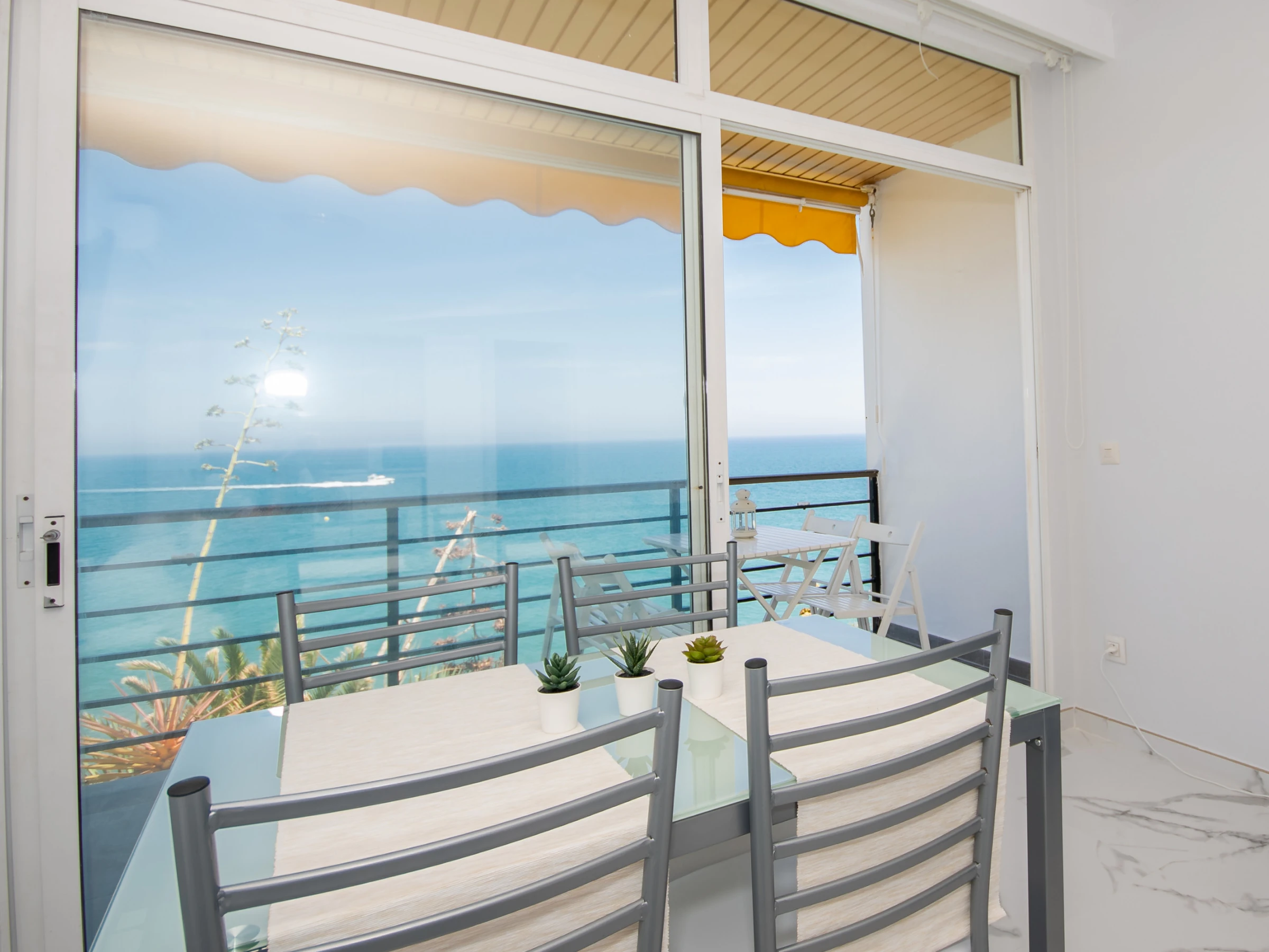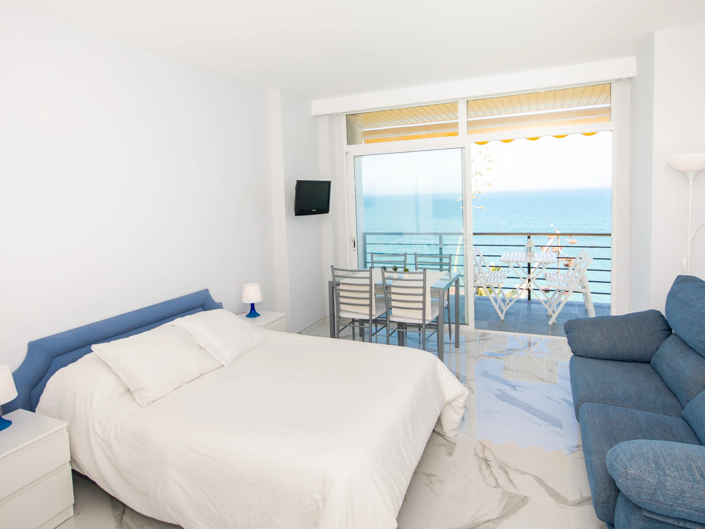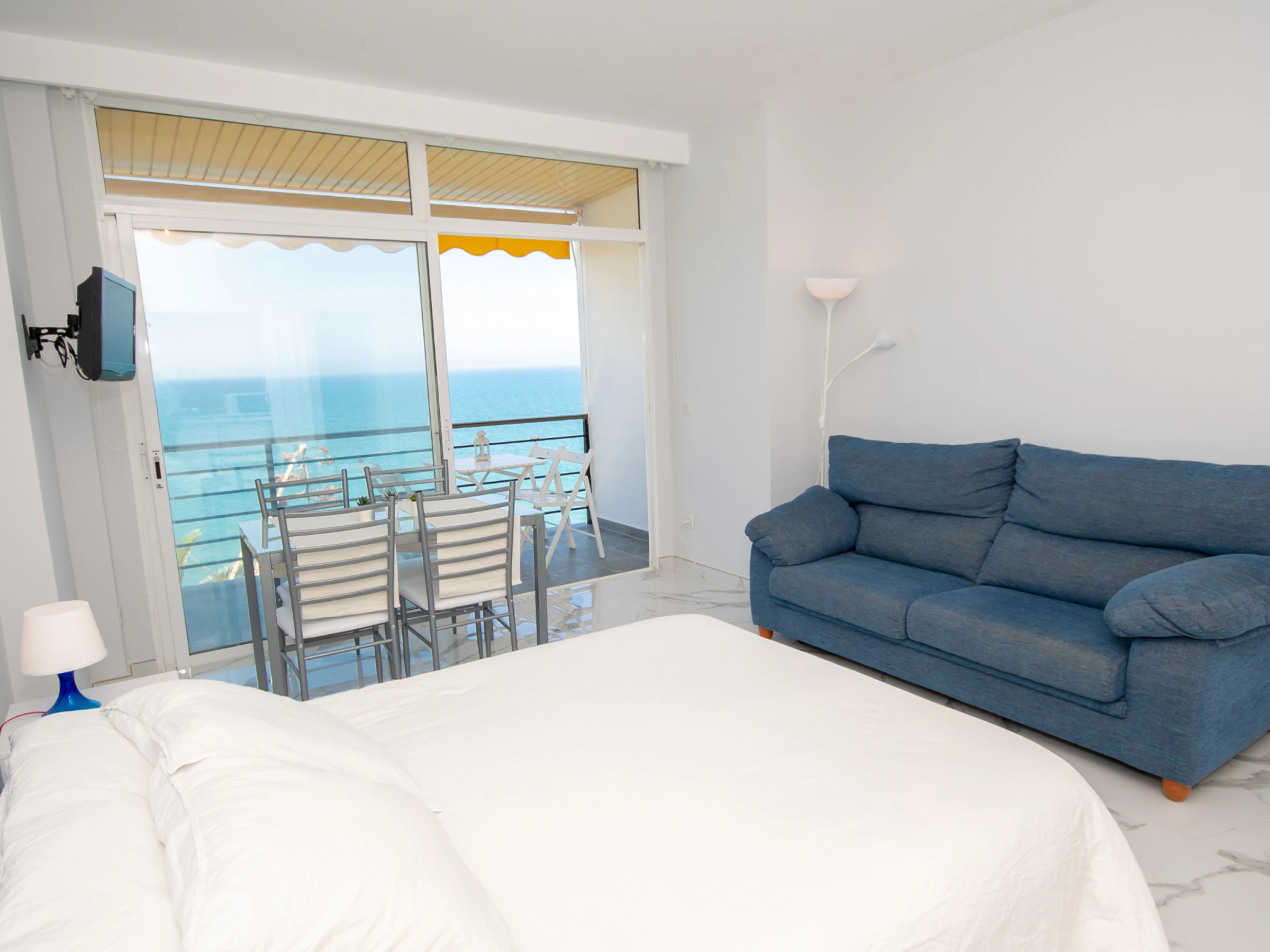 Das Studio, renoviert im Frühjahr 2019, zeichnet sich durch seine unglaublichen Meerblicke vom privaten Balkon und der 10 Quadratmeter großen Terrasse aus, wo Sie ein spektakuläres 180-Grad-Panorama und die wunderschönen Sonnenaufgänge der Costa del Sol genießen können. Das Wohn-Esszimmer umfasst ein Doppelbett, Tisch und Stuhl sowie eine funktionale Küche, die hinter Schiebetüren verborgen ist und mit einer Glaskeramikkochplatte ausgestattet ist, um Ihre Mahlzeiten bequem zuzubereiten.