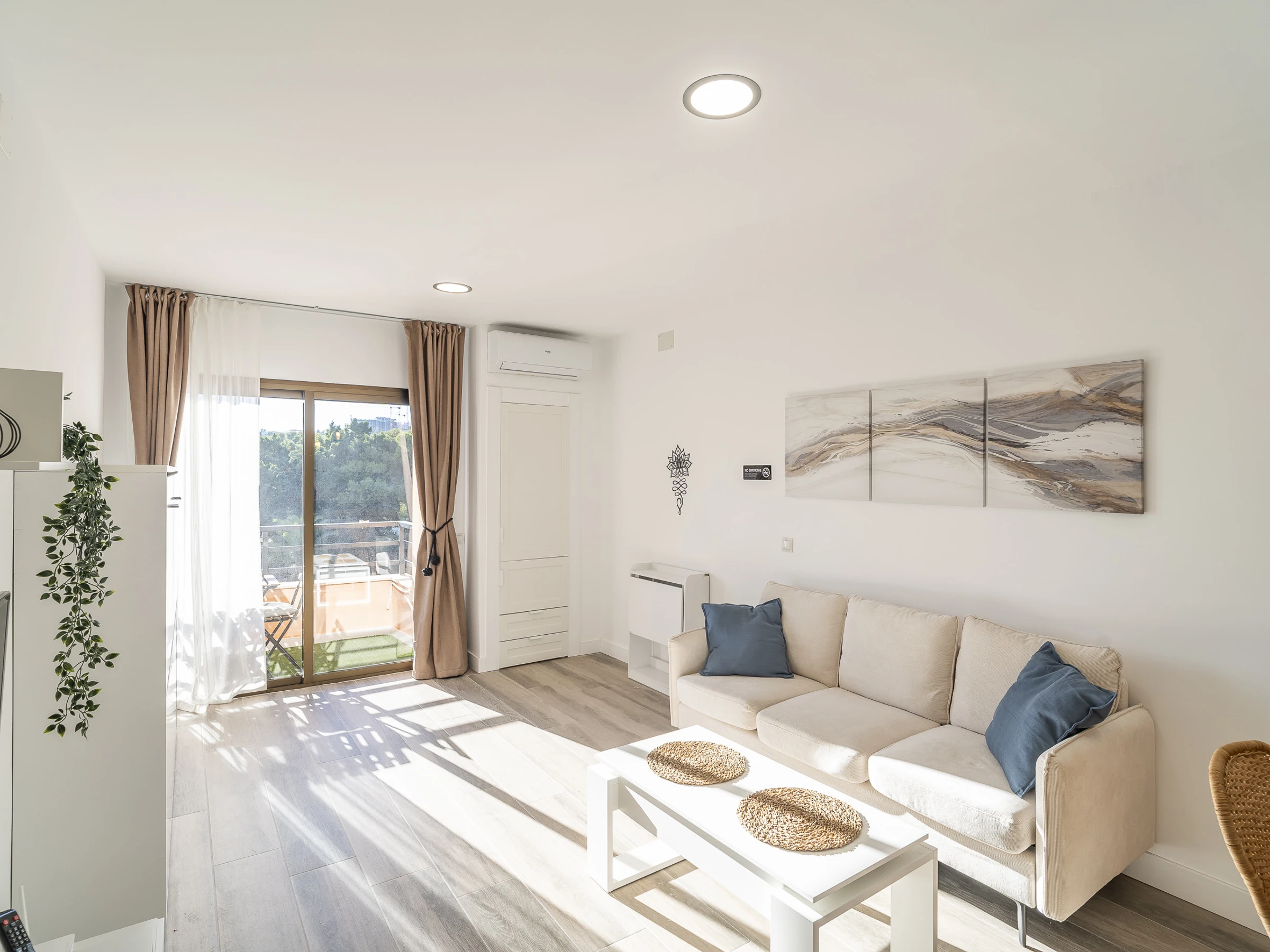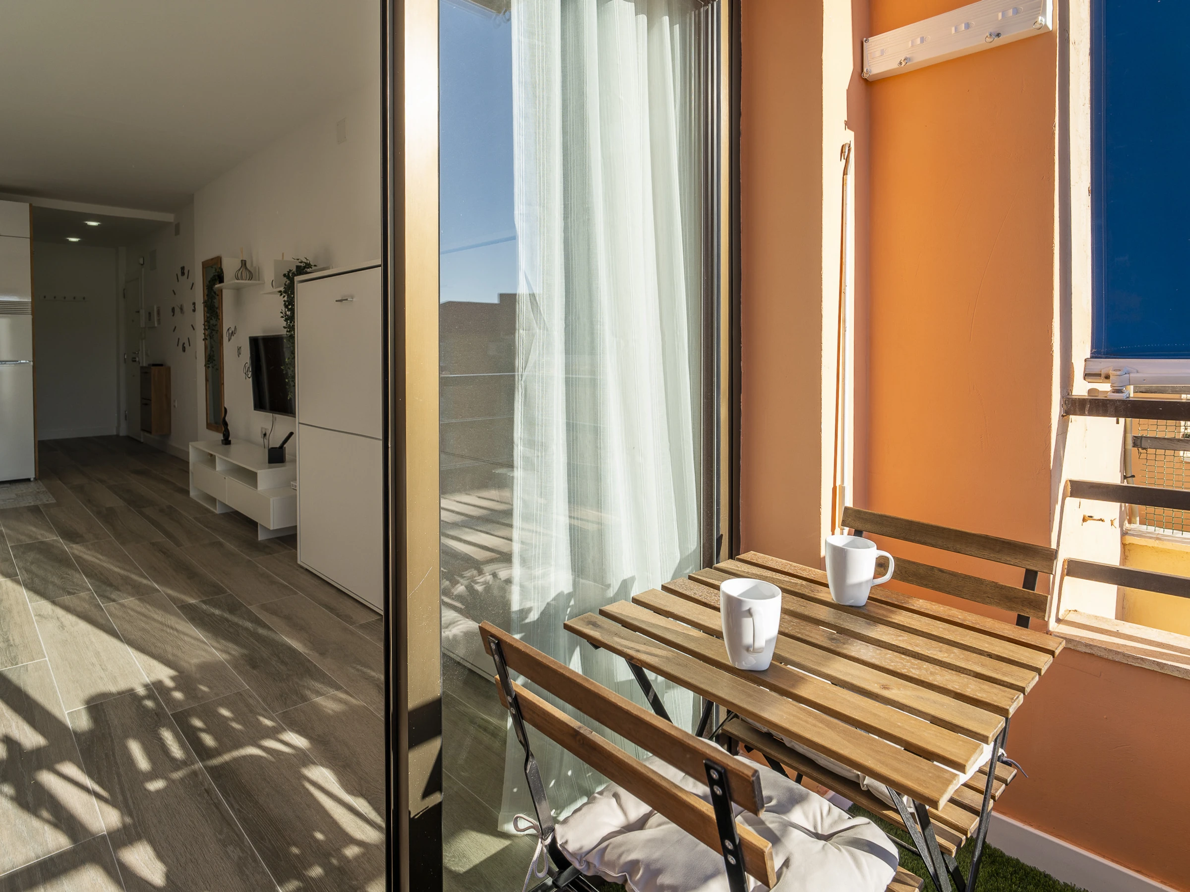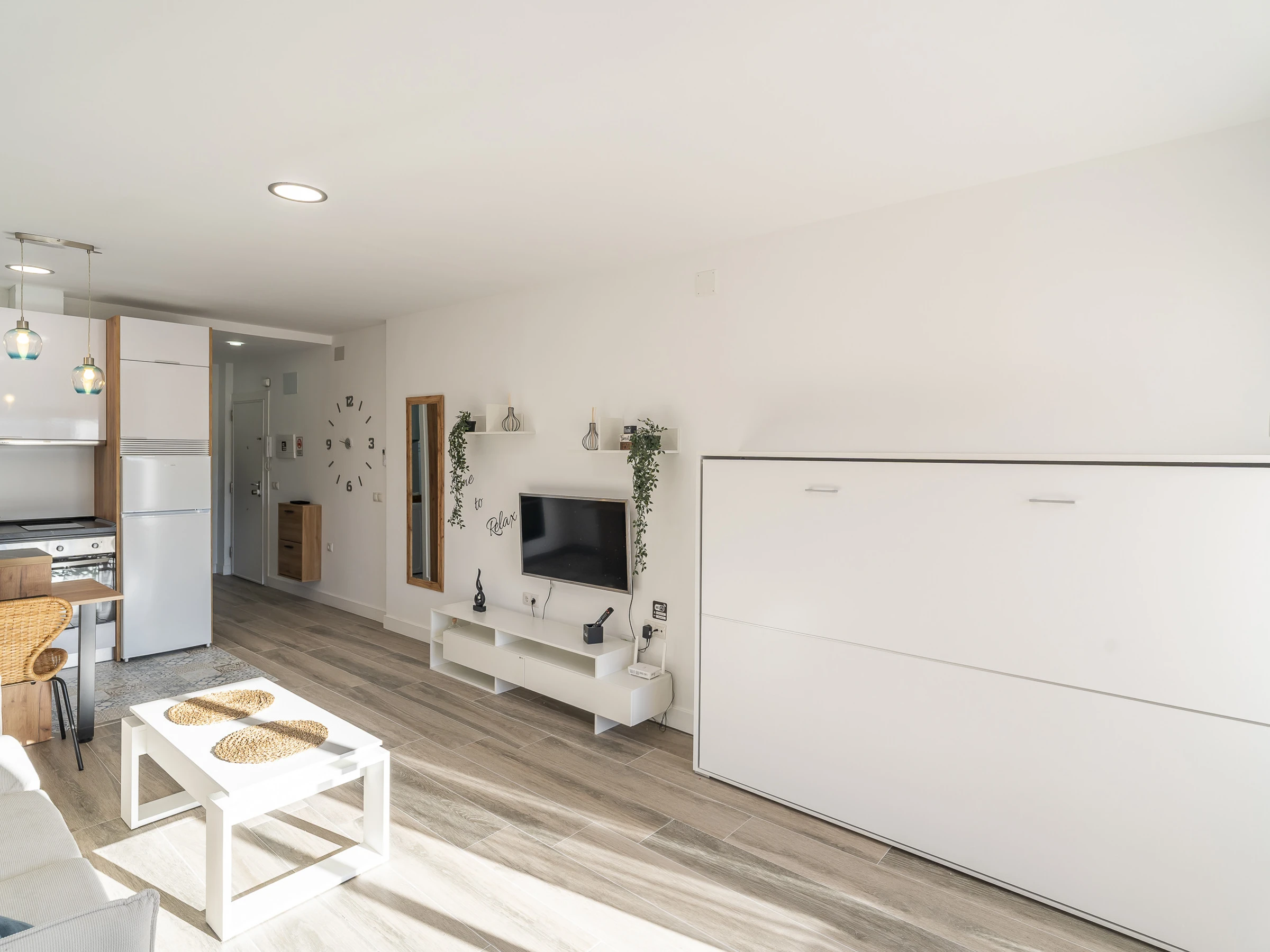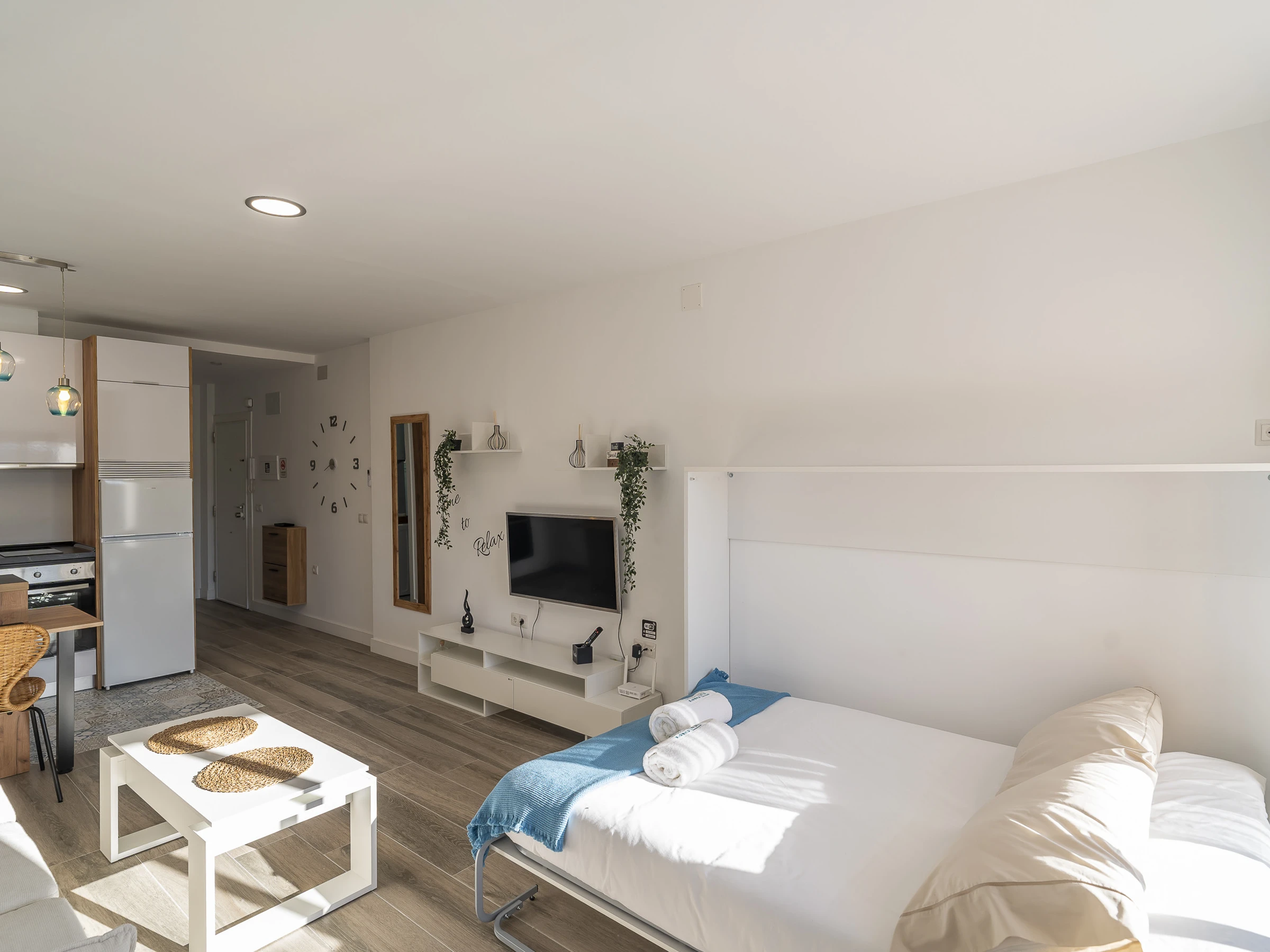 Moderne Studiowohnung mit Terrasse, Bergblick und zentraler Lage in Torremolinos, ideal für Paare, die Komfort, gute Anbindung und Strandnähe an der Costa del Sol suchen.