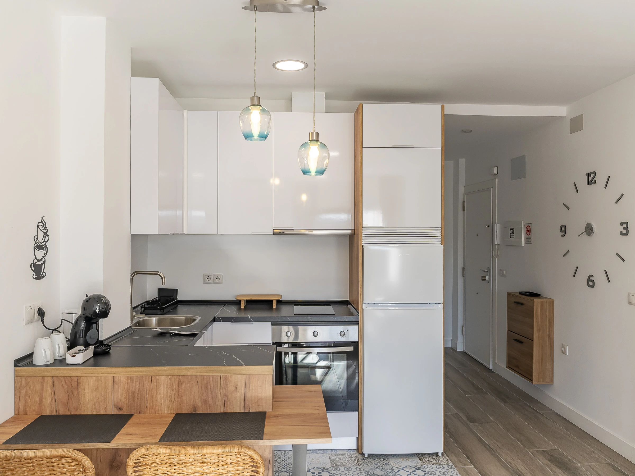 Die Studie bietet eine gemütliche Terrasse, Klimaanlage, Heizung, Smart-TV, WLAN und Waschmaschine und garantiert einen komfortablen Aufenthalt sowohl bei kurzen als auch bei längeren Reisen. Die Induktionsküche ist mit allem Notwendigen ausgestattet: Kühlschrank, Mikrowelle, Backofen, Kaffeemaschine, Toaster und komplettes Geschirr, um Ihre Mahlzeiten zuzubereiten.