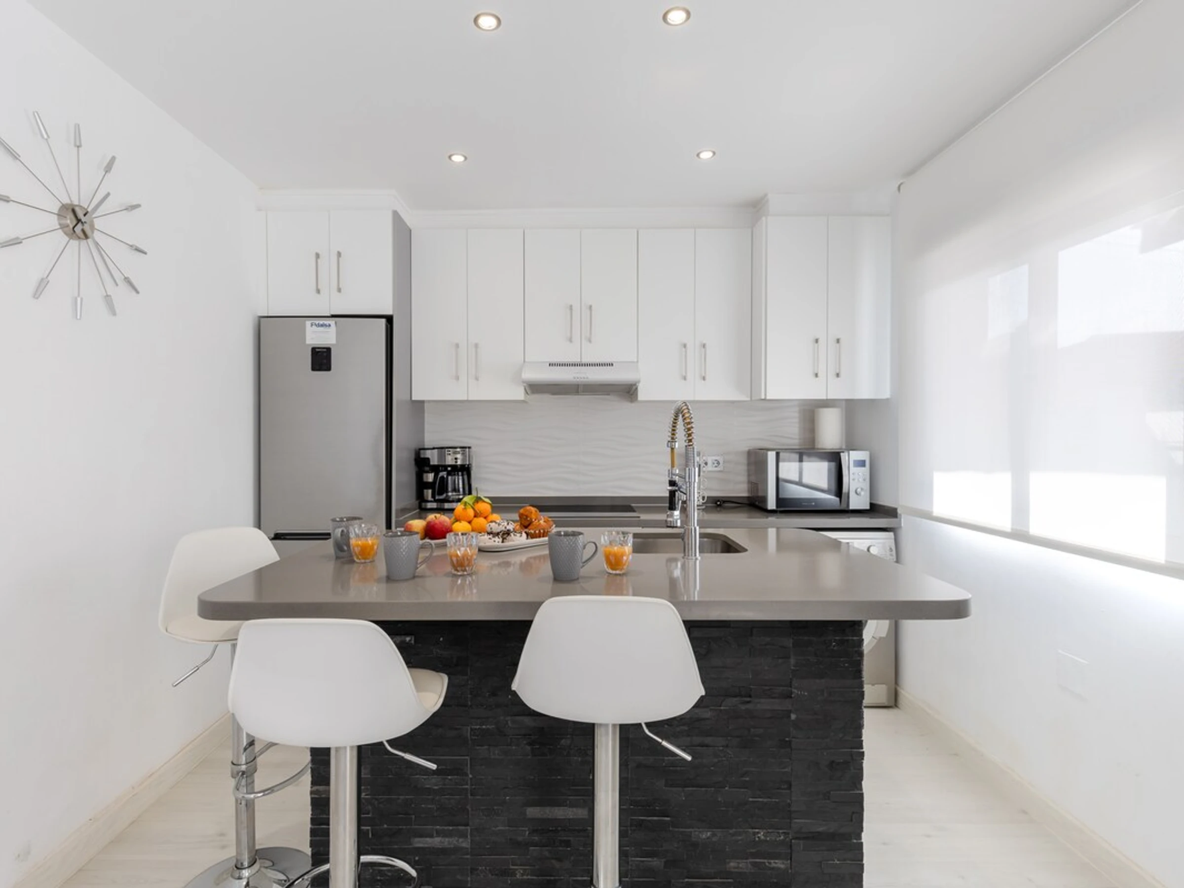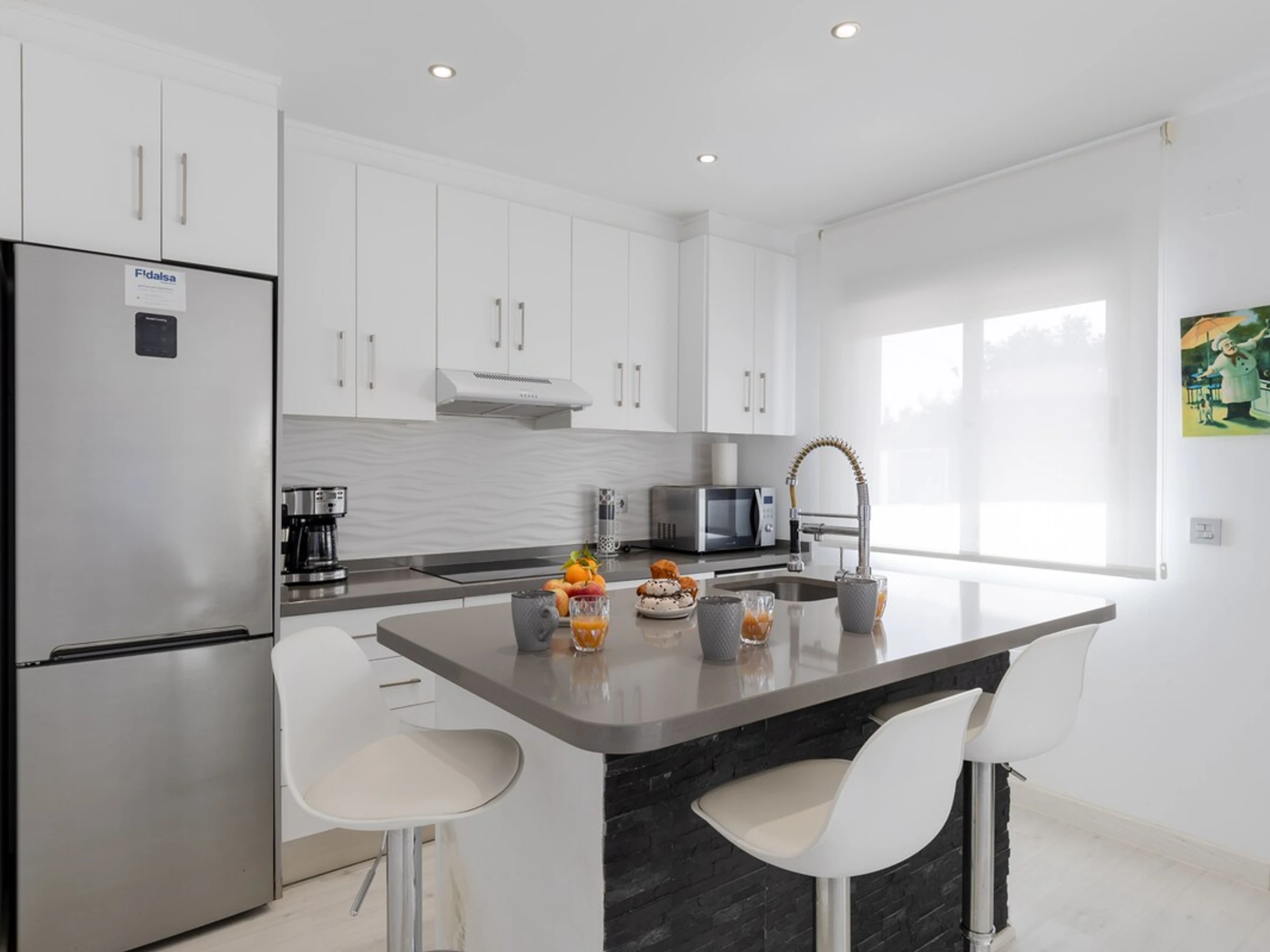 Dieses küche, ist ausgestattet in kühlschrank, mikrowelle, backofen, gefrierschrank, spülmaschine, kaffeemaschine und toaster.