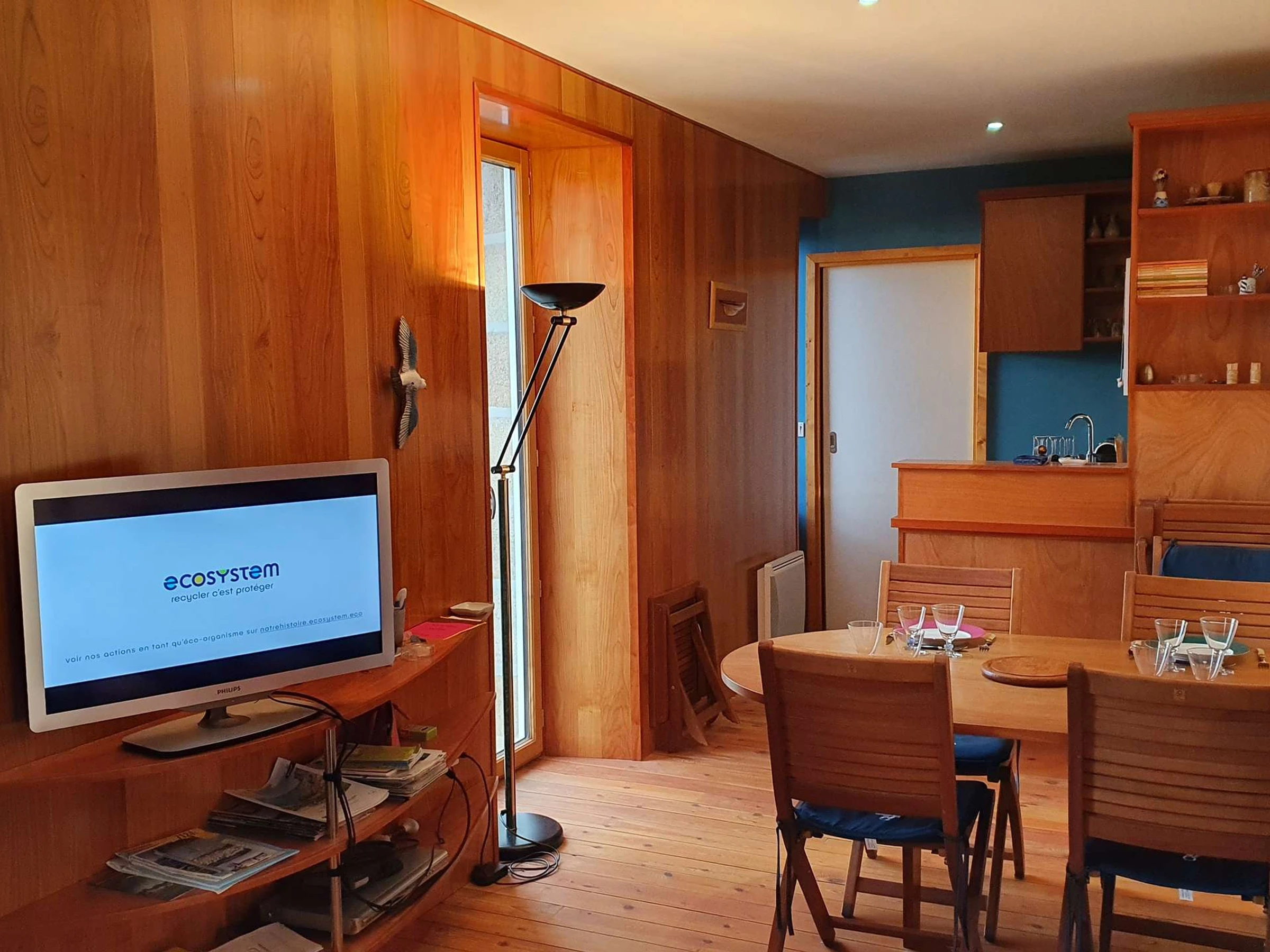 Der Wohnbereich umfasst eine Arbeitsecke mit Glasfaser-Internetanschluss, zwei Sessel, einen Fernseher mit Streaming-Diensten und Orange Replay, einen Essbereich sowie eine offene Küche mit Herd, Mikrowelle mit Grillfunktion, Geschirrspüler, Nespresso-Maschine, Toaster, Wasserkocher, Geschirr, Besteck und Kochutensilien.