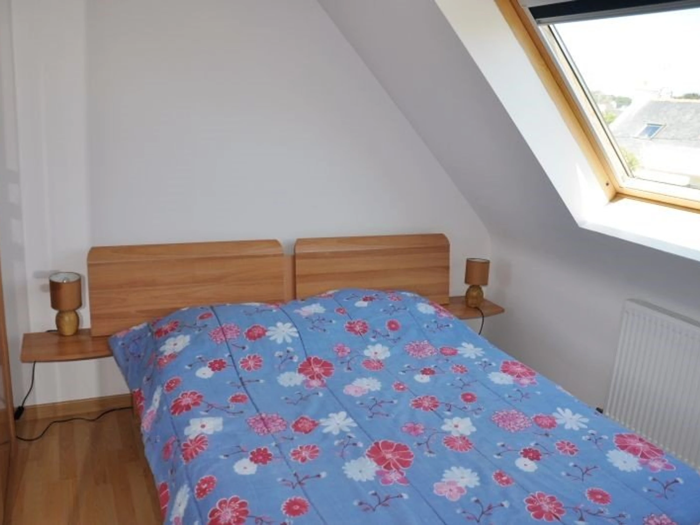 1 Schlafzimmer mit einem Doppelbett für 2 Personen und 1 Einzelbett mit Bettdecken -