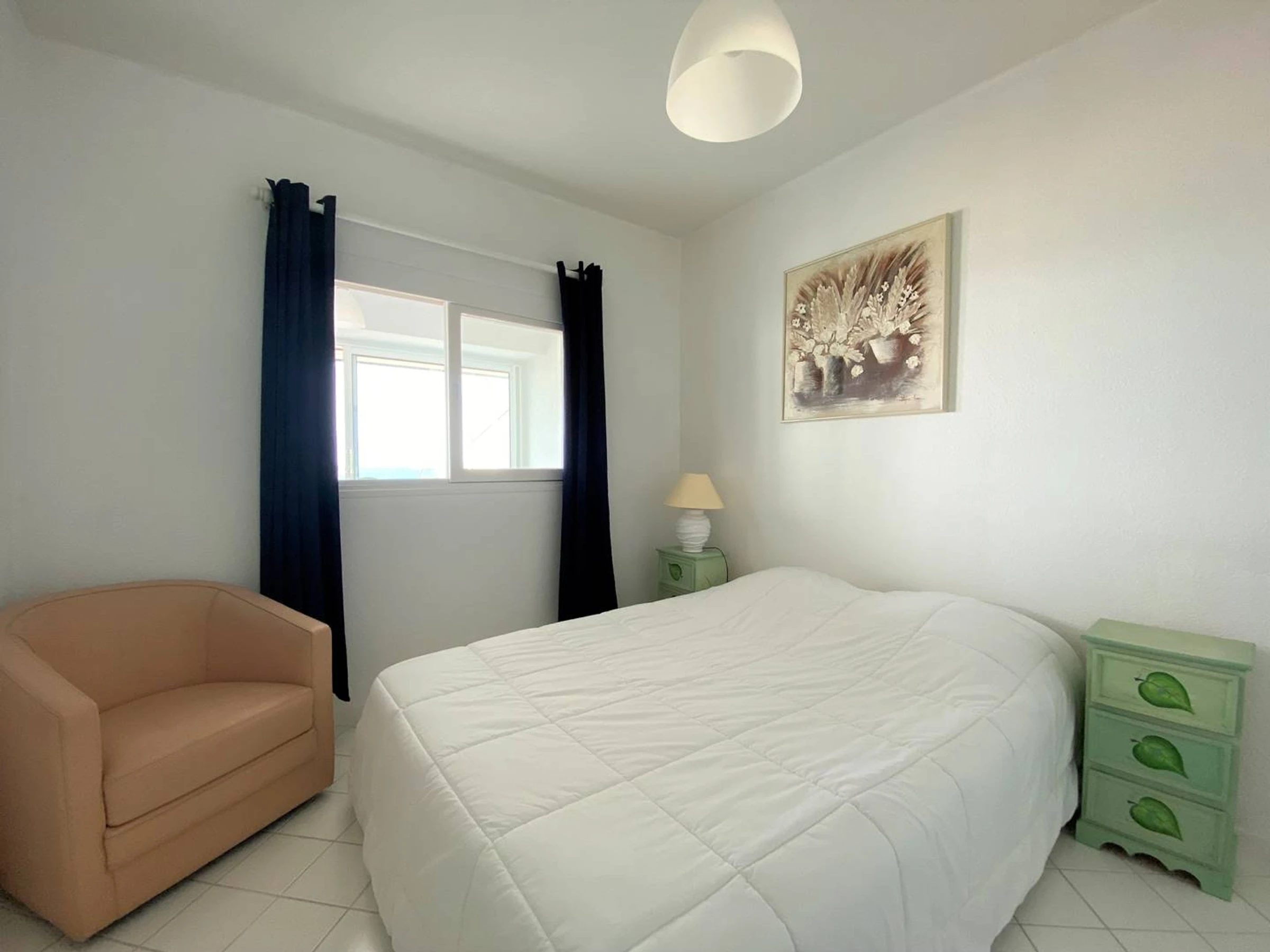 1 Schlafzimmer mit Doppelbett für 2 Personen mit Bettdecke, Meerblick und Blick auf das Wohnzimmer -
