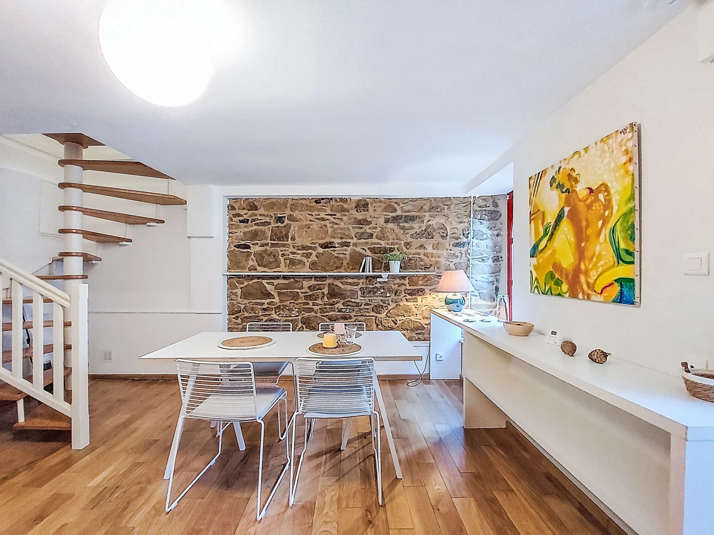 Kleines Reihenhaus "Arbenn 2", auf 2 Stockwerken. Im Ortszentrum von Treguier, im Herzen der Stadt, verkehrsberuhigte Zone, 7 km vom Meer, 7 km vom Strand. Zur Alleinbenutzung: Hof, öffentliche Parkplätze auf der Strasse. Lebensmittelgeschäft, Restaurant, Bäckerei 200 m, Zentrum zu Fuss in 1 Minuten erreichbar, Bushaltestelle 500 m, Sandstrand "Plougrescant" 9 km. Golfplatz (19 Loch) 40 km, Wanderwege ab Haus 100 m. Nahe gelegene Sehenswürdigkeiten: Cathédrale Saint-Yves 250 m, centre-ville historique 100 m, Paimpol 15 km, Ile de Bréhat 20 km, Perros-Guirec 21 km, Plougrescant 7 km.