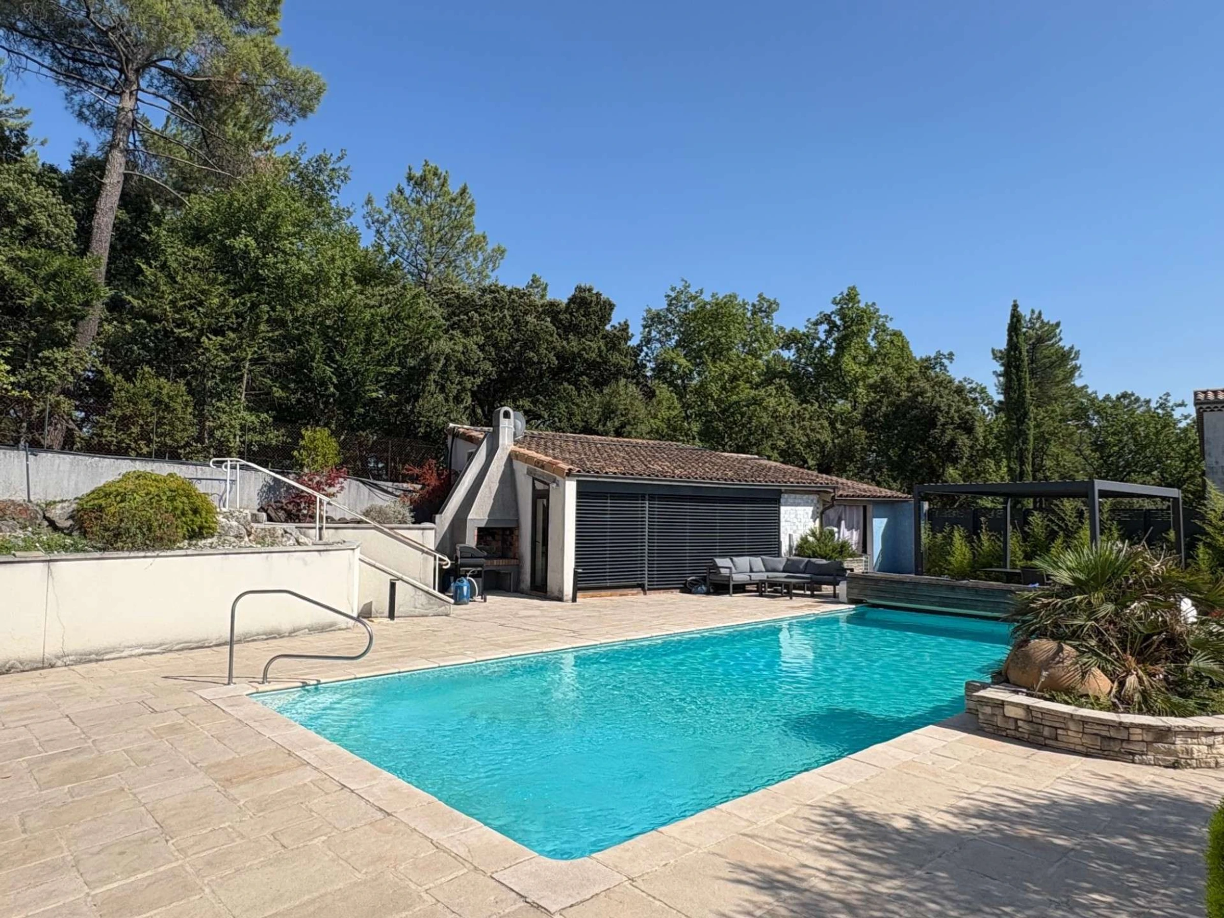 Genießen Sie den privaten, beheizten Pool mit Poolhaus, ausgestattet mit Sommerküche, Lounge und idyllischer, grüner Umgebung.
