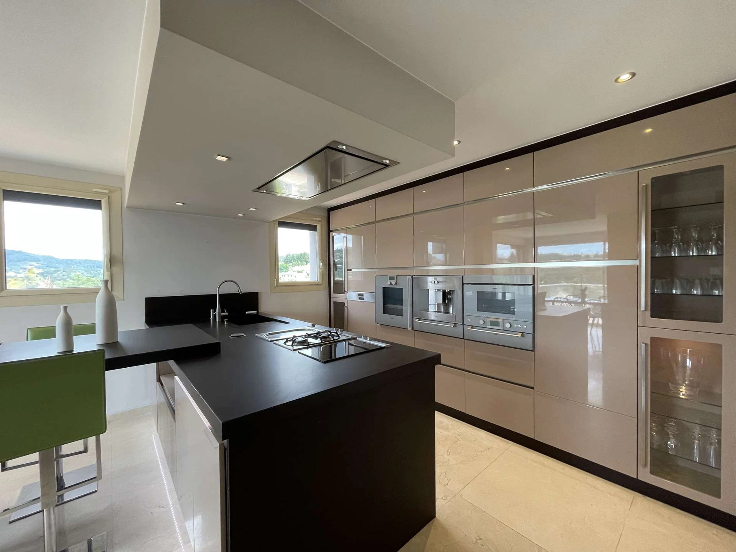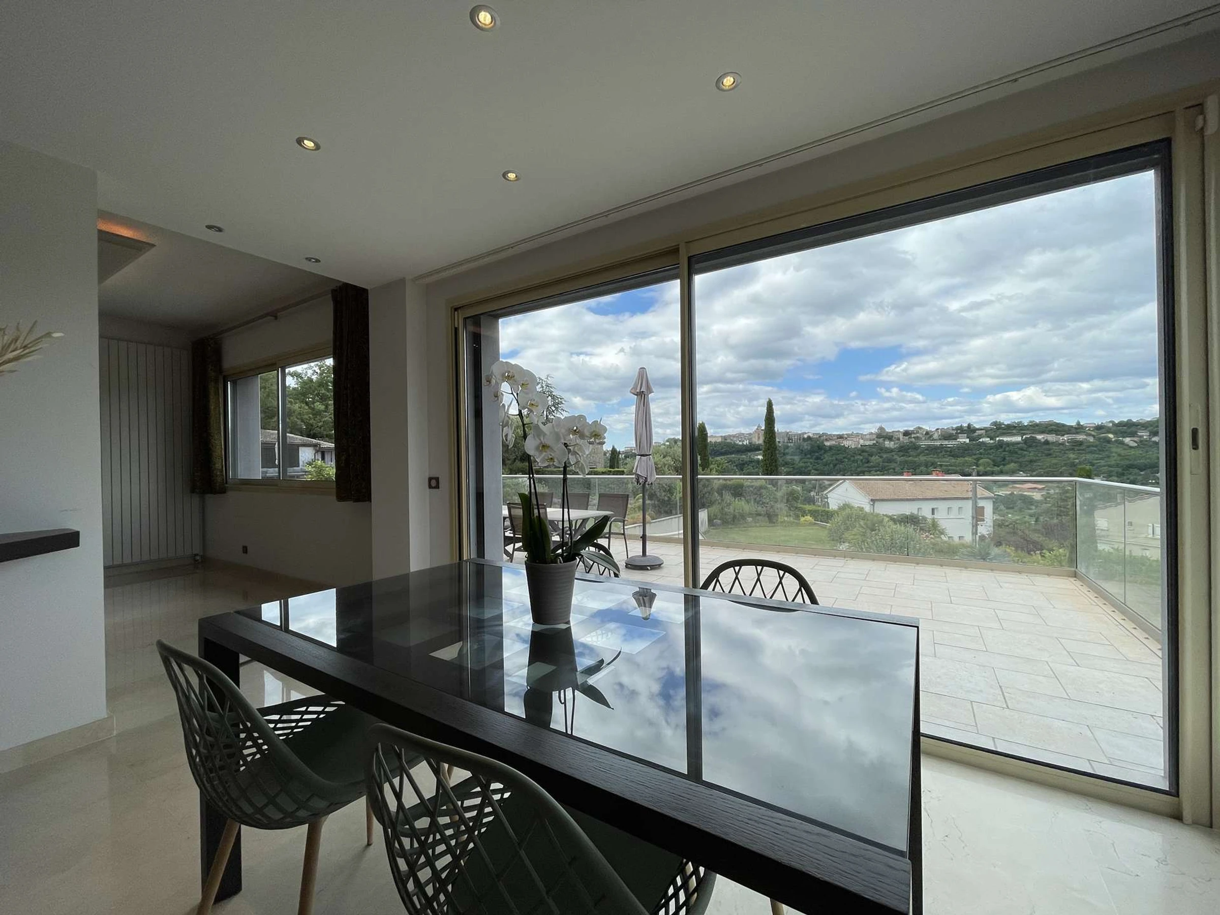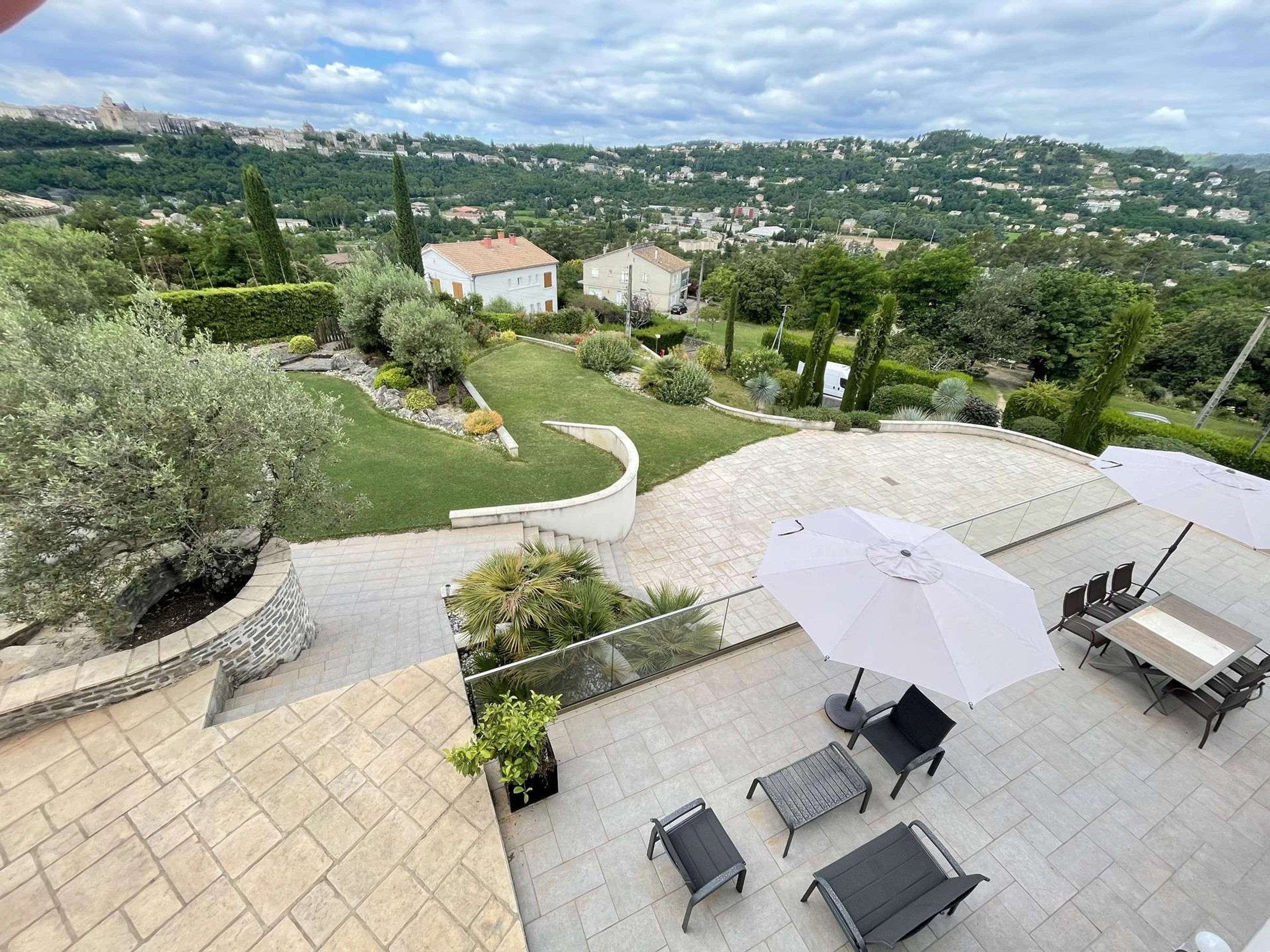 Im Erdgeschoss befinden sich ein großzügiger Wohnbereich, eine voll ausgestattete Küche, ein Esszimmer und eine Terrasse mit atemberaubendem Blick auf das Schloss Aubenas.