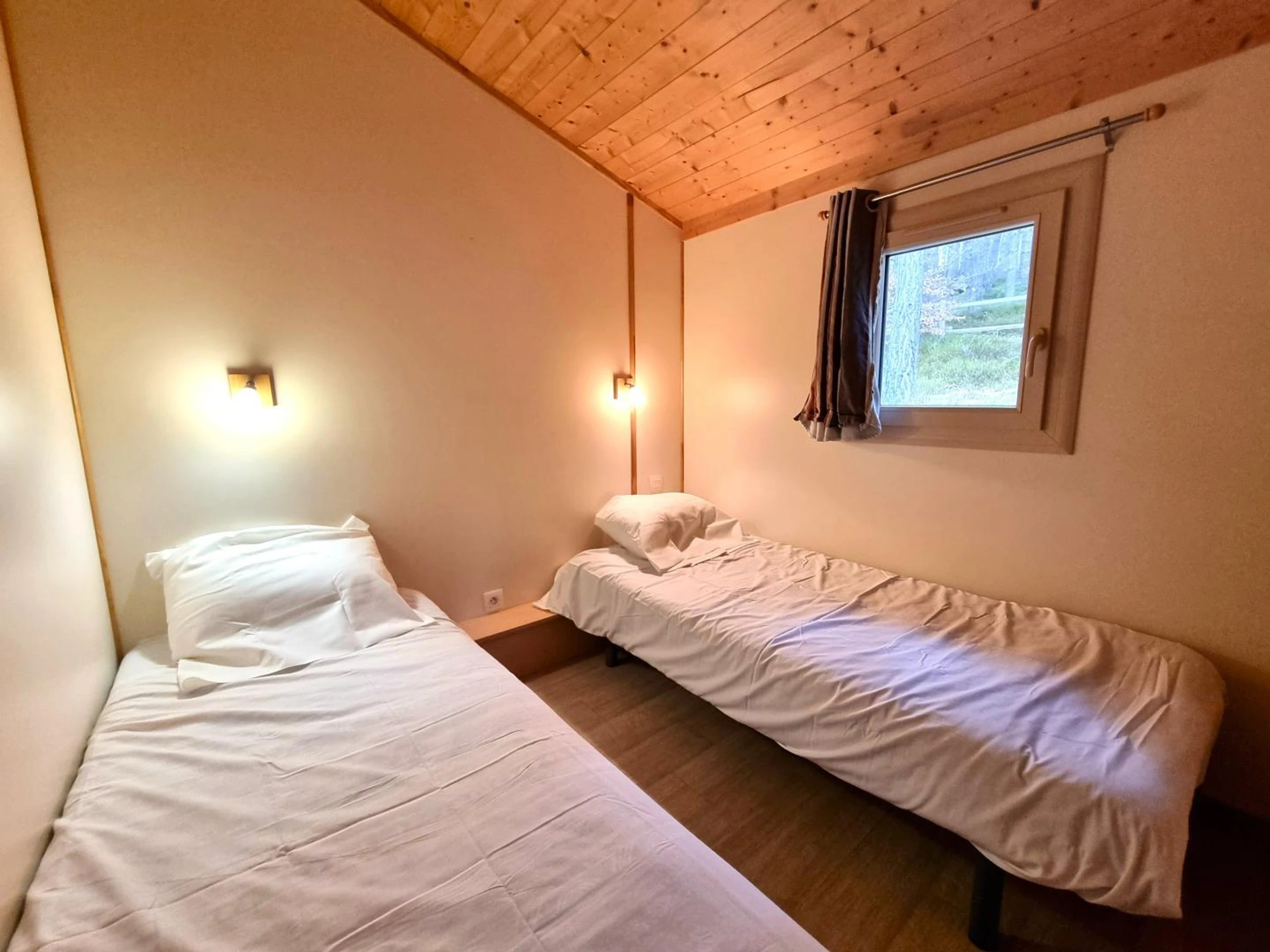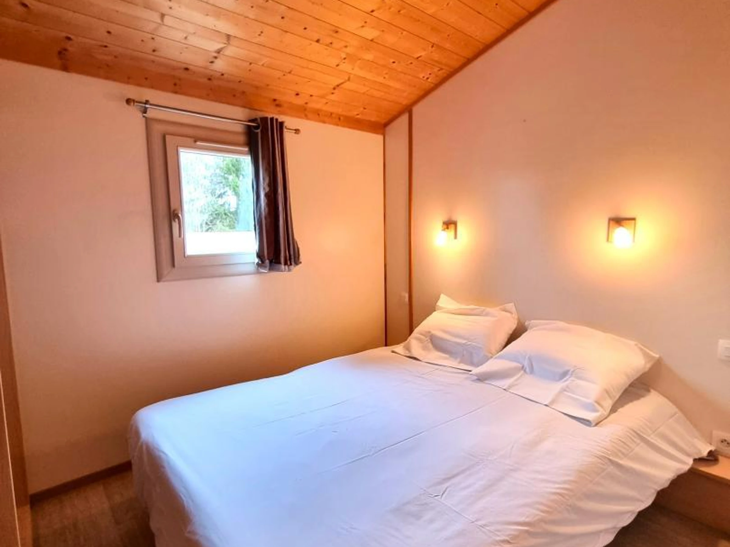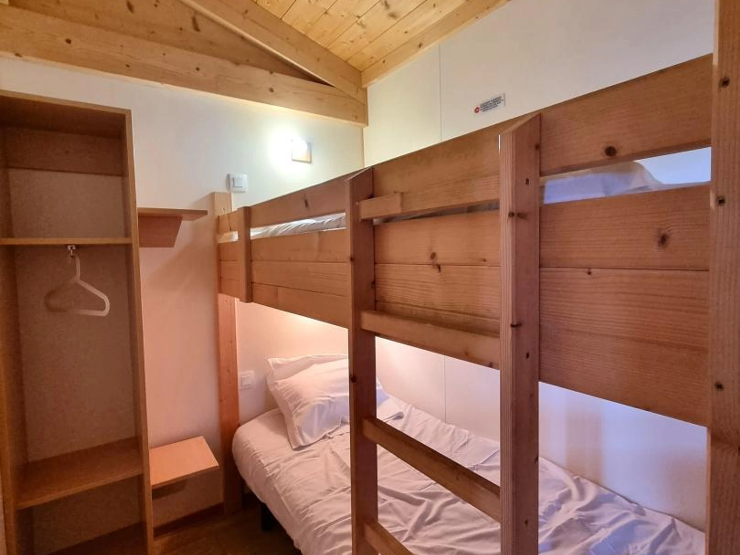 Dieses 35 m² große Chalet „Bouleau“ bietet eine funktionale und optimale Raumaufteilung für bis zu 6 Personen. Es verfügt über drei Schlafzimmer: eines mit einem Doppelbett (140 x 190 cm), das zweite mit zwei Einzelbetten (80 x 190 cm) und das dritte mit zwei Etagenbetten (80 x 190 cm), ideal für Kinder.
