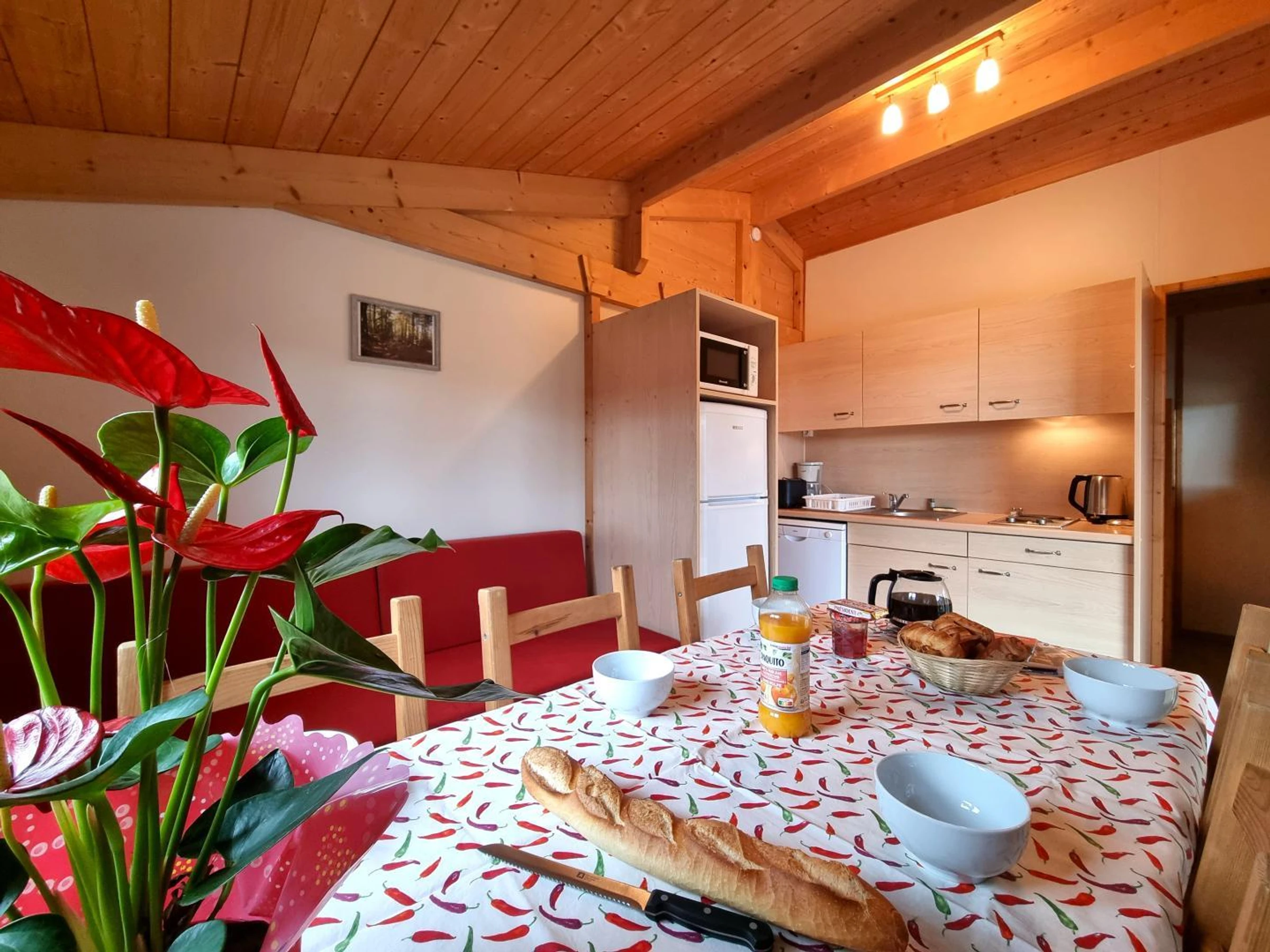 Der Wohnbereich umfasst einen Essbereich mit einem Tisch für sechs Personen und eine voll ausgestattete Küche.