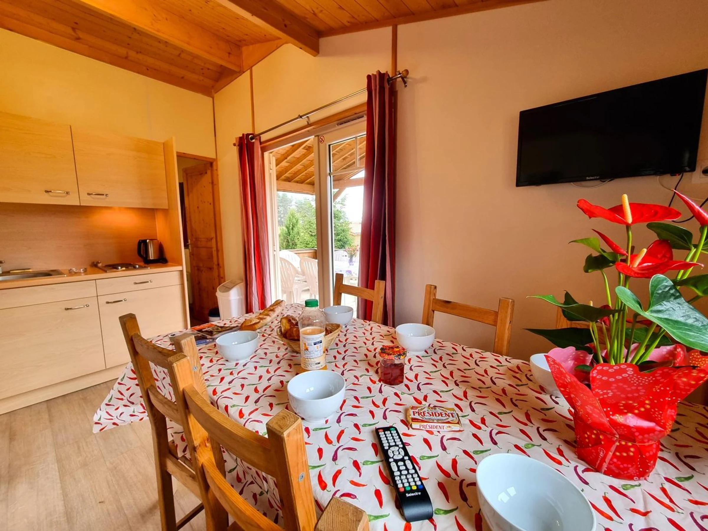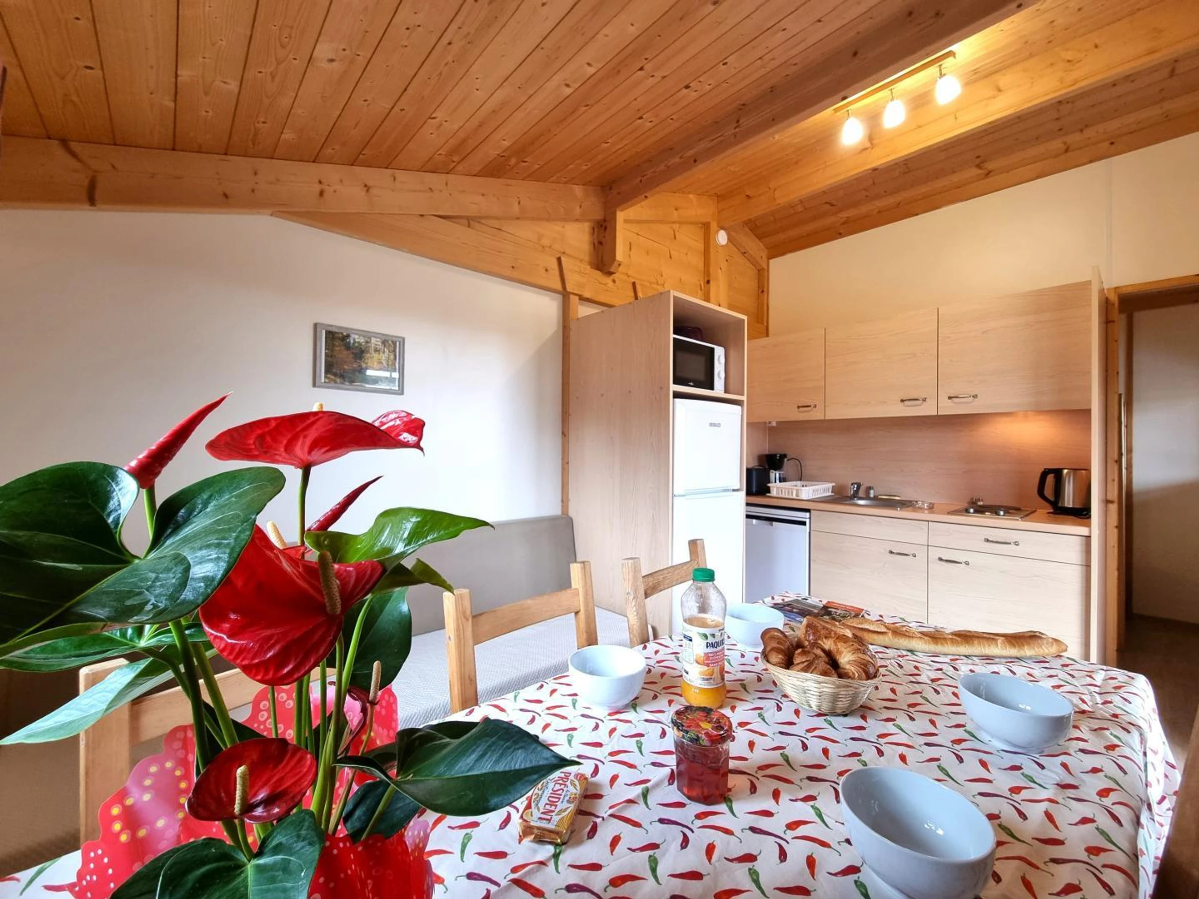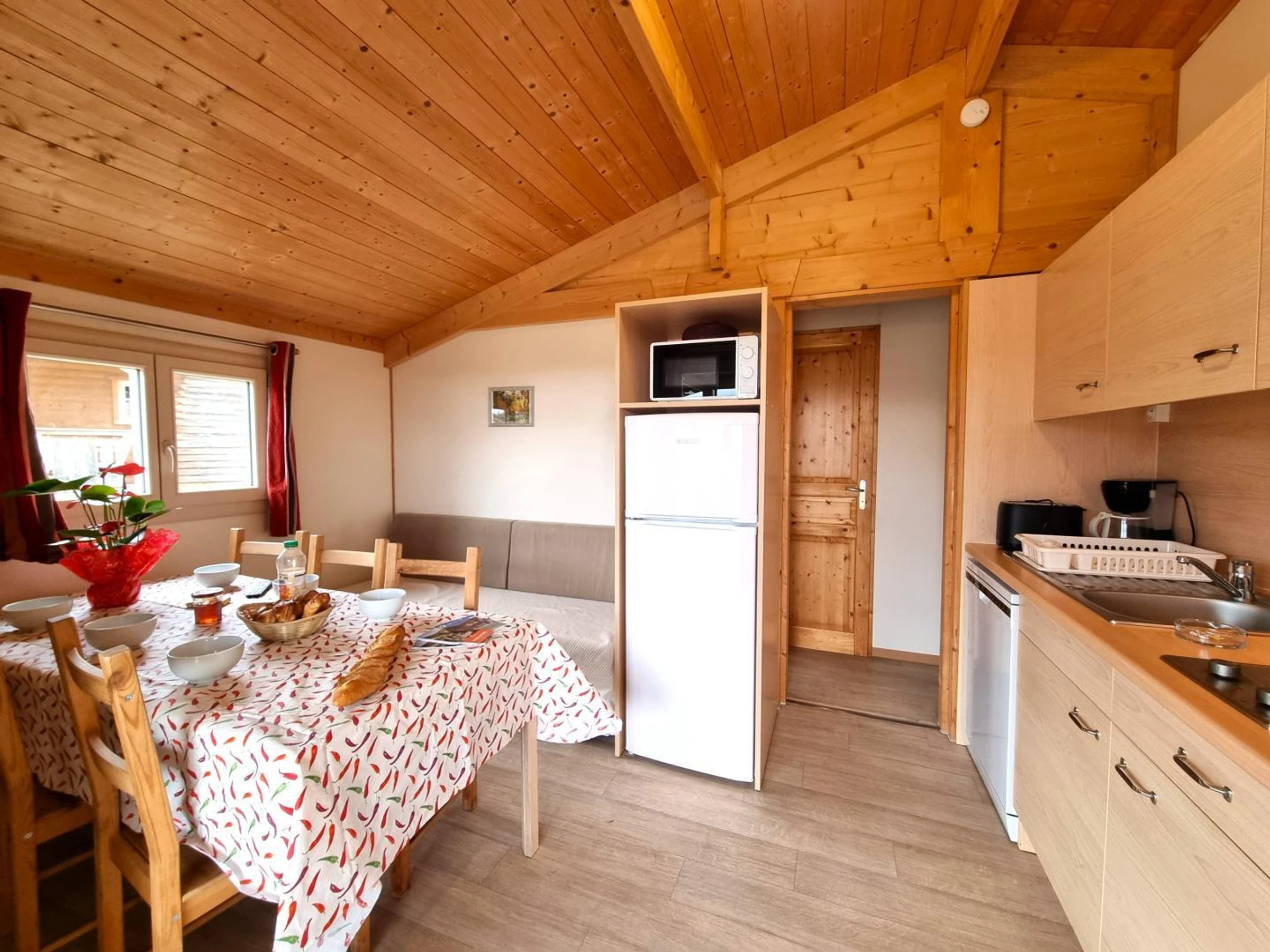 Der Wohnbereich umfasst einen Essbereich mit einem Tisch für sechs Personen und eine voll ausgestattete Küche.