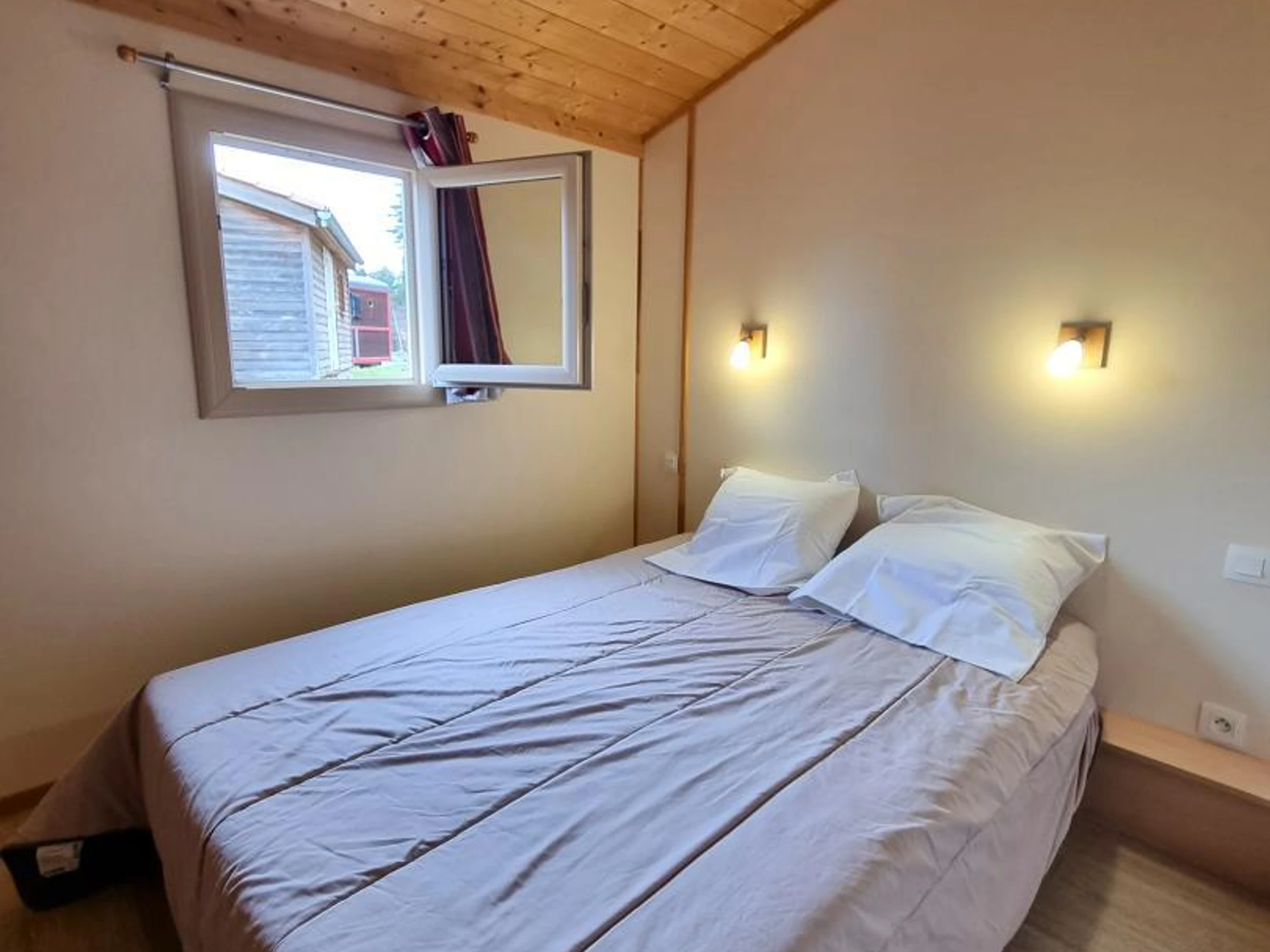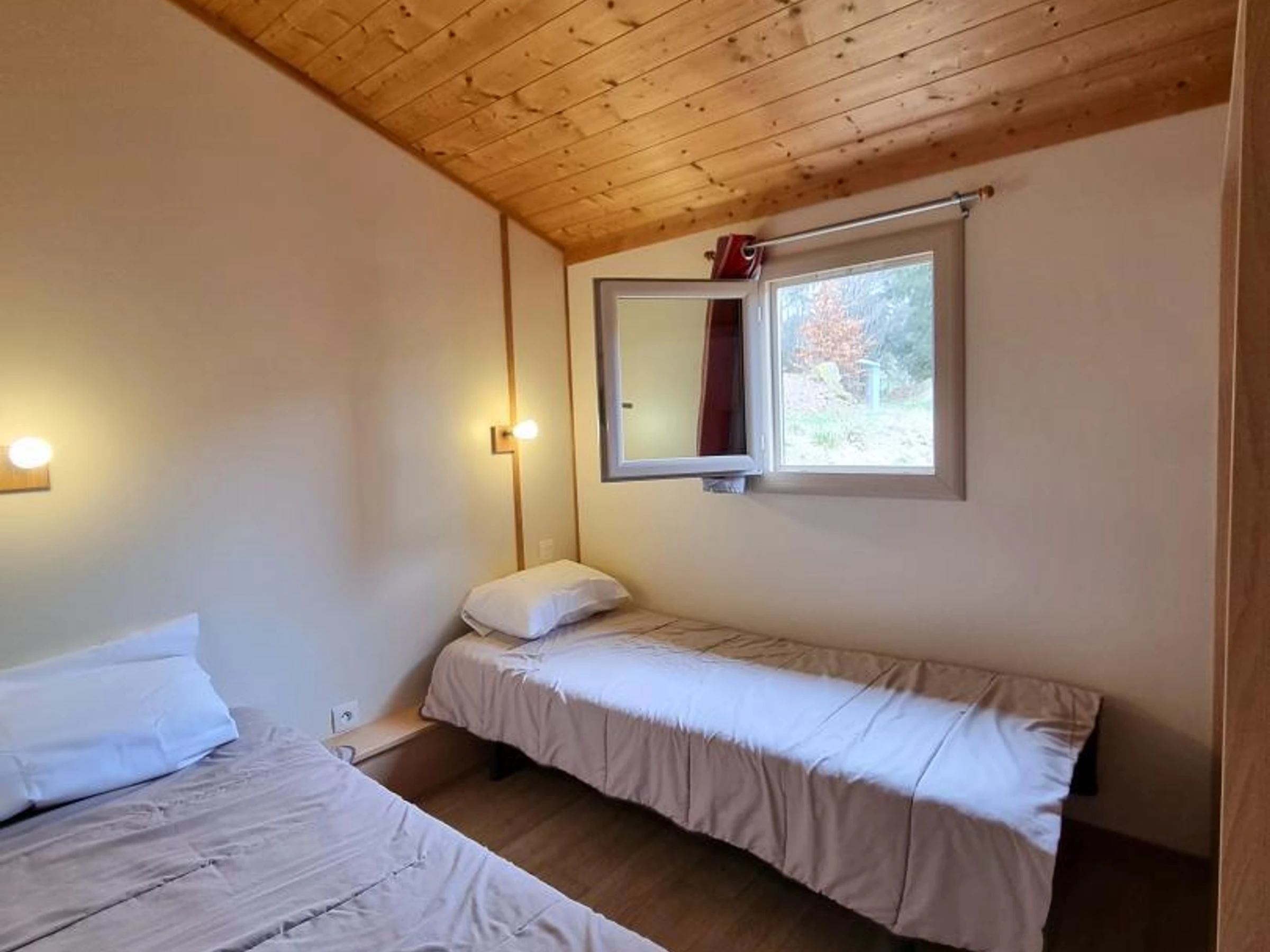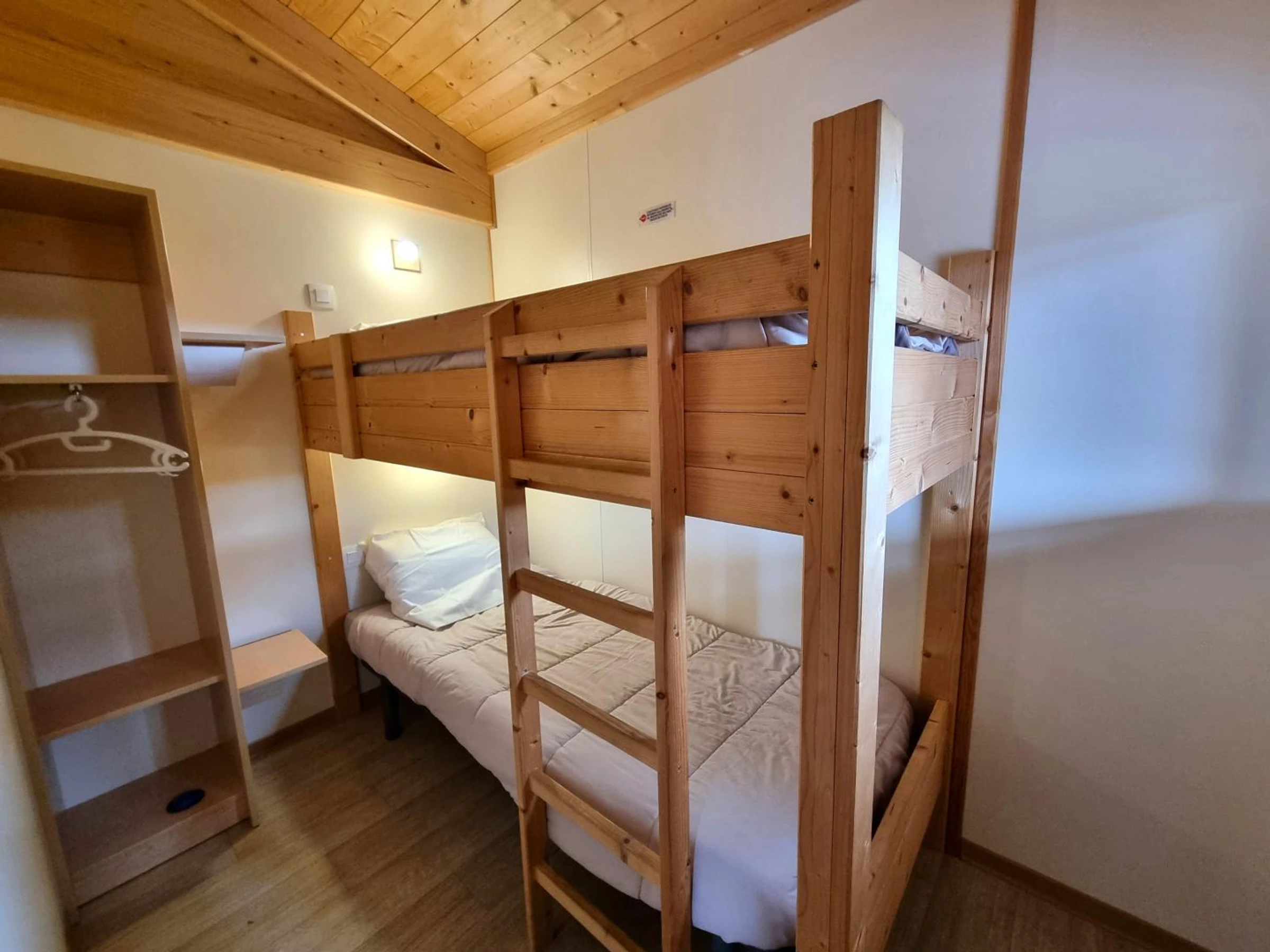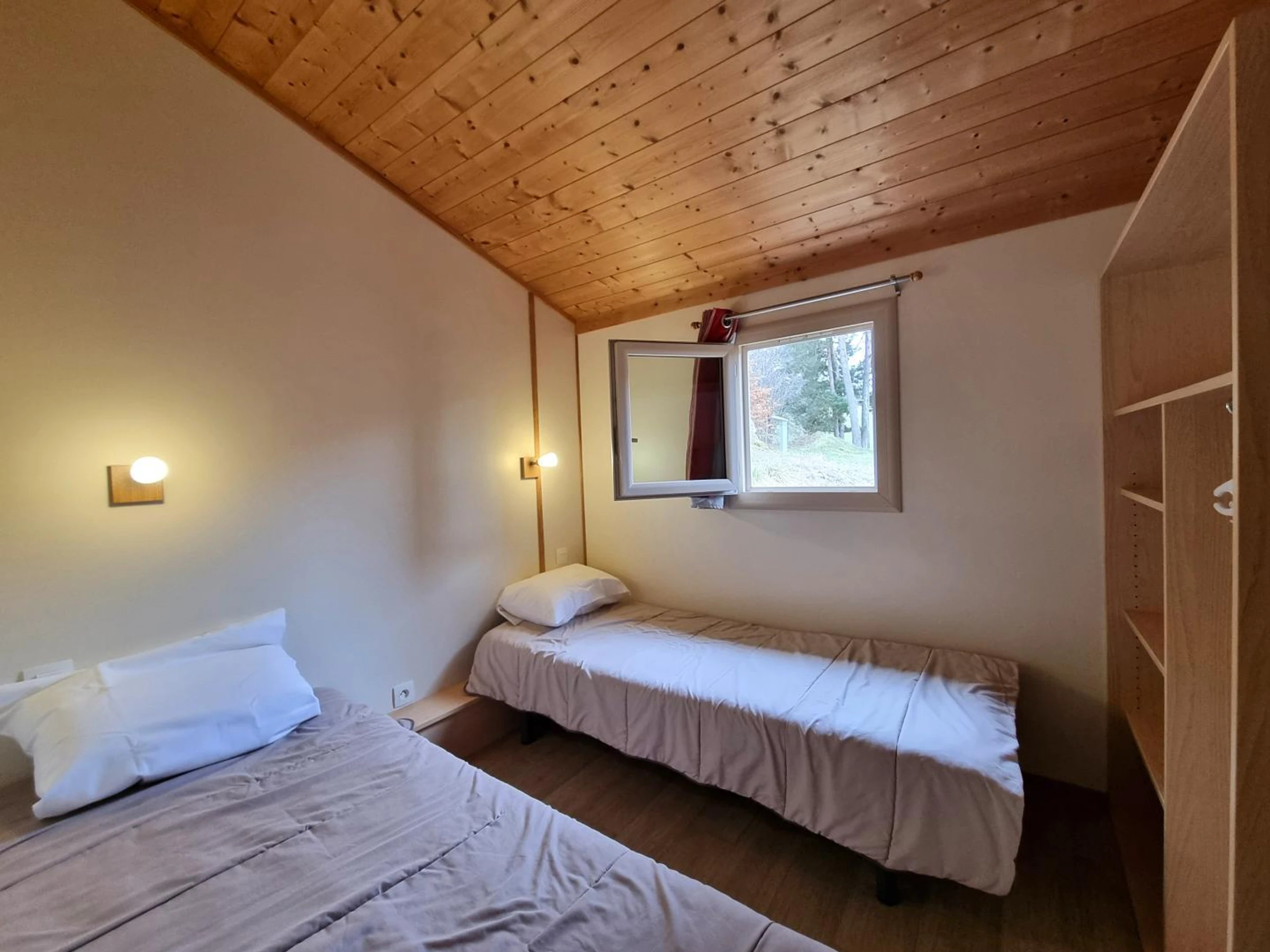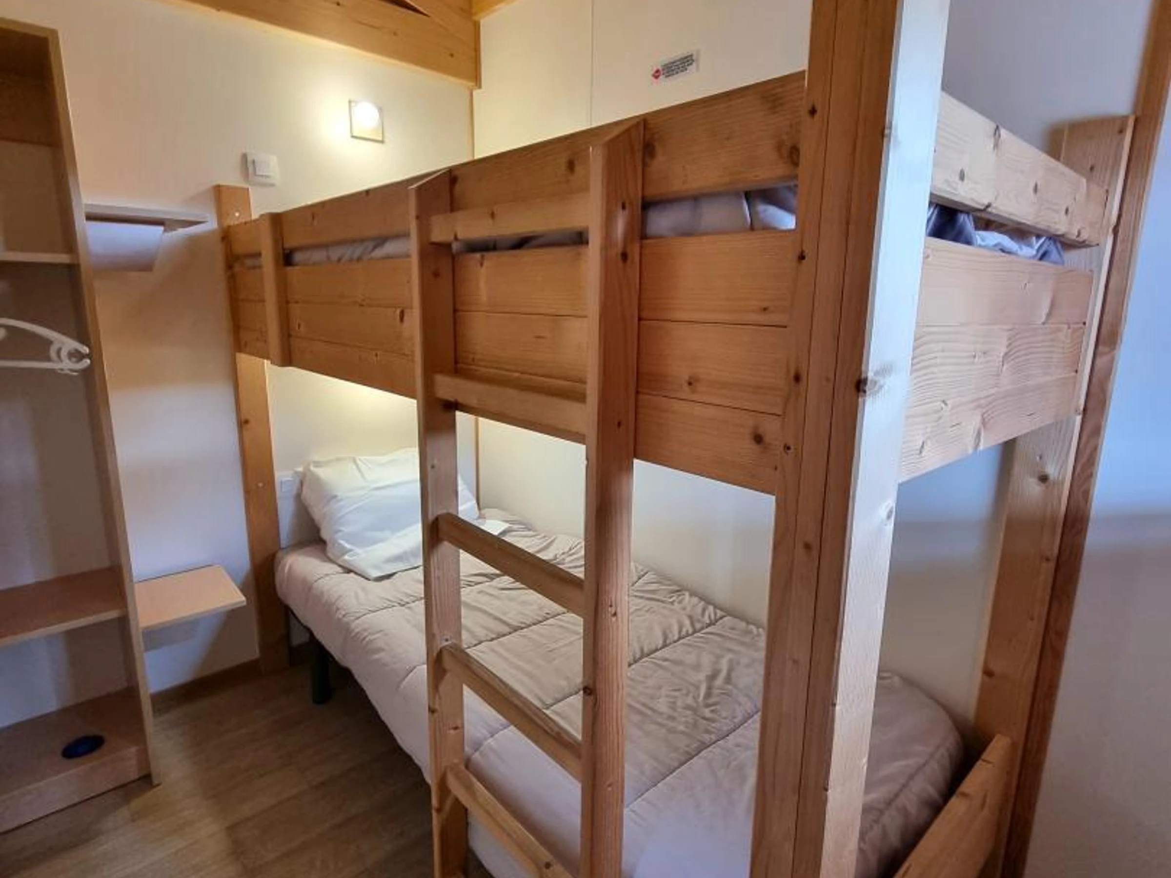 Dieses 35 m² große Chalet „Houx“ bietet eine funktionale und optimale Raumaufteilung für bis zu 6 Personen. Es verfügt über drei Schlafzimmer: eines mit einem Doppelbett (140 x 190 cm), ein zweites mit zwei Einzelbetten (80 x 190 cm) und ein drittes mit zwei Etagenbetten (80 x 190 cm), ideal für Kinder.