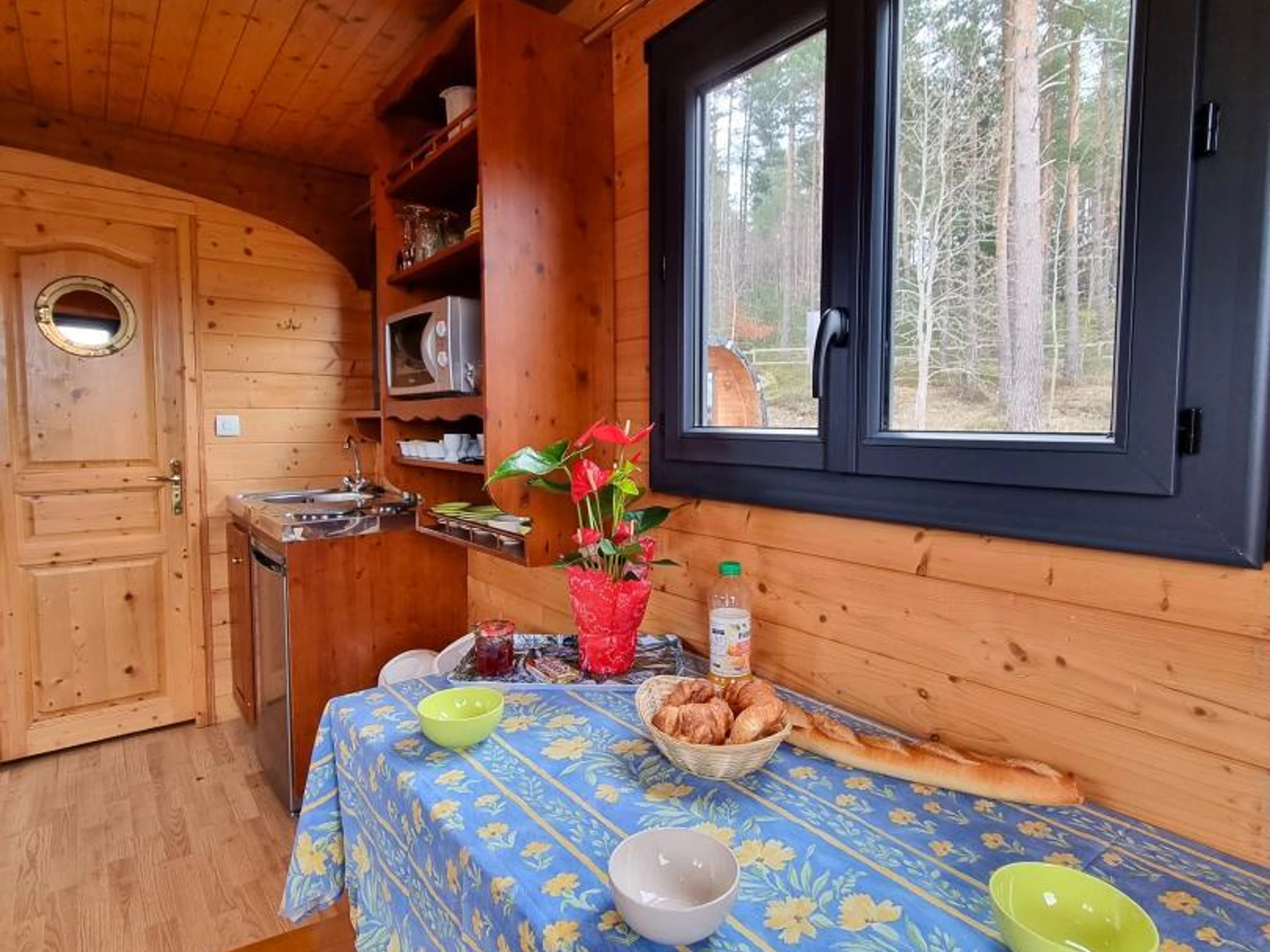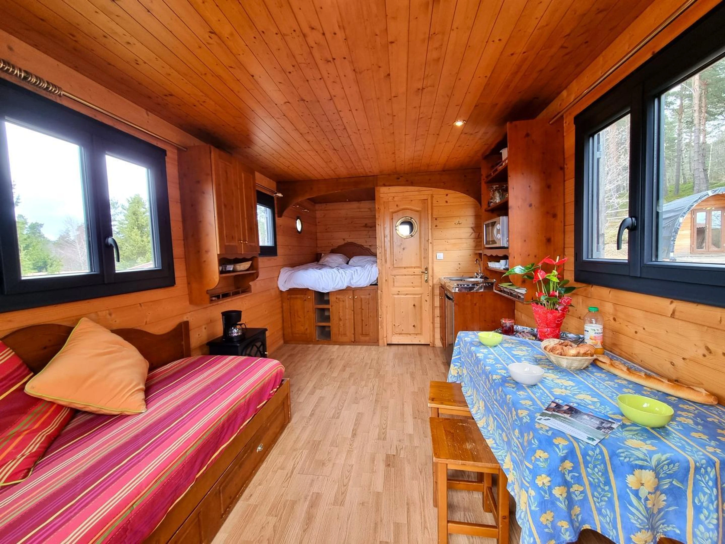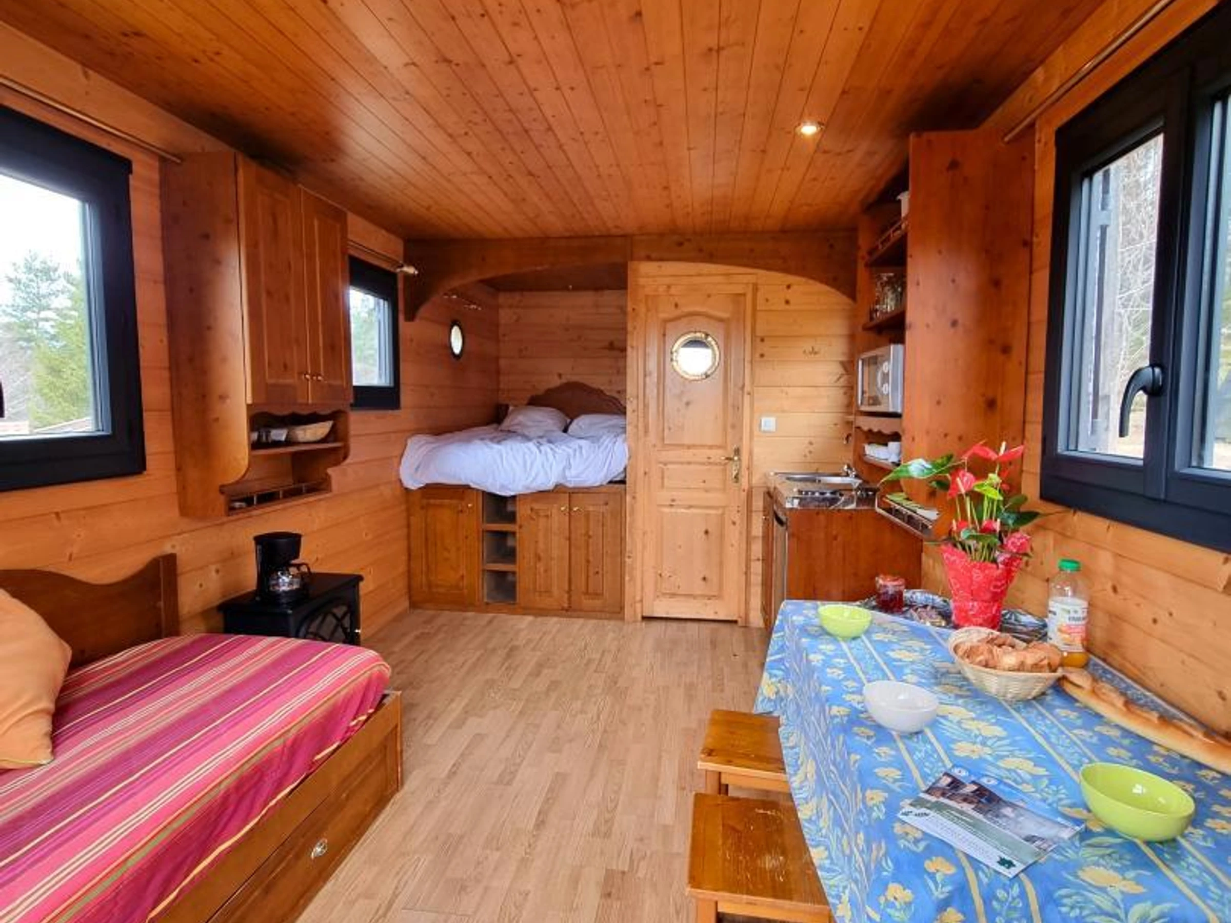 Der Wohnbereich umfasst eine Sitzecke mit Tisch und Hockern, ein Schlafsofa (auf Anfrage als Zustellbett auf einer 80 x 190 cm großen Bank verfügbar) und einen Fernseher. Die Küchenzeile ist mit einem kleinen Elektroherd, einer Mikrowelle, einer Filterkaffeemaschine, einem kleinen Kühlschrank sowie dem notwendigen Geschirr und Besteck ausgestattet.