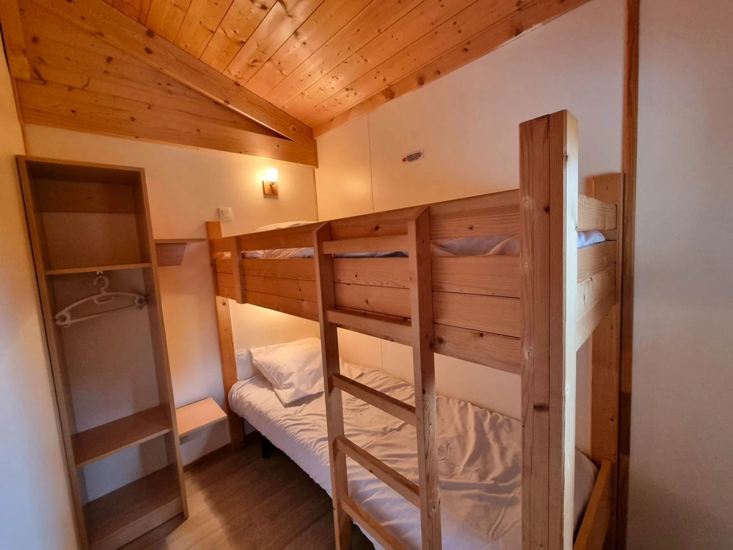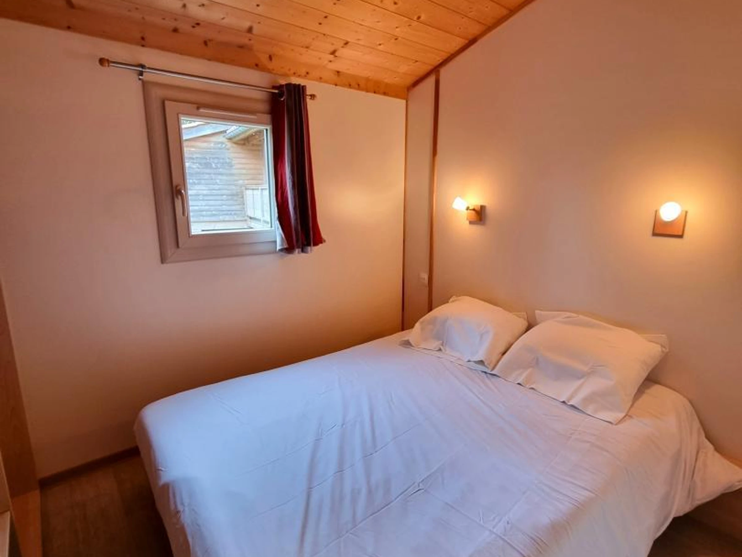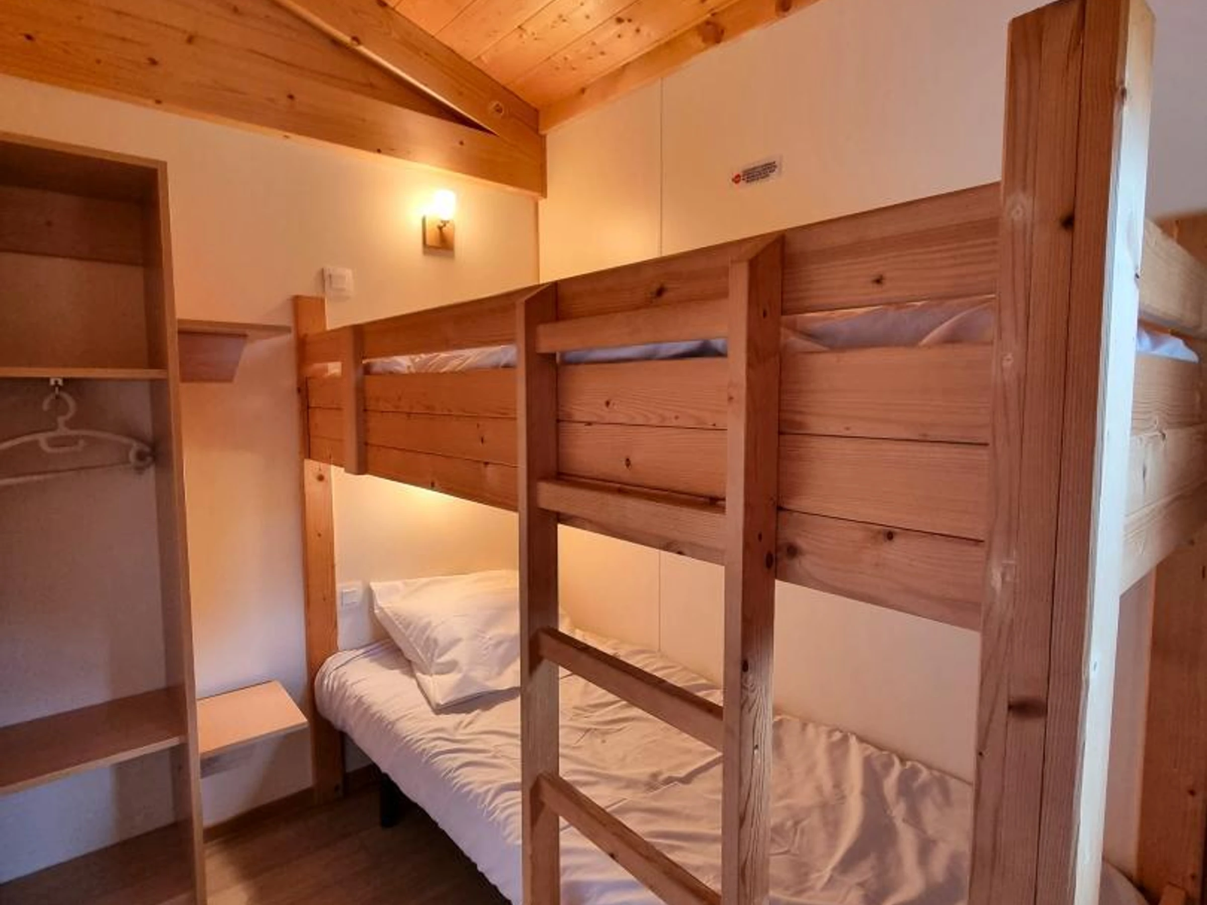 Dieses 35 m² große Chalet „Sureau“ bietet eine funktionale und optimale Raumaufteilung für bis zu 6 Personen. Es verfügt über drei Schlafzimmer: eines mit einem Doppelbett (140 x 190 cm), eines mit zwei Einzelbetten (80 x 190 cm) und eines mit zwei Etagenbetten (80 x 190 cm), ideal für Kinder.