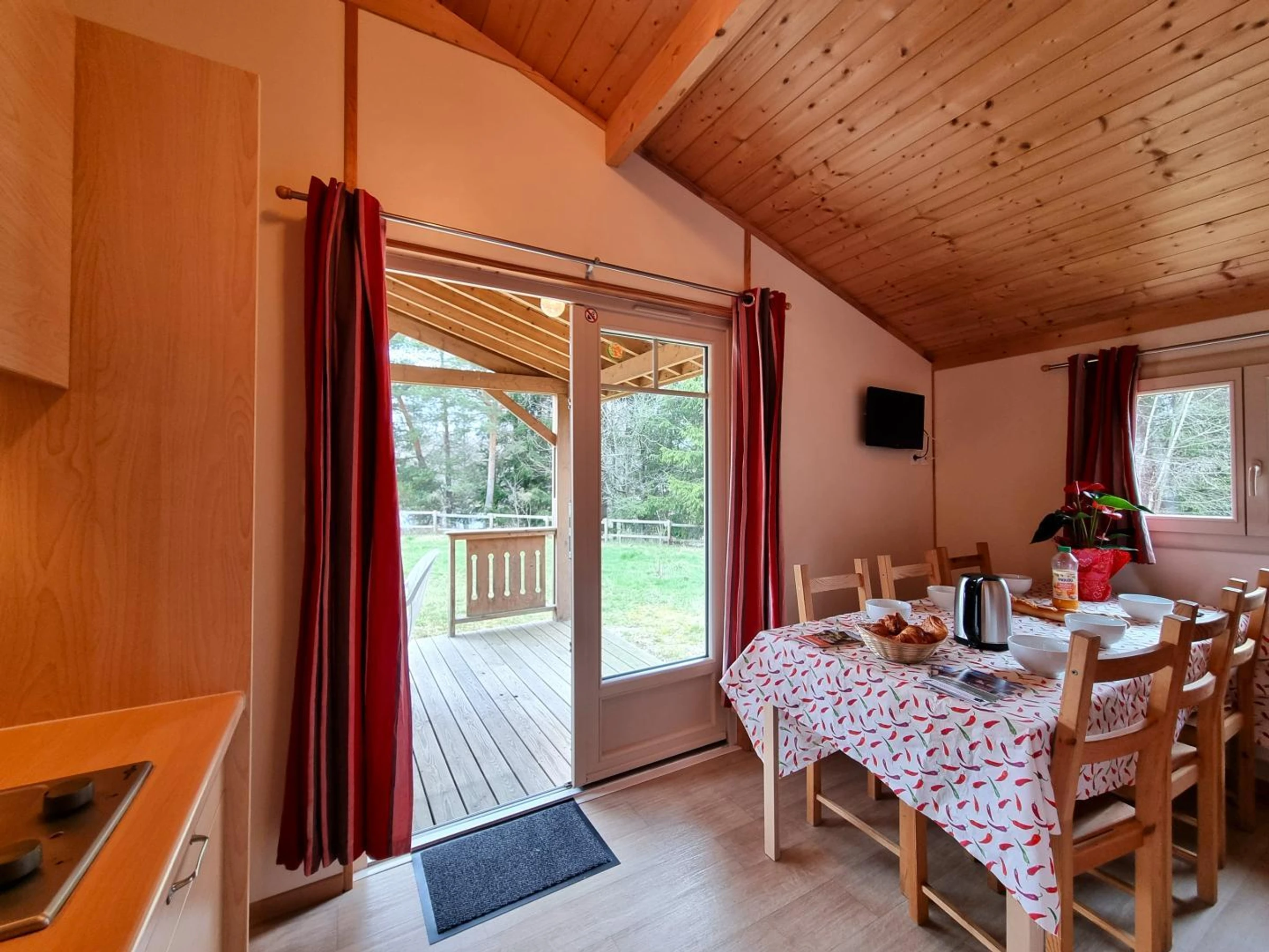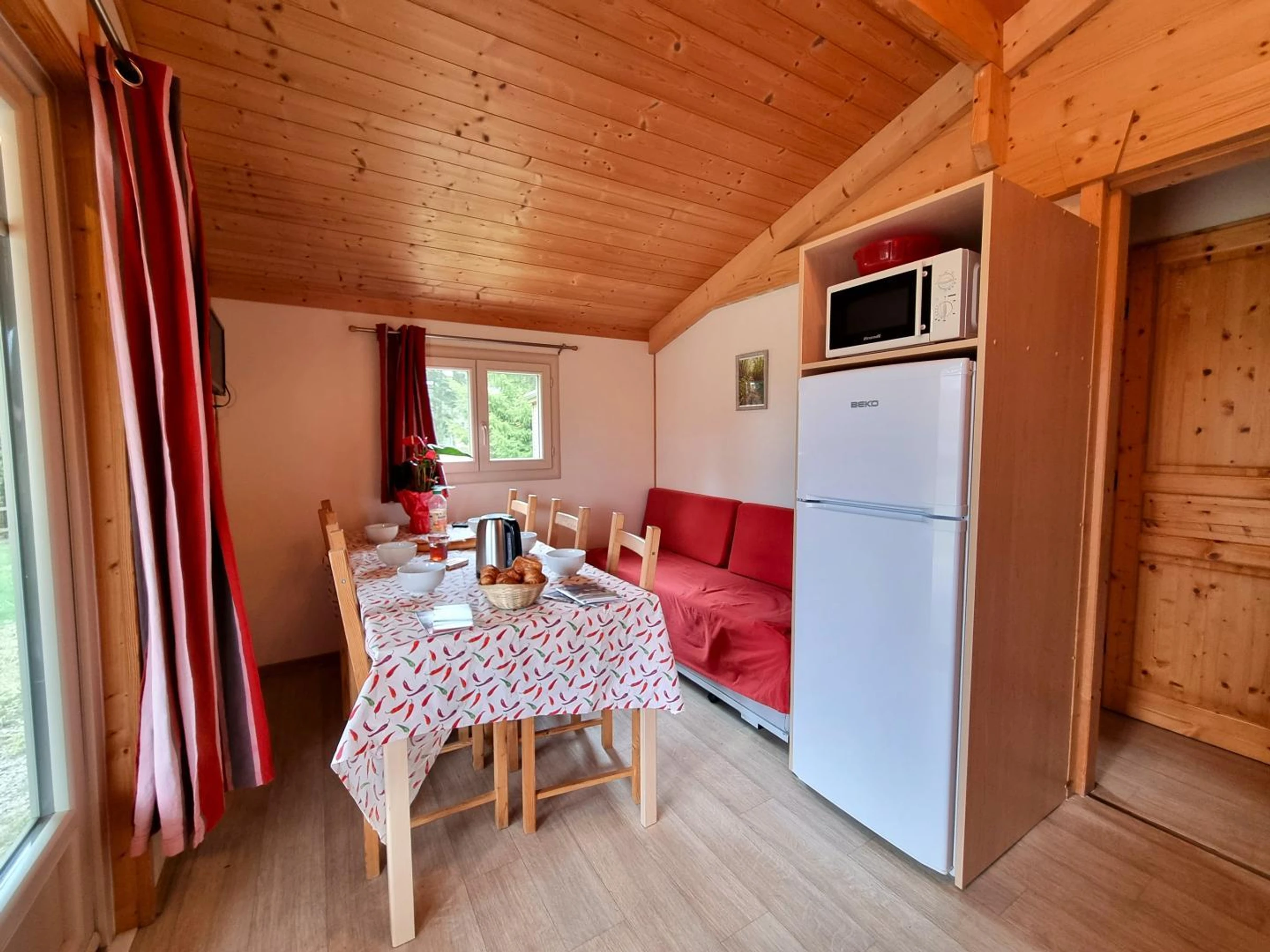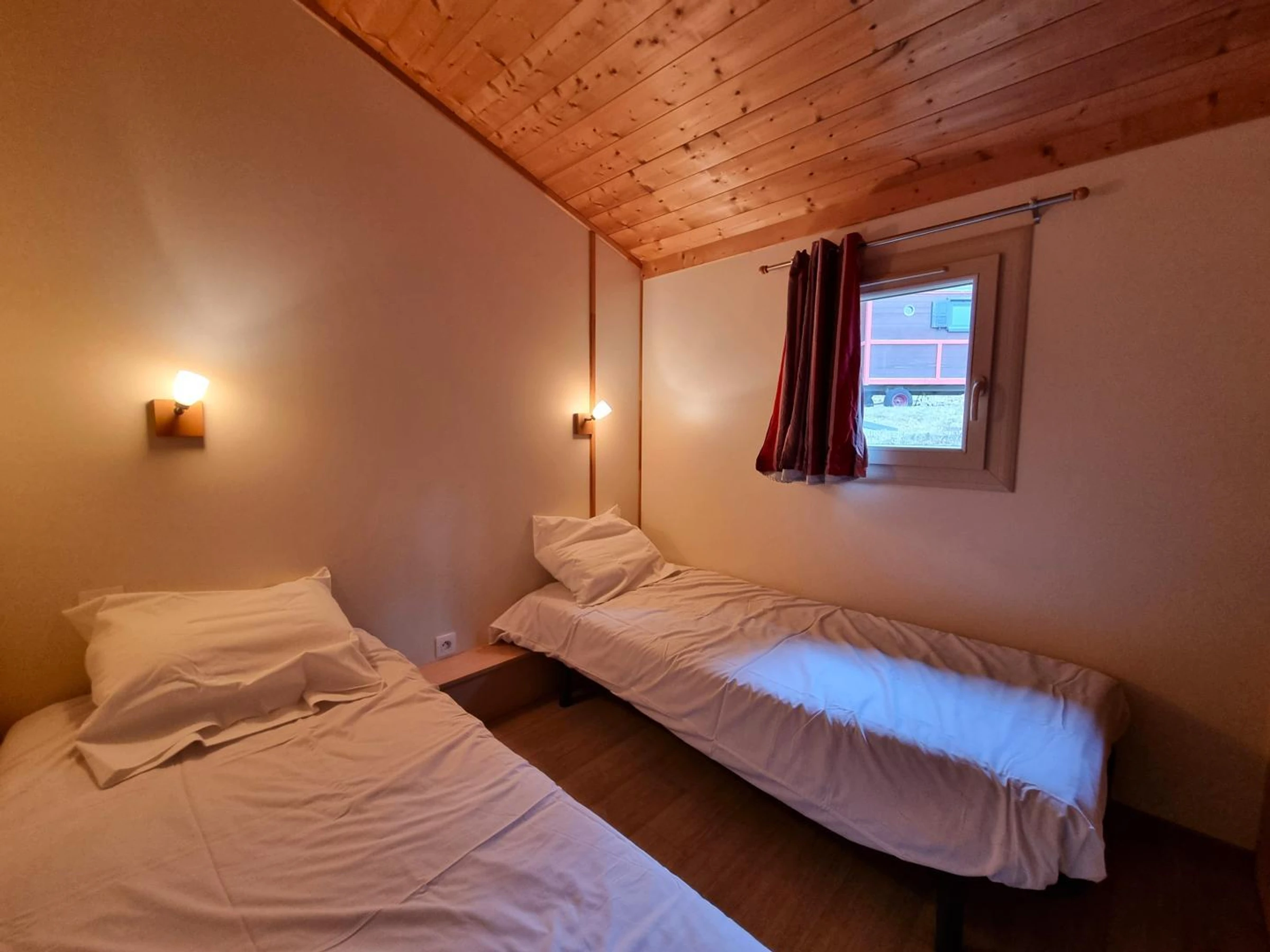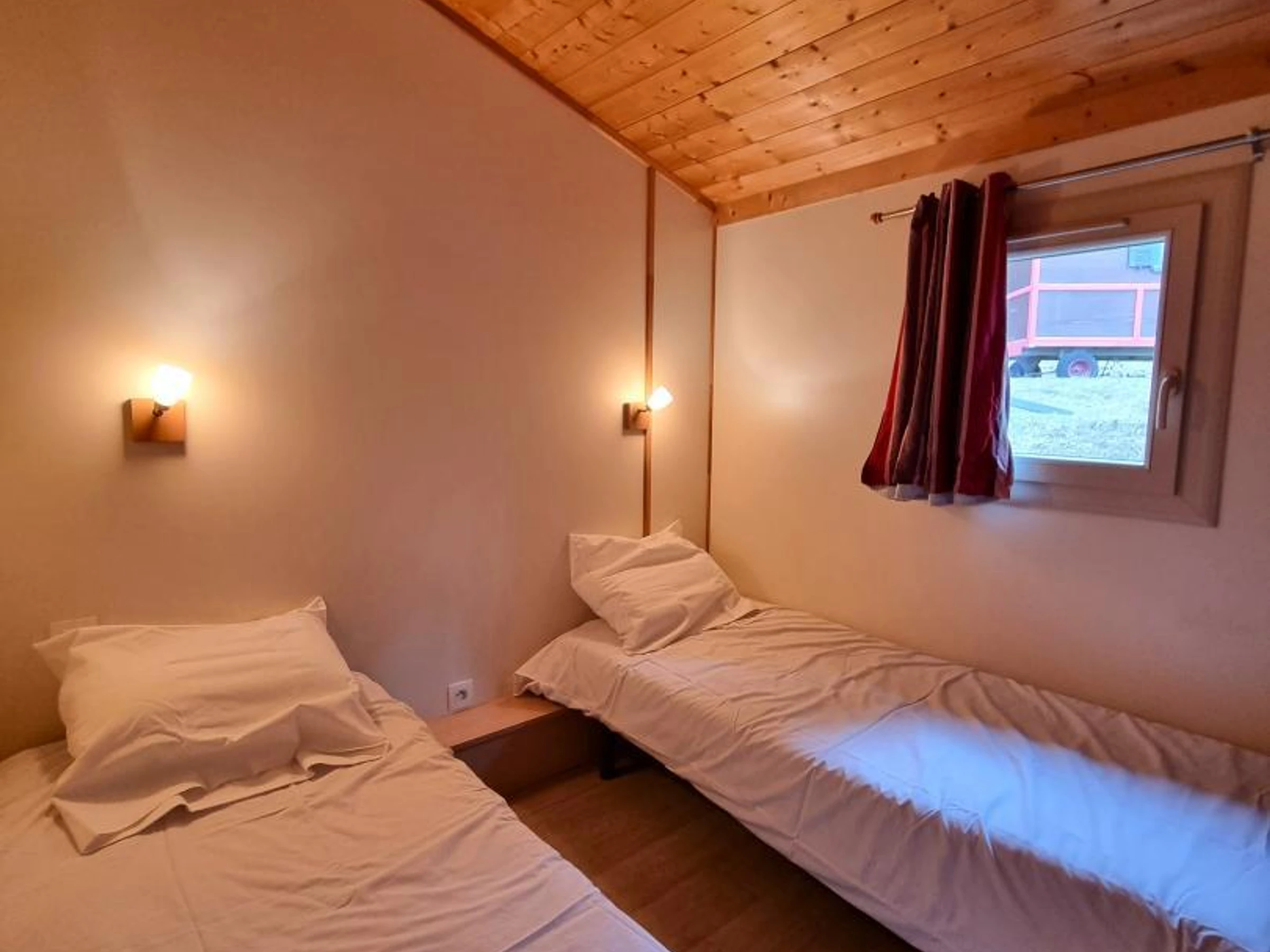 Dieses 35 m² große Chalet „Sureau“ bietet eine funktionale und optimale Raumaufteilung für bis zu 6 Personen. Es verfügt über drei Schlafzimmer: eines mit einem Doppelbett (140 x 190 cm), eines mit zwei Einzelbetten (80 x 190 cm) und eines mit zwei Etagenbetten (80 x 190 cm), ideal für Kinder.