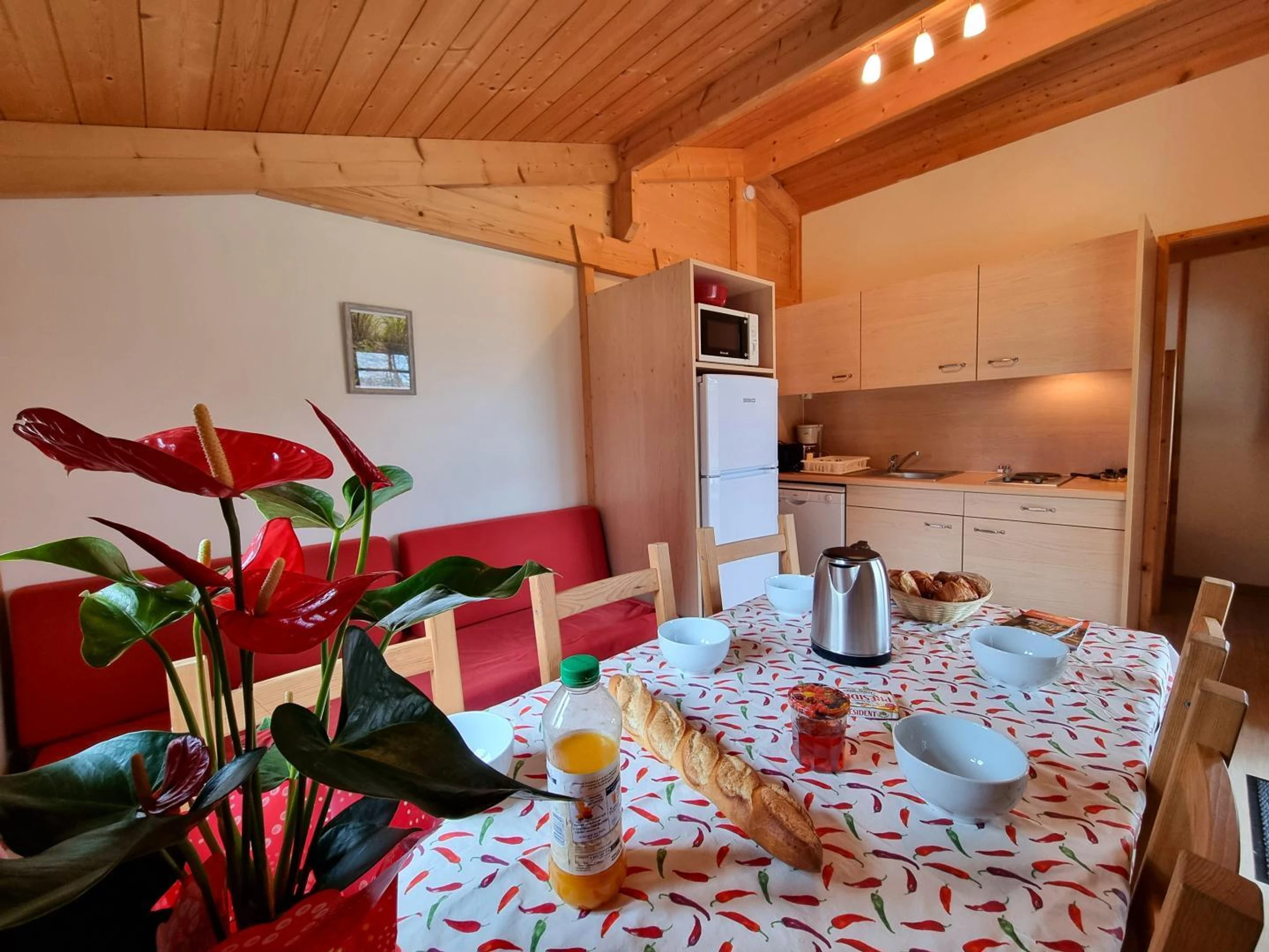 Der Wohnbereich umfasst einen Essbereich mit einem Tisch für sechs Personen und eine voll ausgestattete Küche.