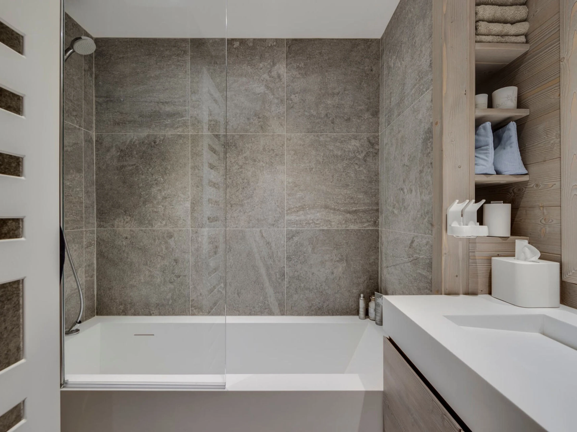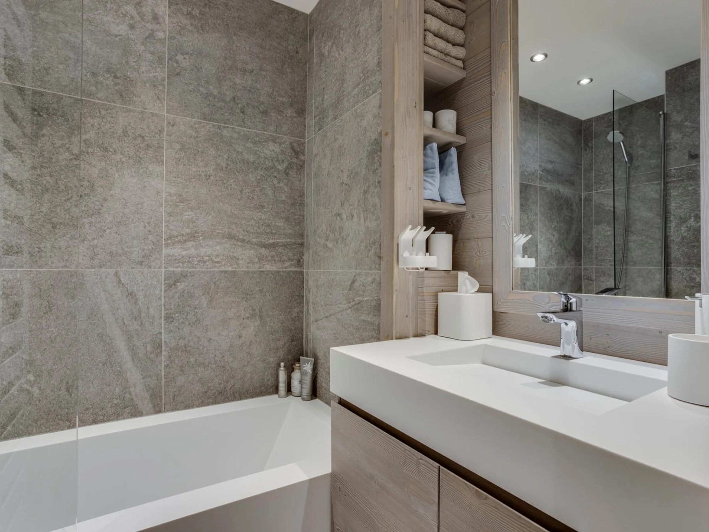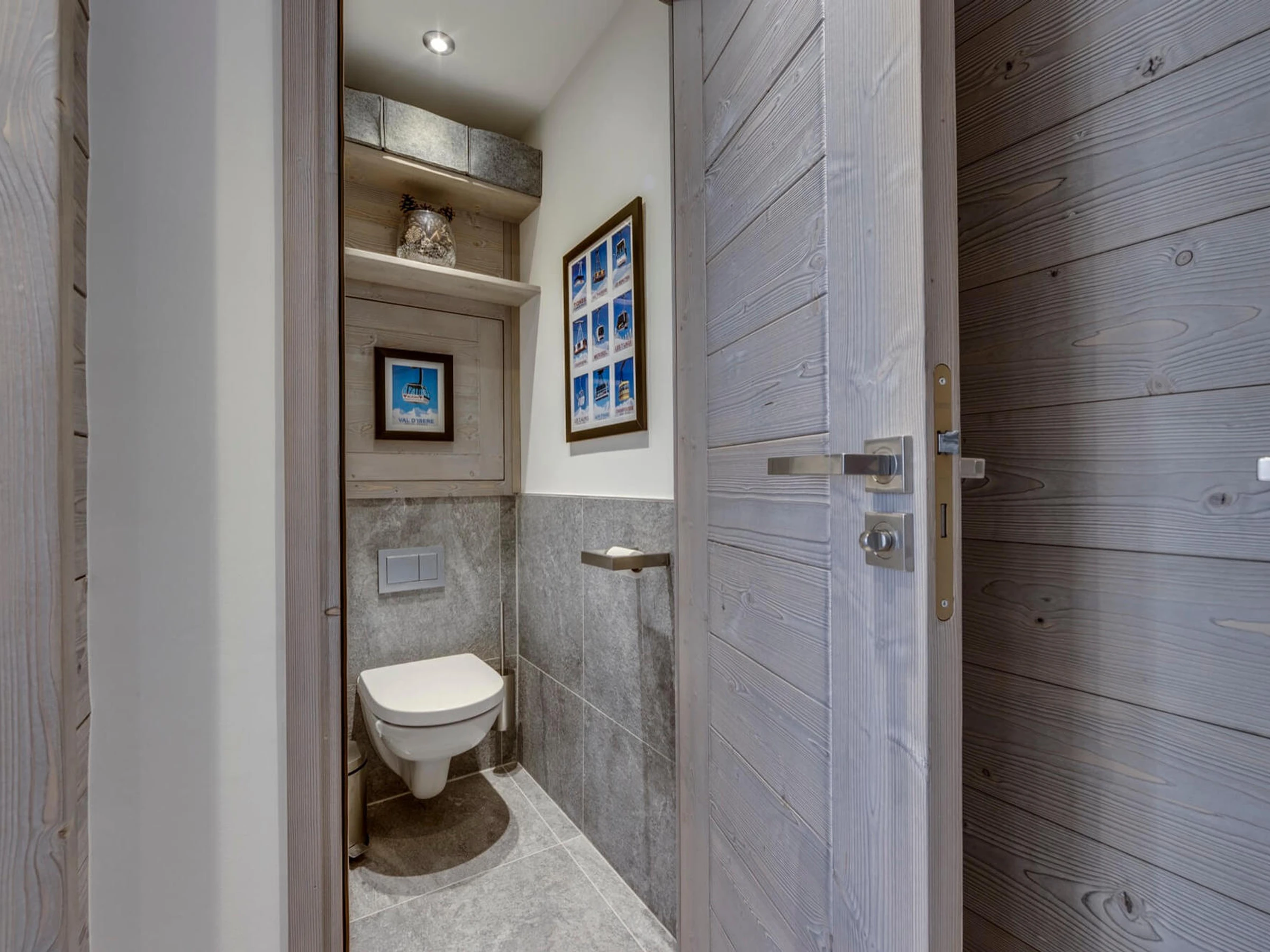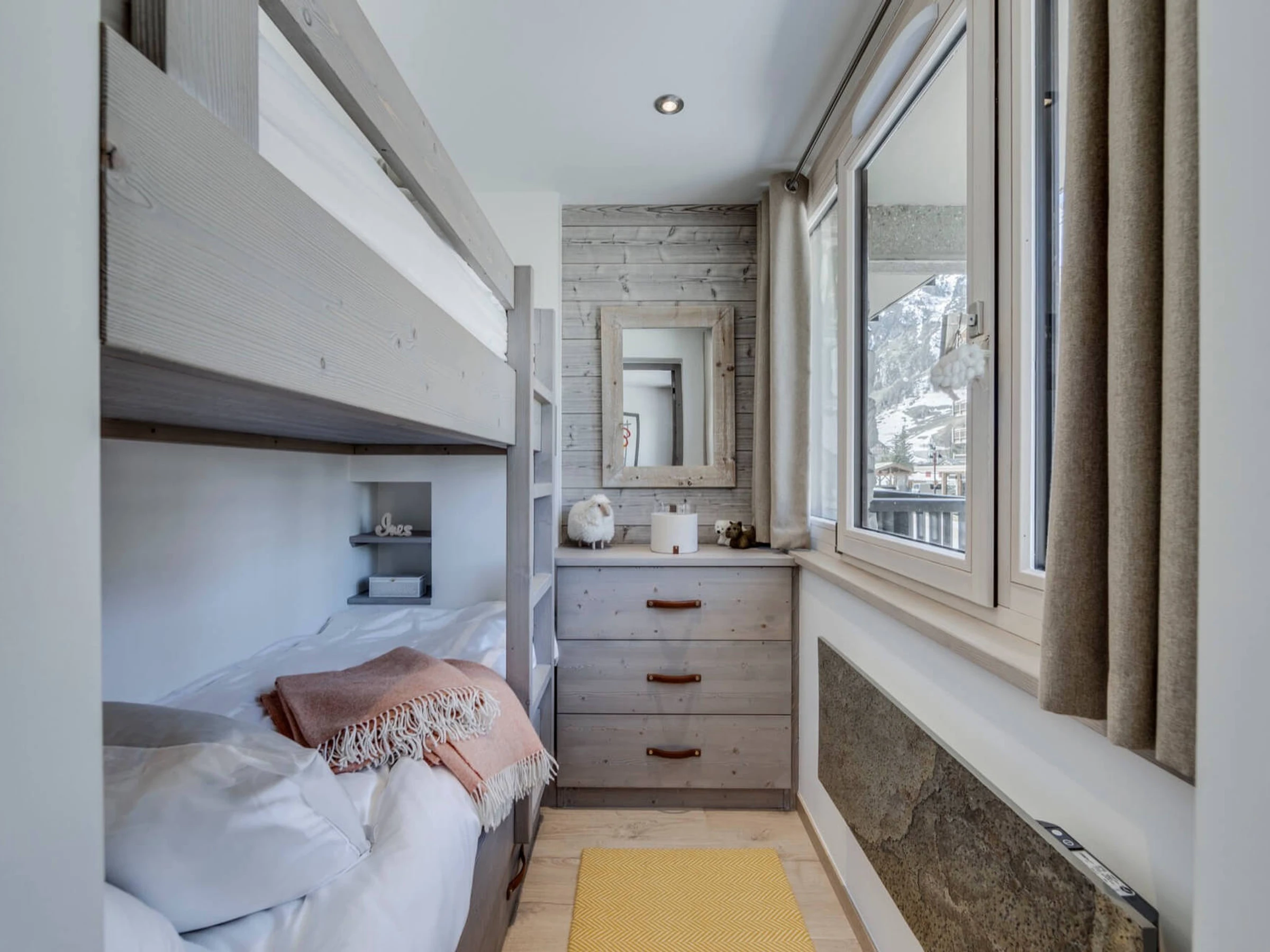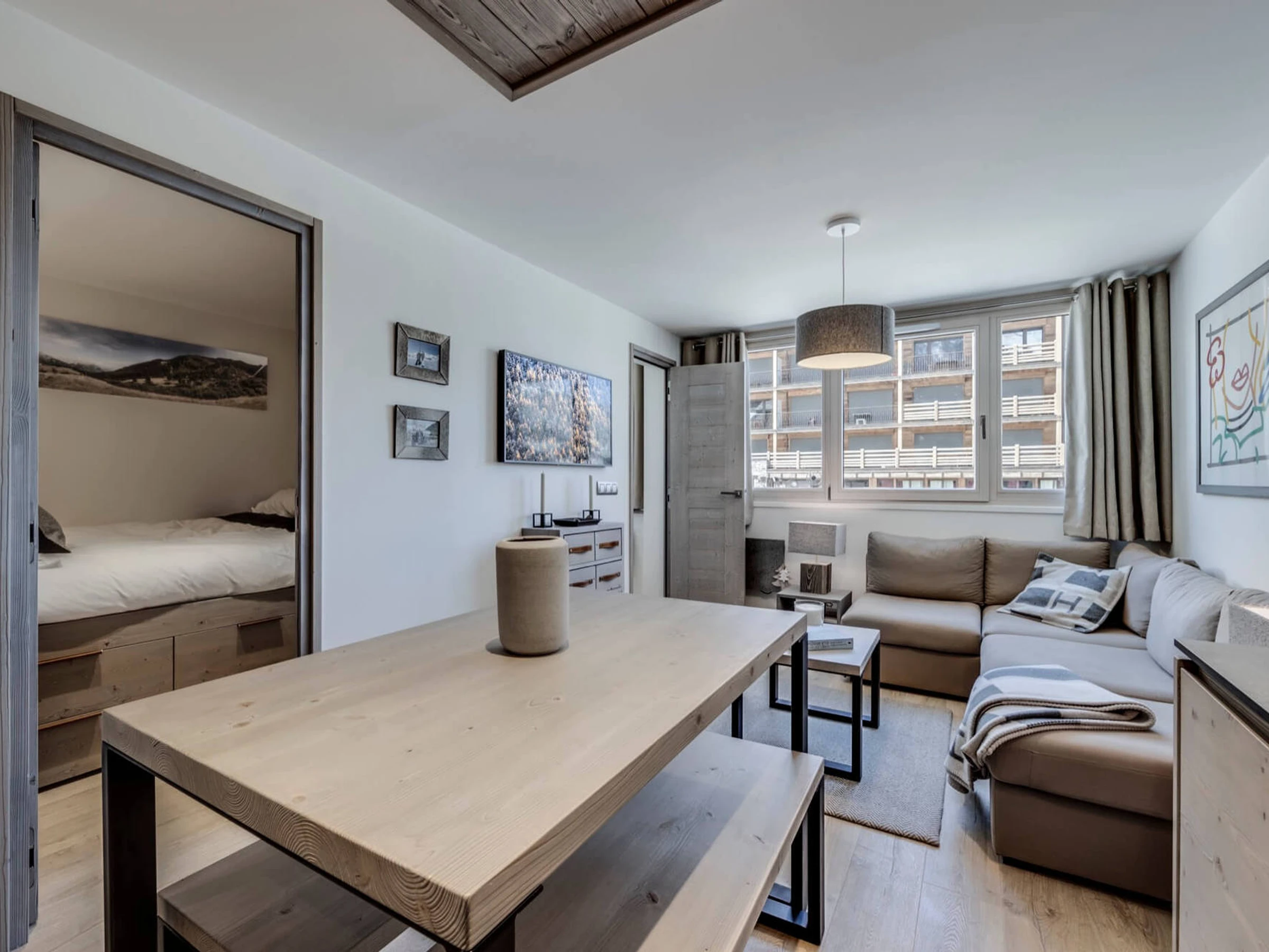 Das Apartment verfügt über ein Hauptschlafzimmer, ein Schlafzimmer mit Etagenbett, ein Wohnzimmer mit Küche und Essbereich, ein Duschbad, ein separates WC und einen Skiraum. Die Wohnung bietet direkten Zugang zur Piste.