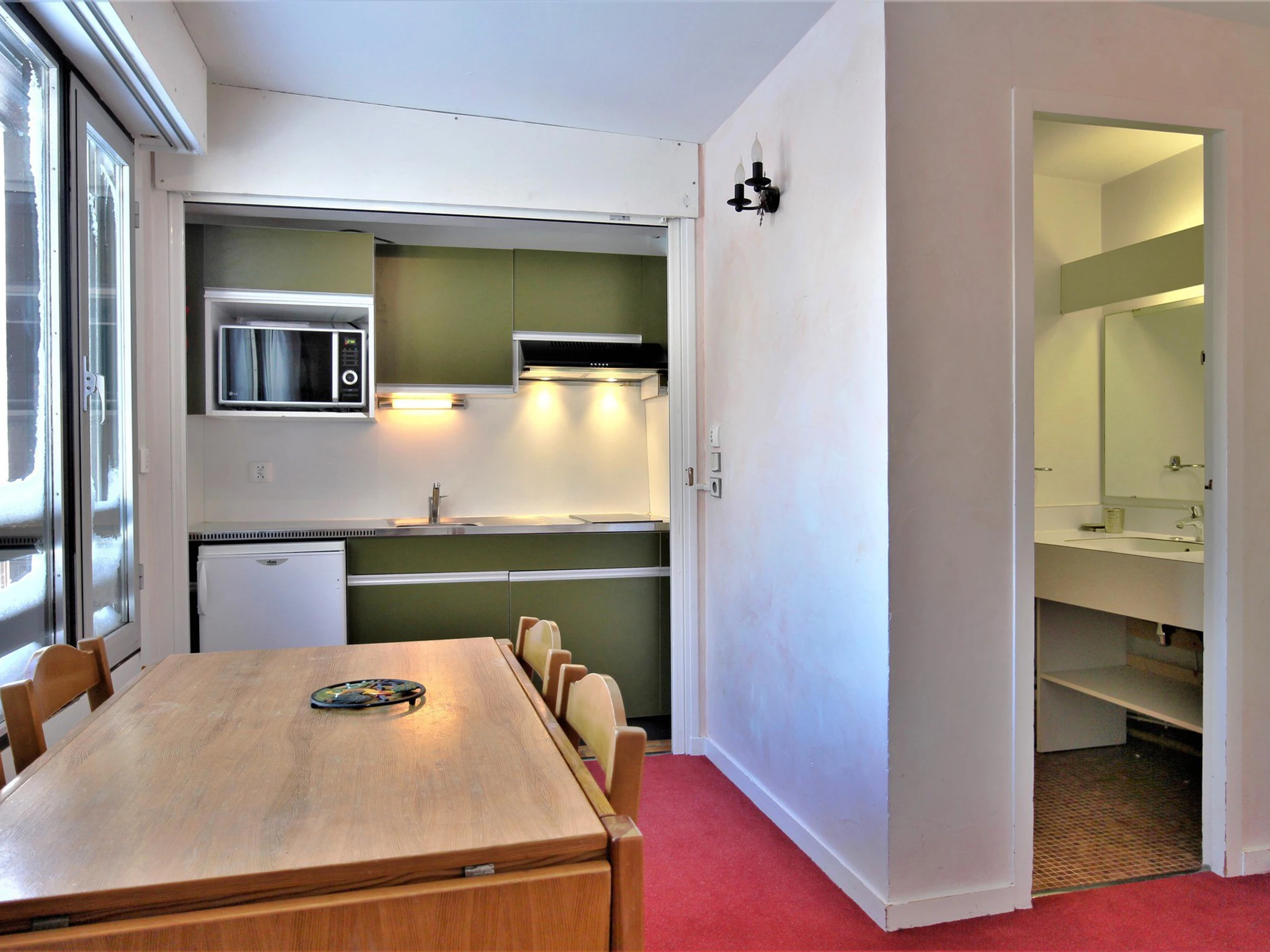 Ausgestattet mit Mikrowelle mit Grill, Cerankochfeld, Kühlschrank mit Gefrierfach und elektrischer Dunstabzugshaube.