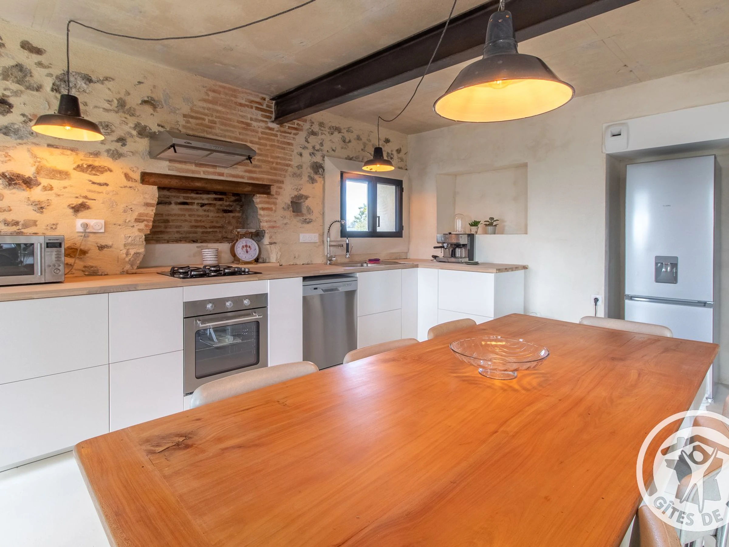 Großes Wohnzimmer von 87 m² mit Erkerfenstern mit Holzofen und zwei Treppen, die jeweils zu zwei Schlafzimmern führen. Ausgestattete Küche (Backofen, 4-Flammen-Gasherd, Geschirrspüler, Mikrowelle usw.). Waschküche mit Waschmaschine und separatem WC. Im Obergeschoss hat jedes Schlafzimmer ein Duschbad (mit Haartrockner) und eine separate Toilette (2 verstellbare Betten 80x200cm). Schöne nach Südosten ausgerichtete Terrasse und ein privater Garten von 2000 m², der von Weinreben gesäumt ist.