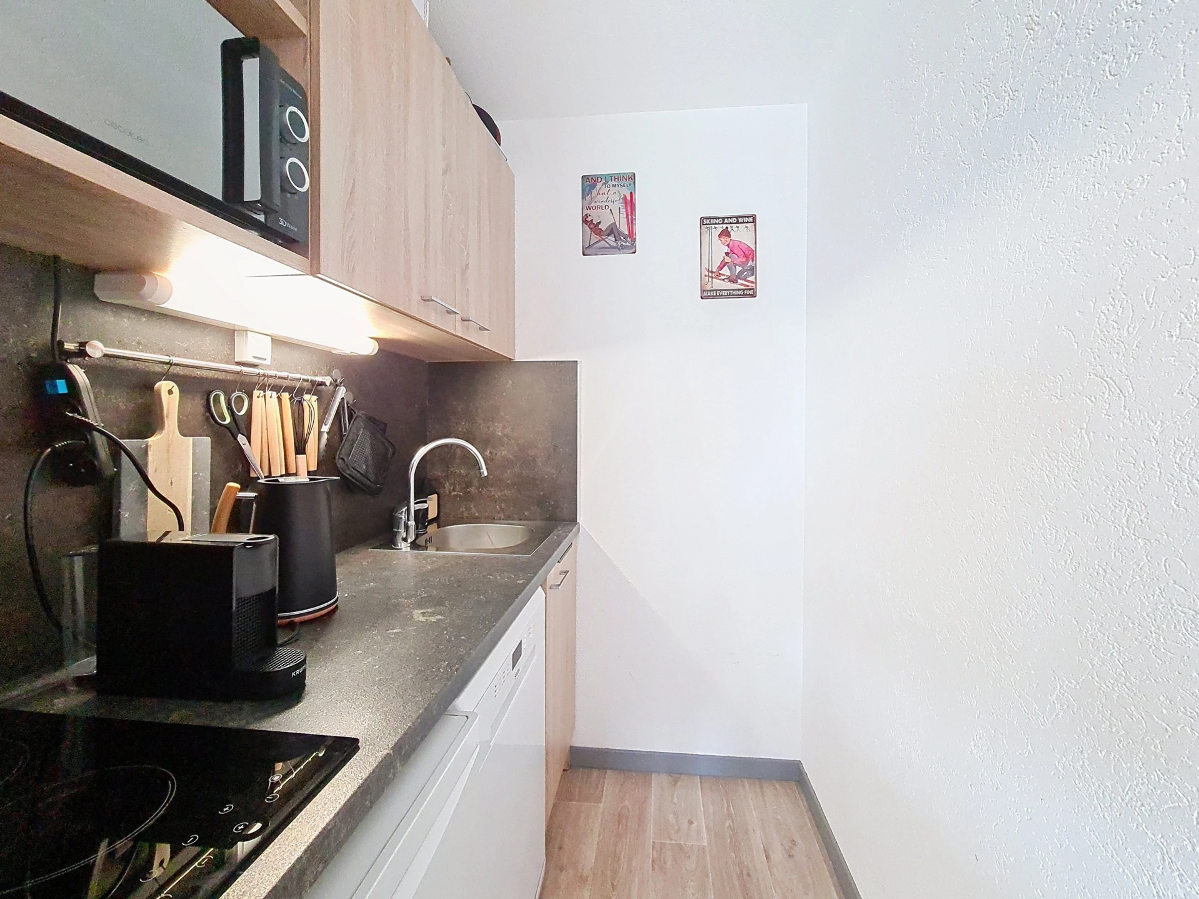 Offene Küche: komplett ausgestattet mit 2 Cerankochfeldern, Mikrowelle, Wasserkocher, Kaffeemaschine, Toaster und diversen Elektrogeräten.