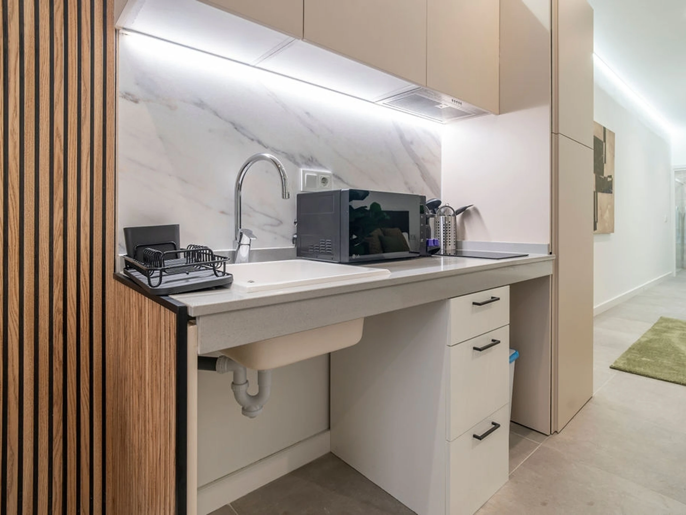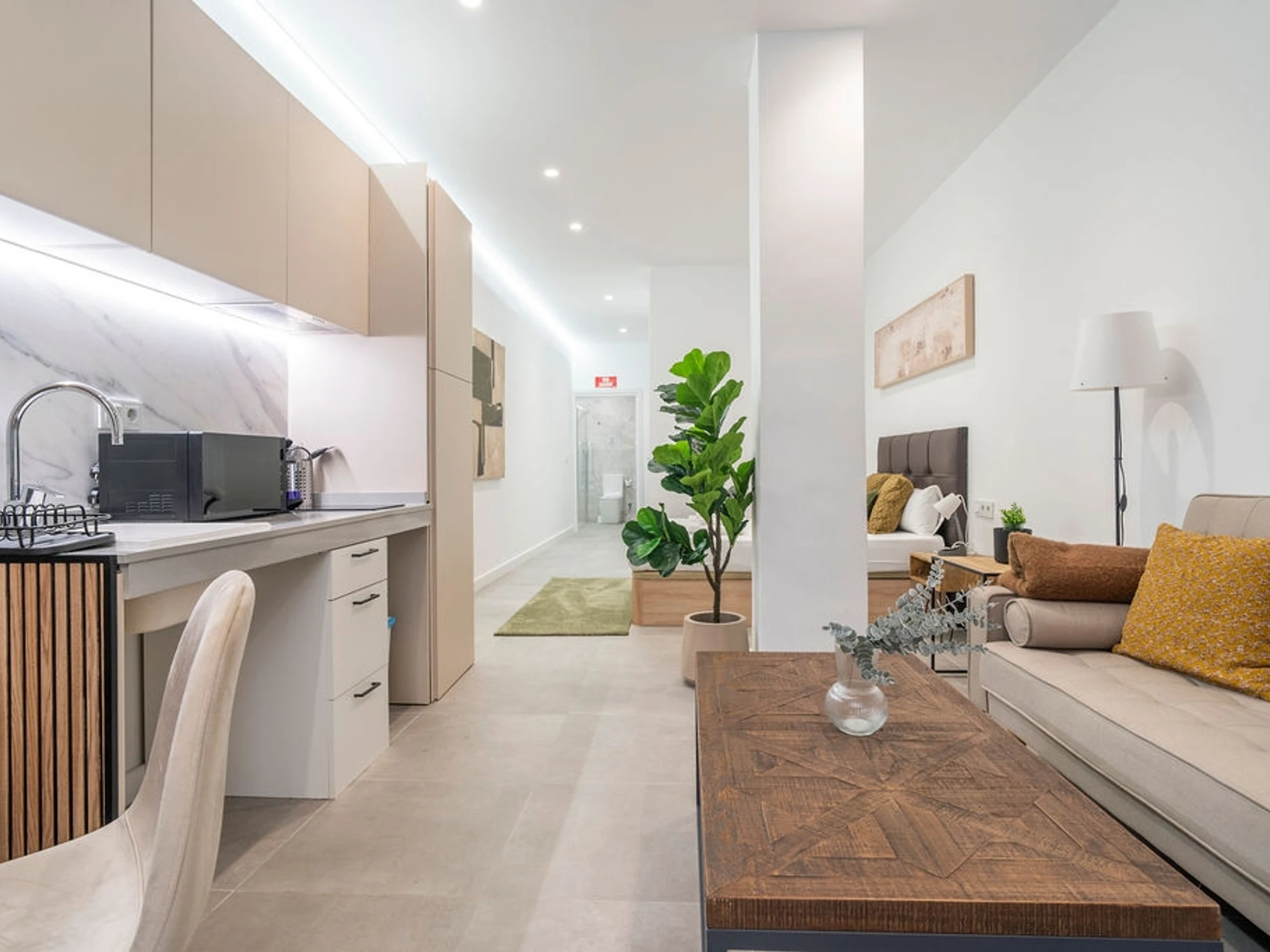 Willkommen in diesem hellen und einladenden Studio in Quatre Carreres, einem der zentralsten Viertel Valencias, direkt neben dem lebhaften Stadtteil Ruzafa. Nur wenige Schritte entfernt finden Sie die berühmte Stadt der Künste und Wissenschaften, diverse Einkaufsmöglichkeiten und eine große Auswahl an Restaurants und Bars. Dank der hervorragenden Anbindung an den öffentlichen Nahverkehr erreichen Sie die Altstadt und den Strand schnell und bequem. Das Apartment besticht durch ein raffiniertes und praktisches Design, bei dem moderne Elemente mit natürlichen Akzenten aus Holz und neutralen Farbtönen harmonisch verschmelzen und so ein ruhiges, mediterranes Ambiente schaffen.