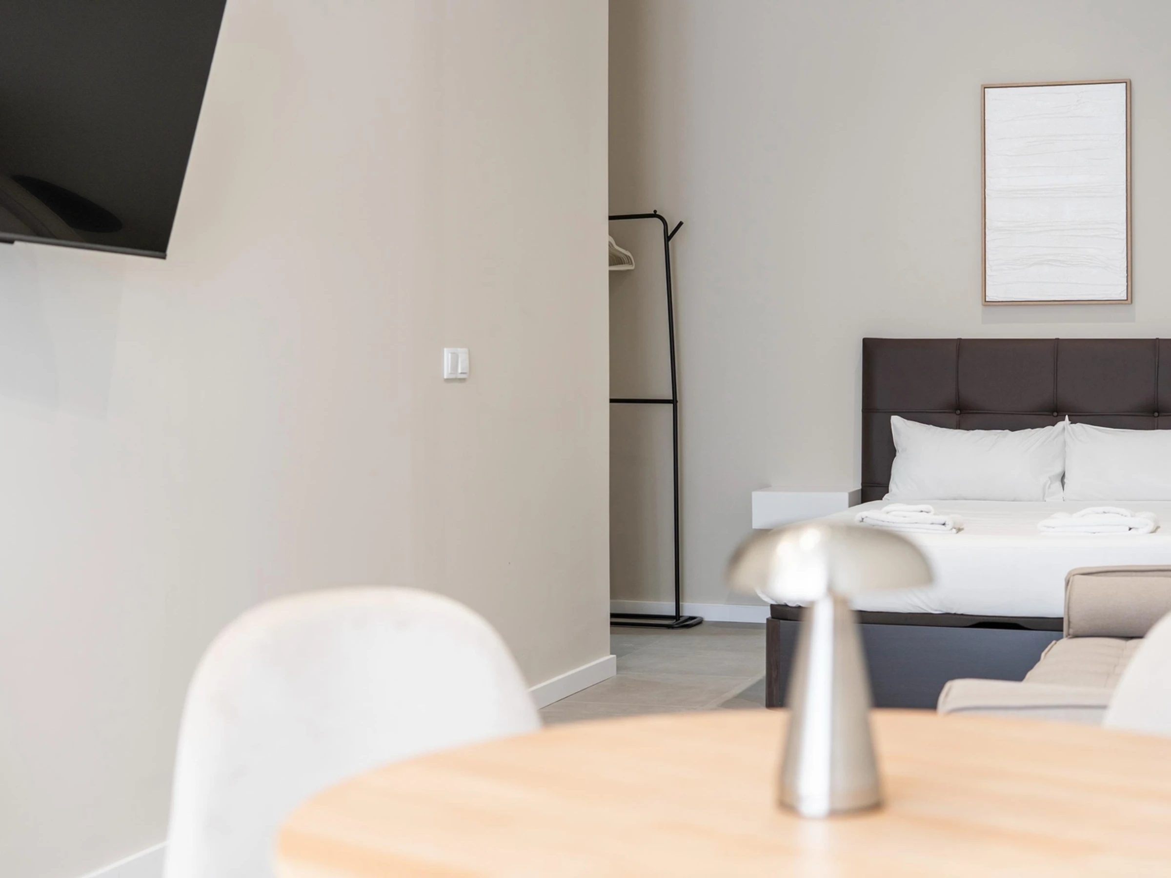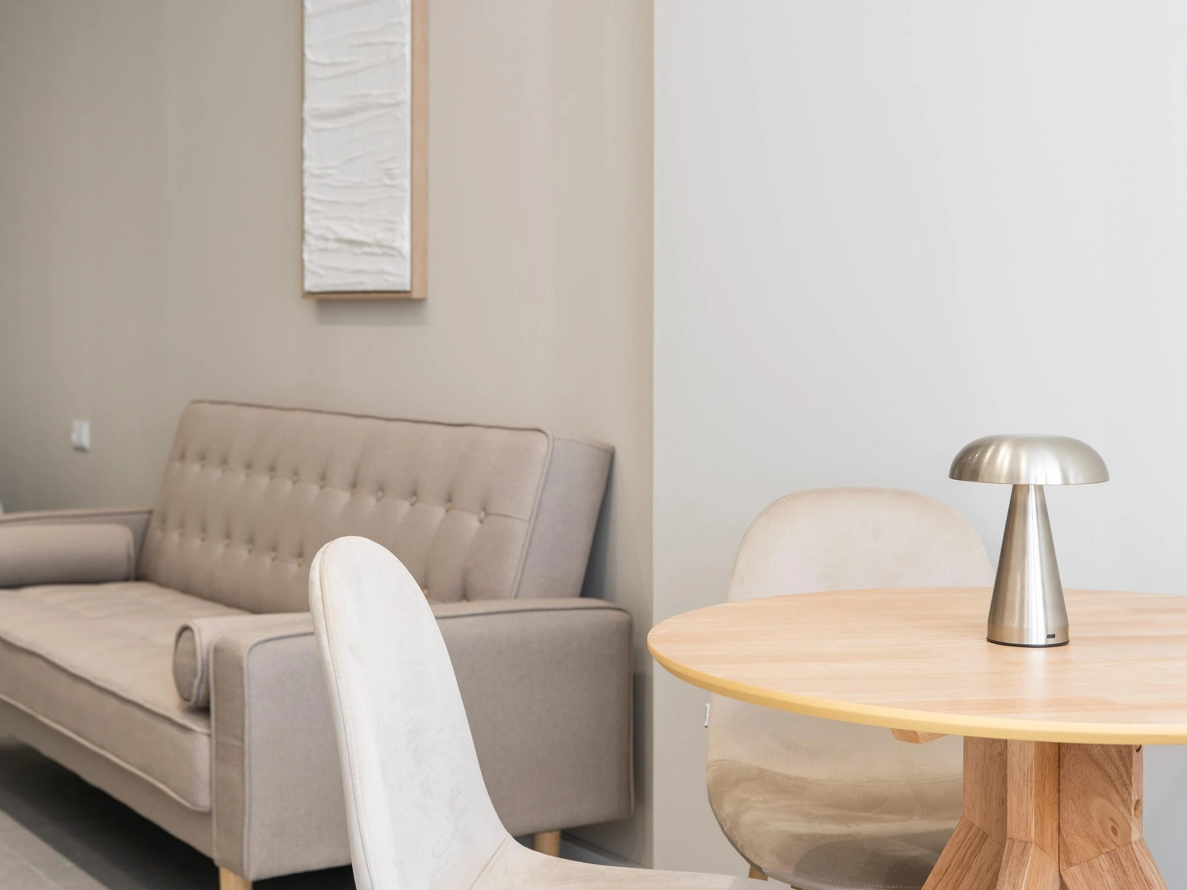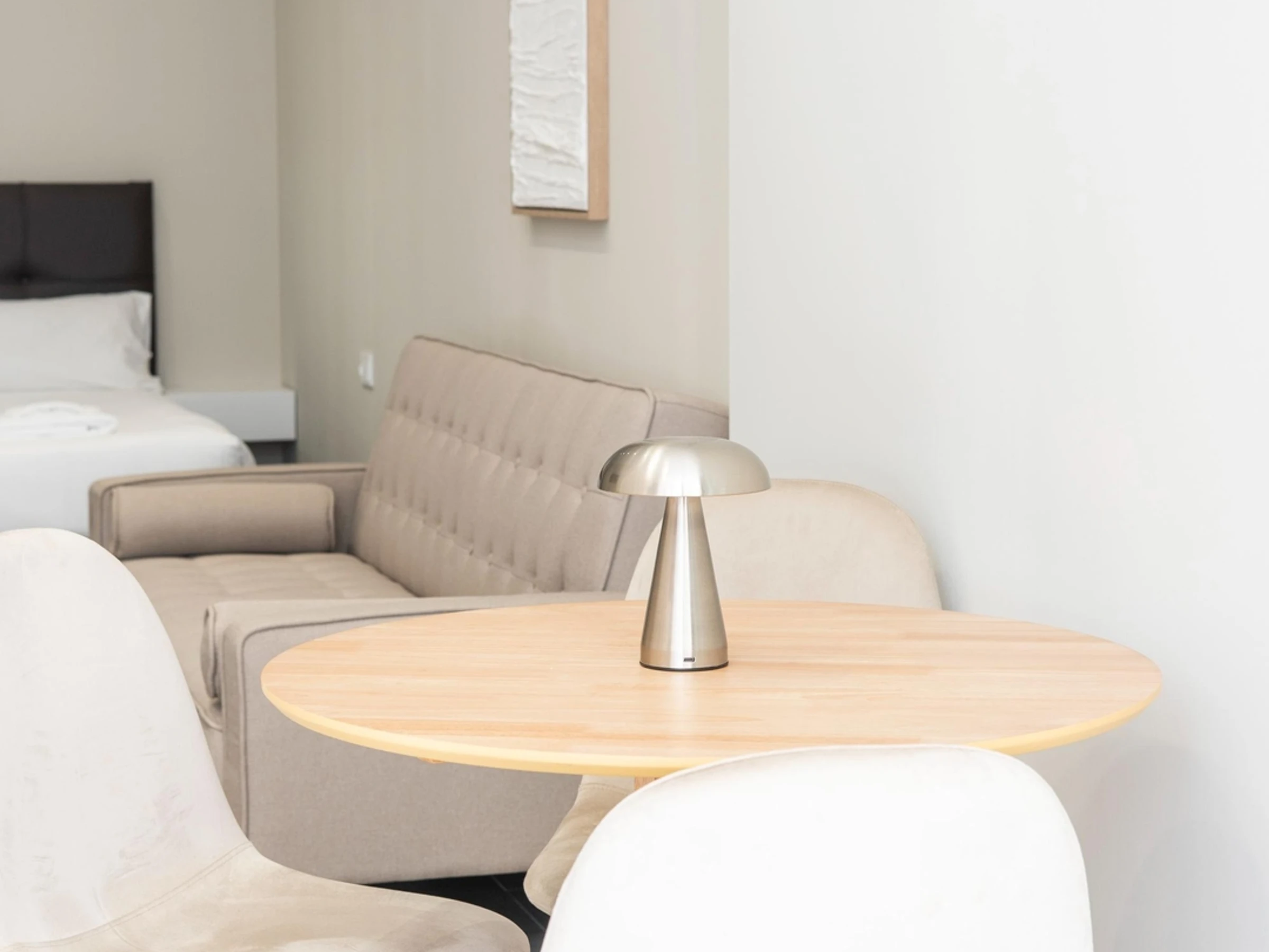Die Einrichtung besticht durch neutrale Töne, weiche Textilien und helle Holzelemente, die eine ruhige und einladende Atmosphäre schaffen.