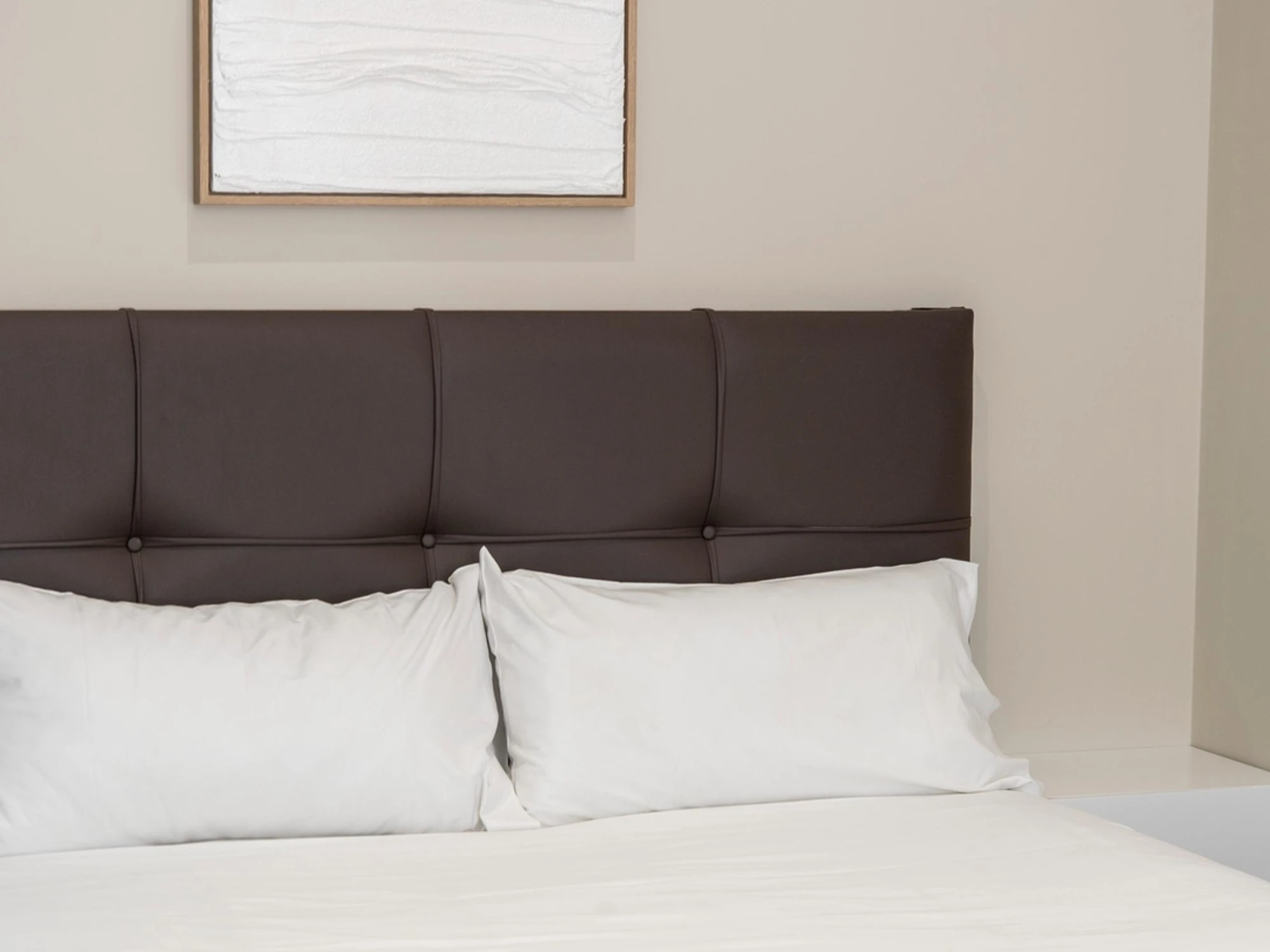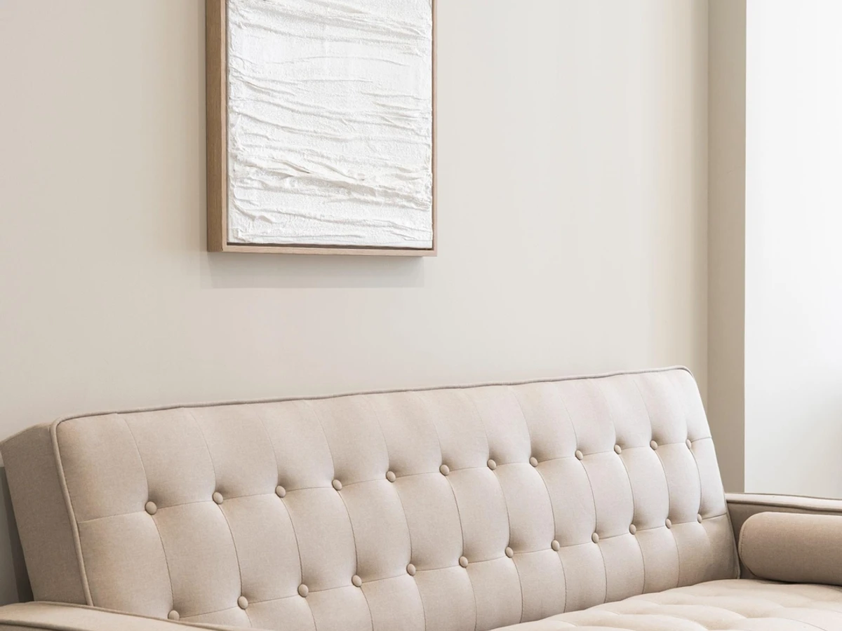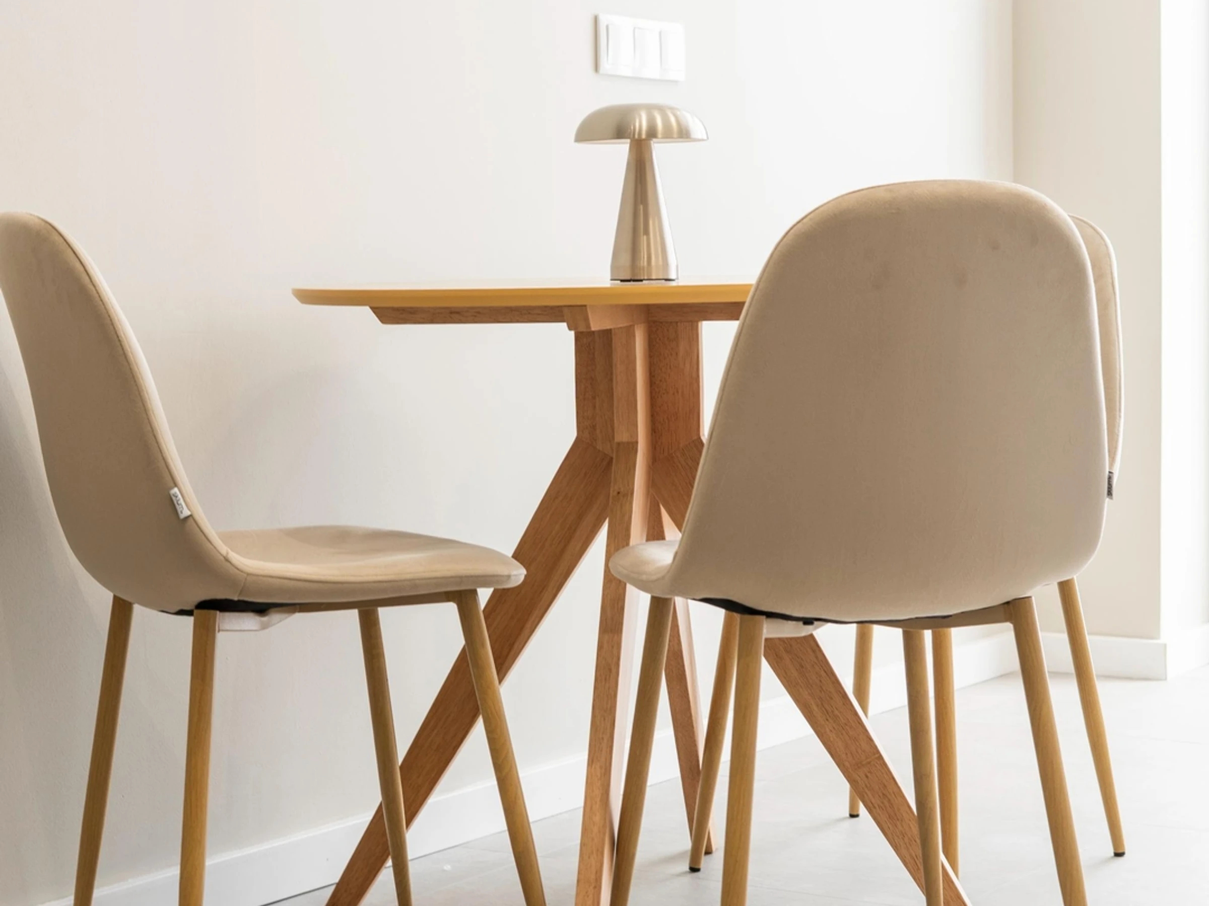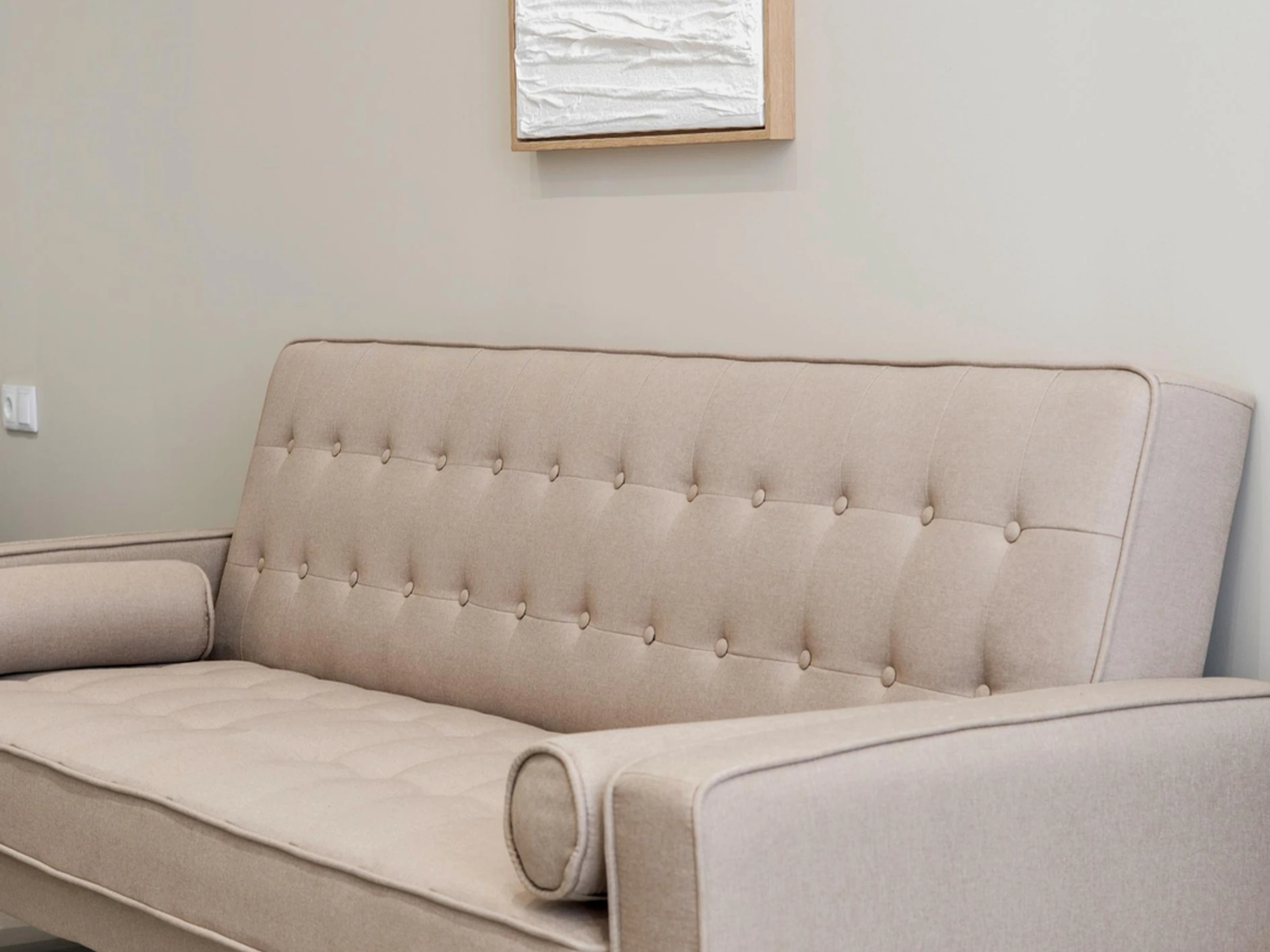 Die Einrichtung besticht durch neutrale Töne, weiche Textilien und helle Holzelemente, die eine ruhige und einladende Atmosphäre schaffen.