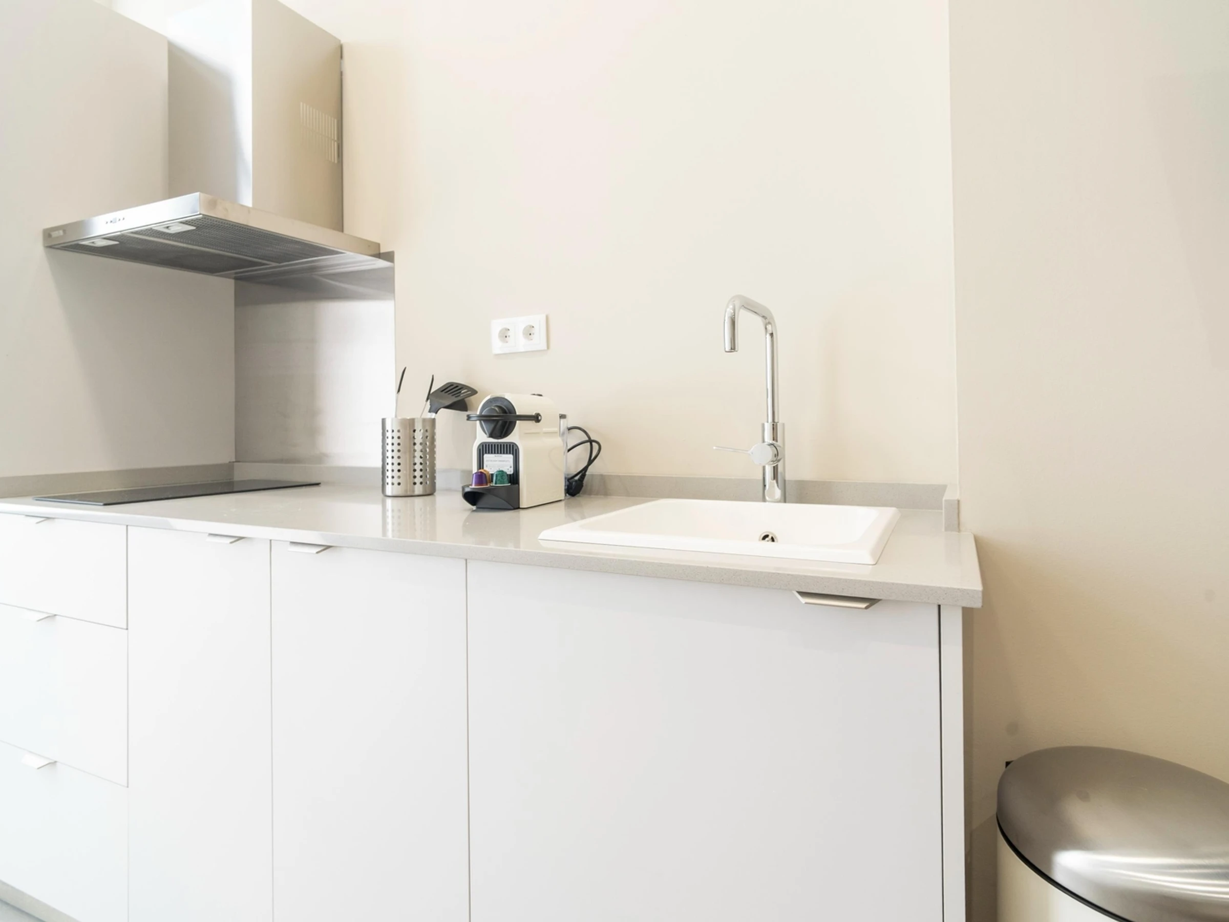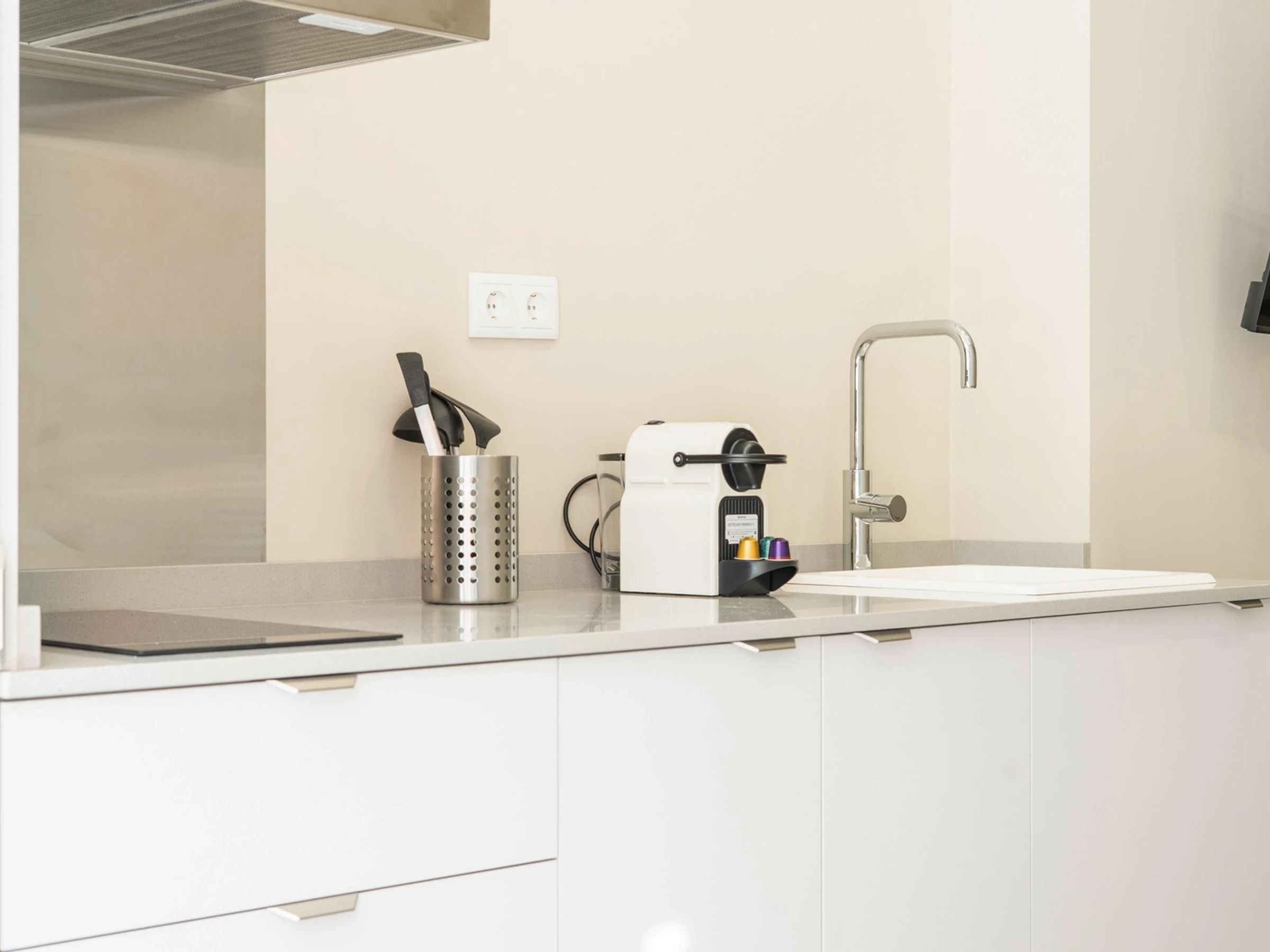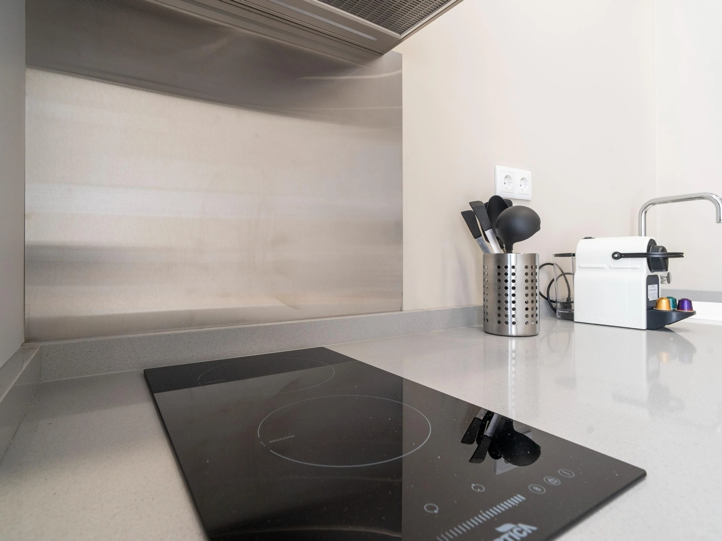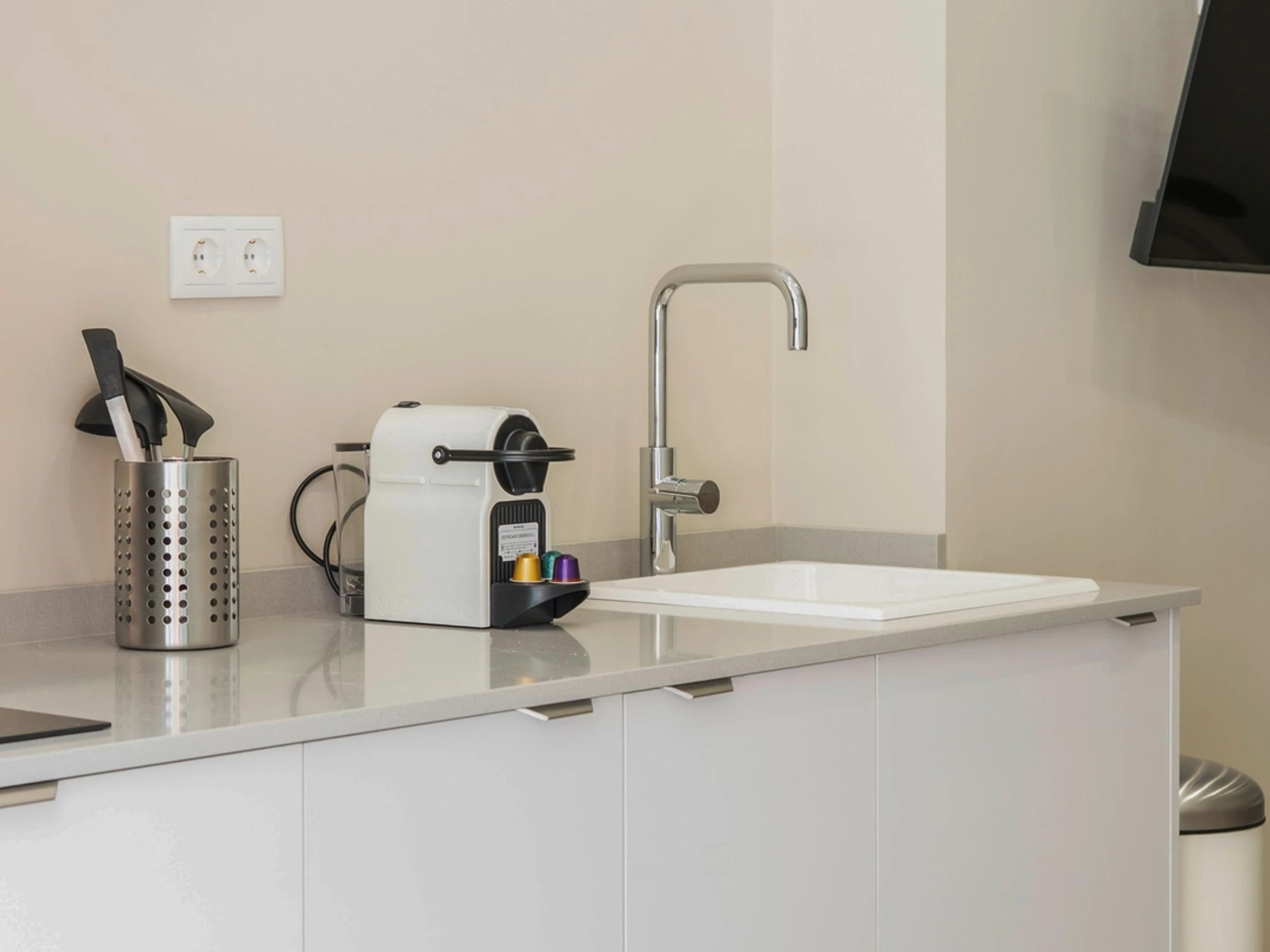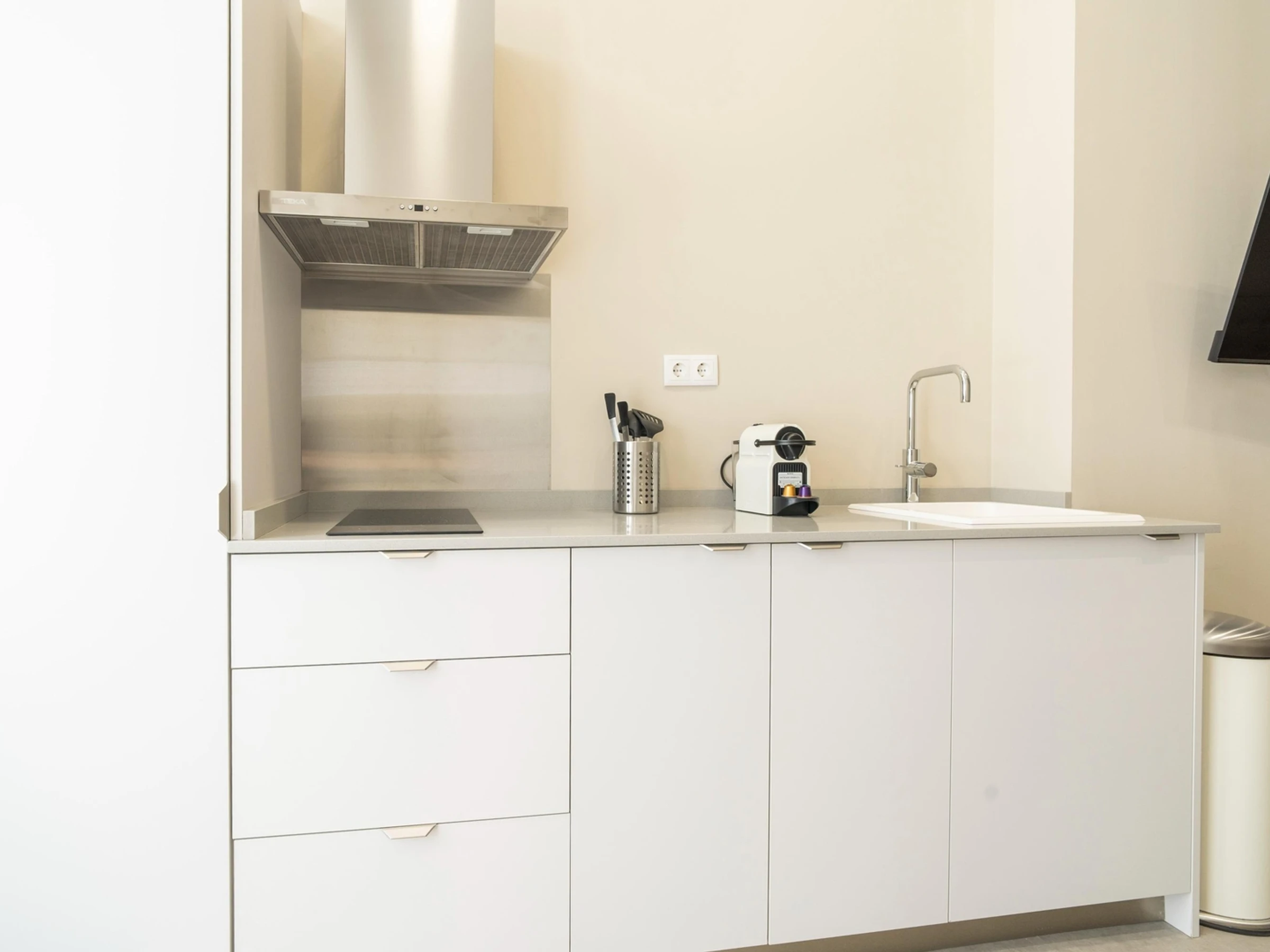 Die integrierte Küche verfügt über ein Cerankochfeld, eine Mikrowelle, eine Kapselkaffeemaschine und Küchenutensilien.