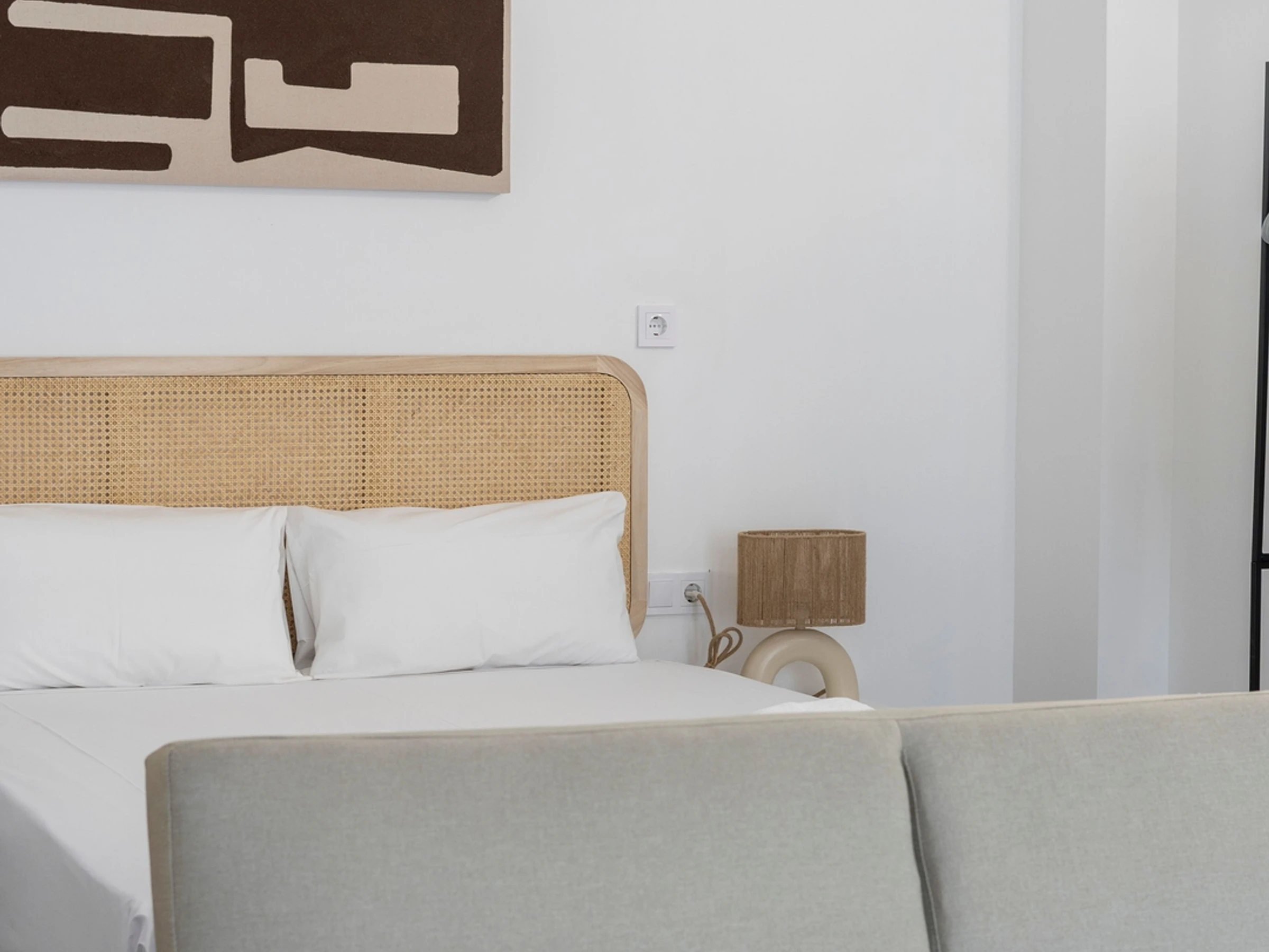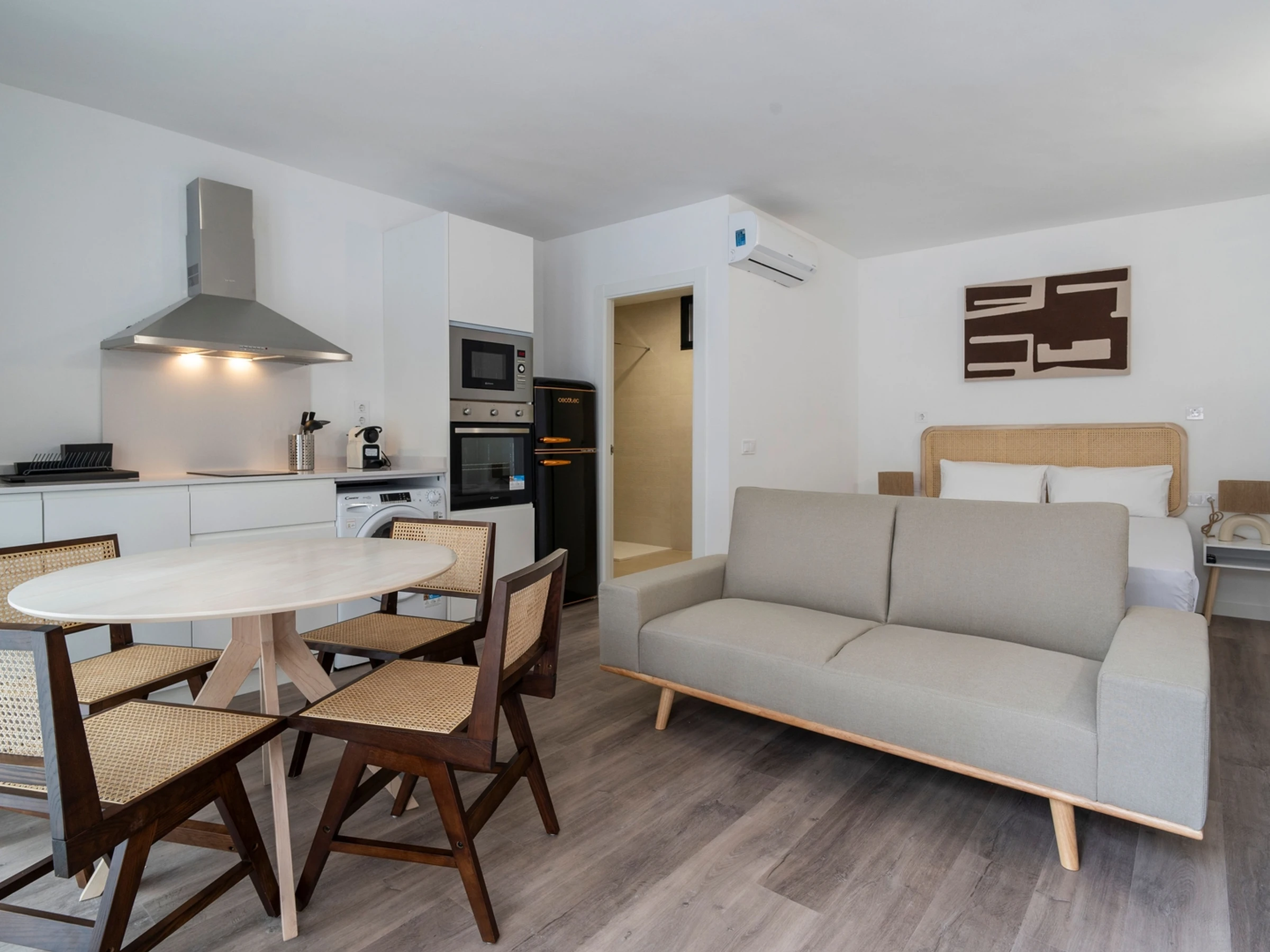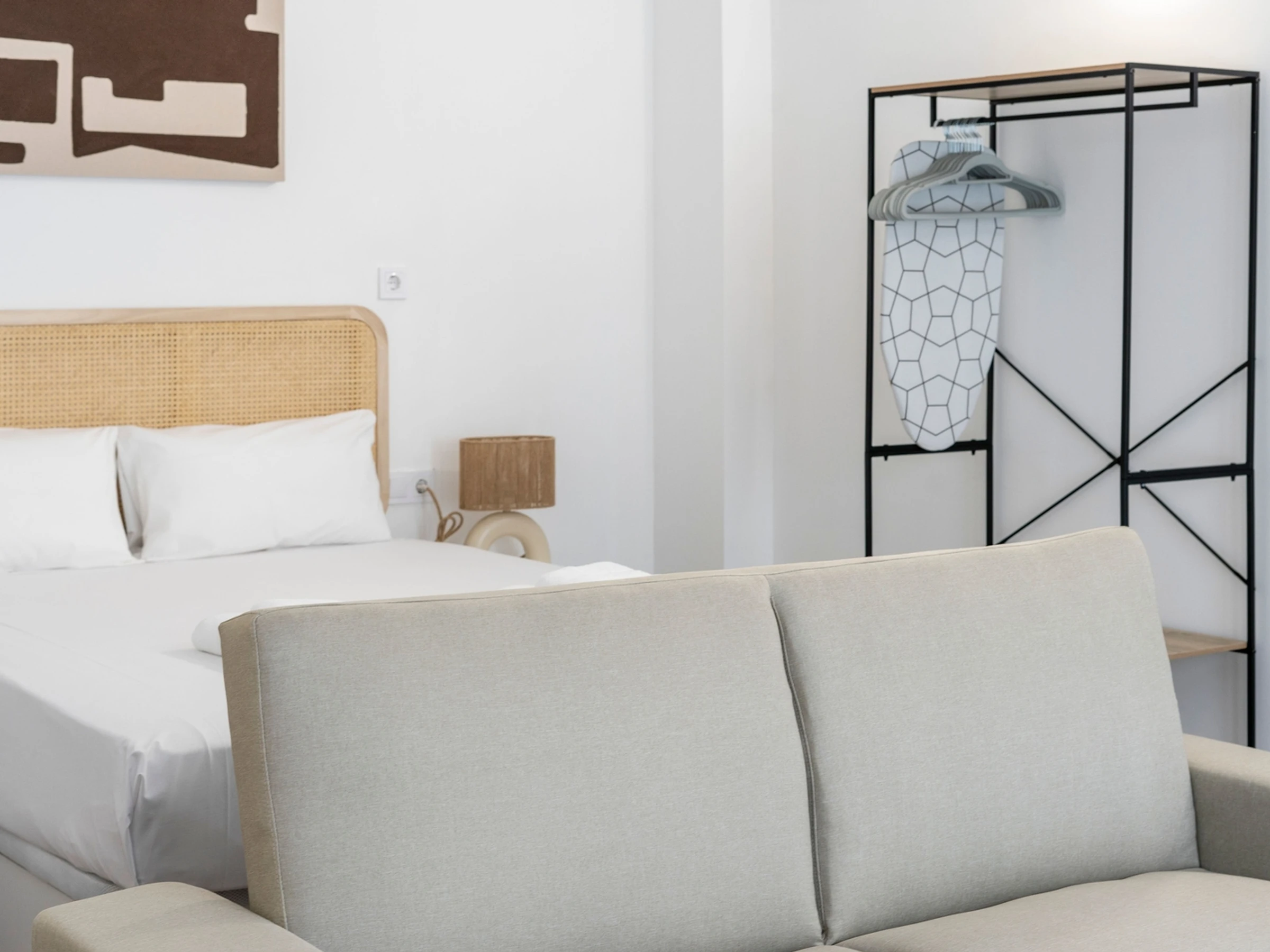 Das Studio besticht durch sein minimalistisches und modernes Design mit funktionalen Möbeln und einer Dekoration in neutralen Tönen, die für ein großzügiges und warmes Ambiente sorgt. Die offene Küche ist komplett ausgestattet mit allen notwendigen Geräten und Küchenutensilien – perfekt für die Zubereitung Ihrer Mahlzeiten. Der Schlafbereich umfasst ein großes Bett und ein Wohnzimmer mit Schlafsofa.