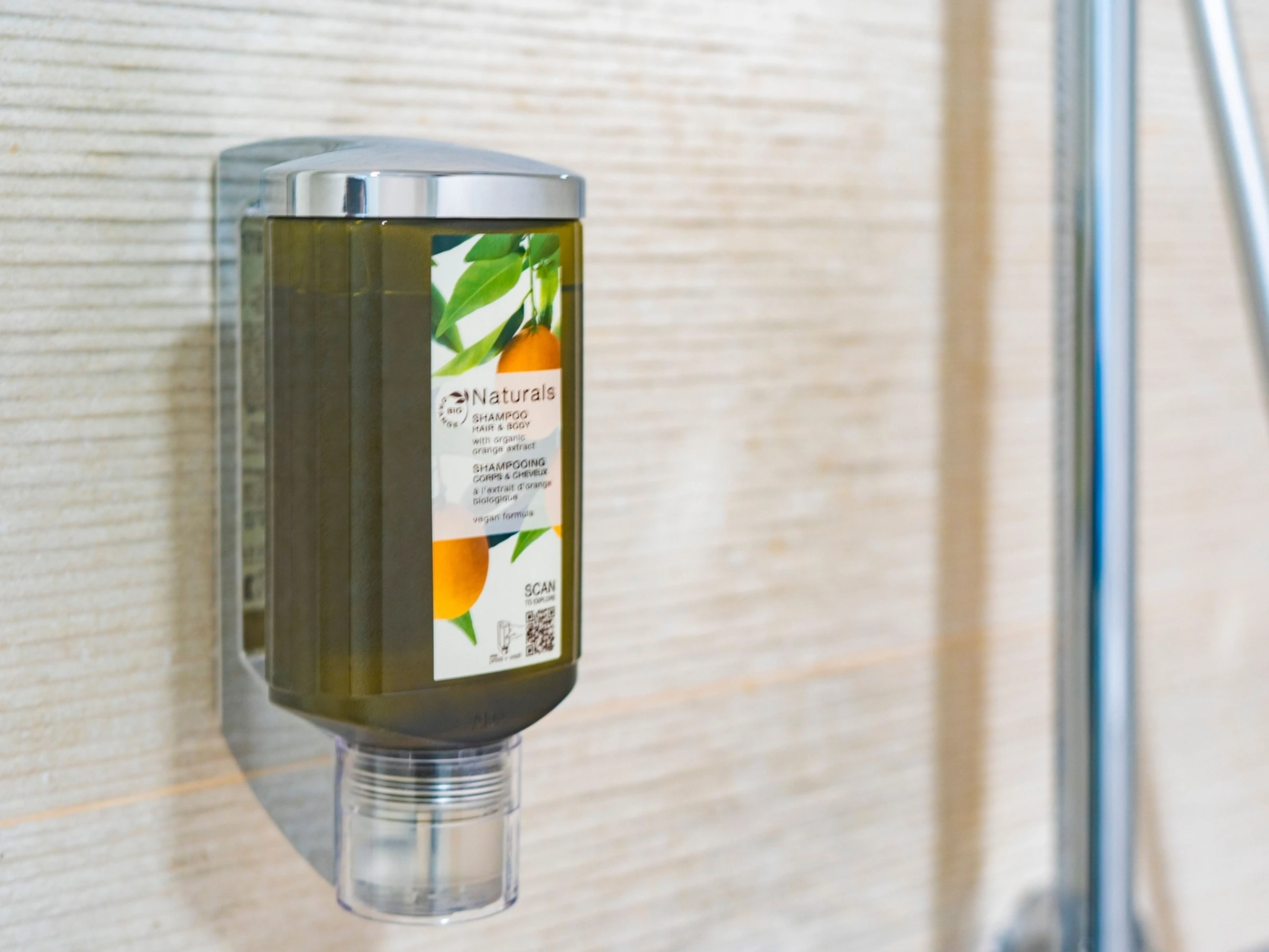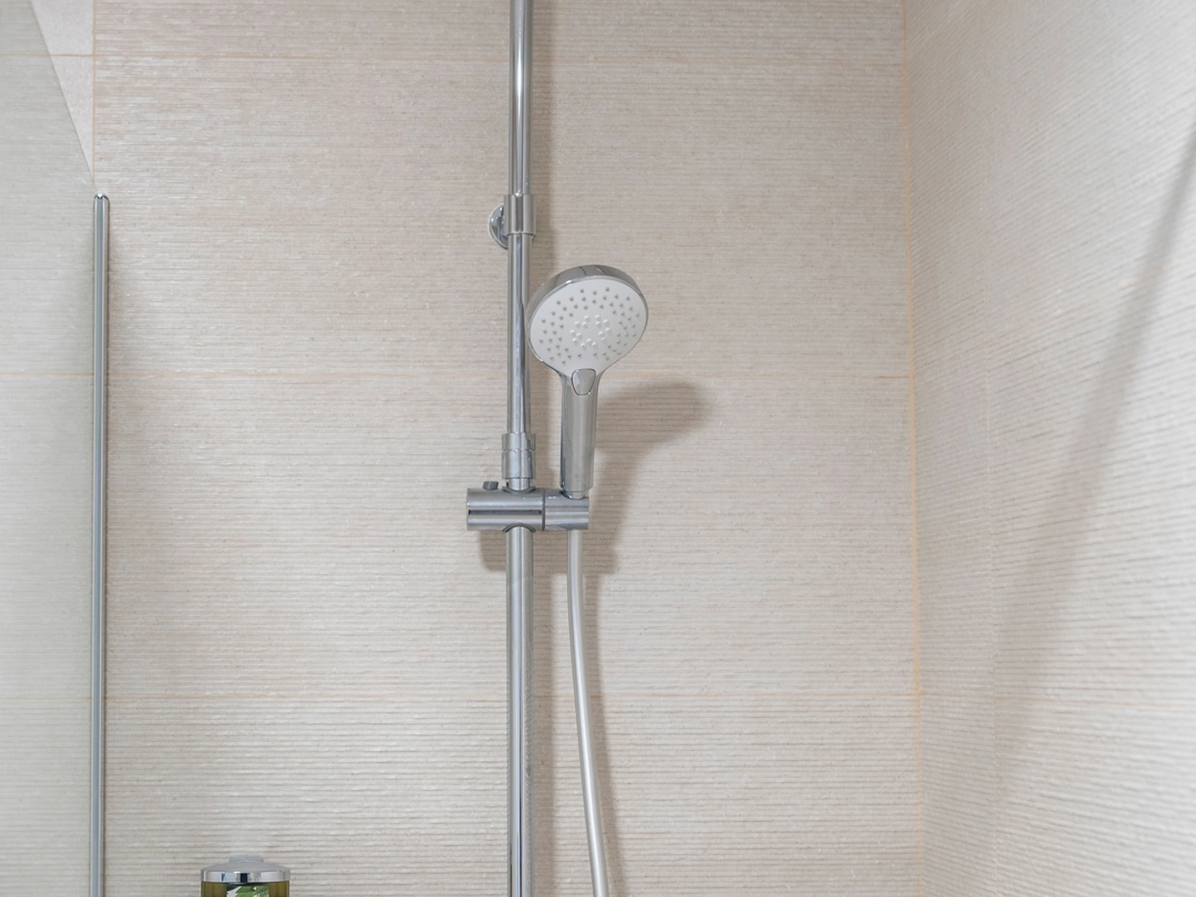 Die komfortable und gut aufgeteilte Einrichtung bietet ein hochwertiges Bett und ein Badezimmer mit Regendusche.