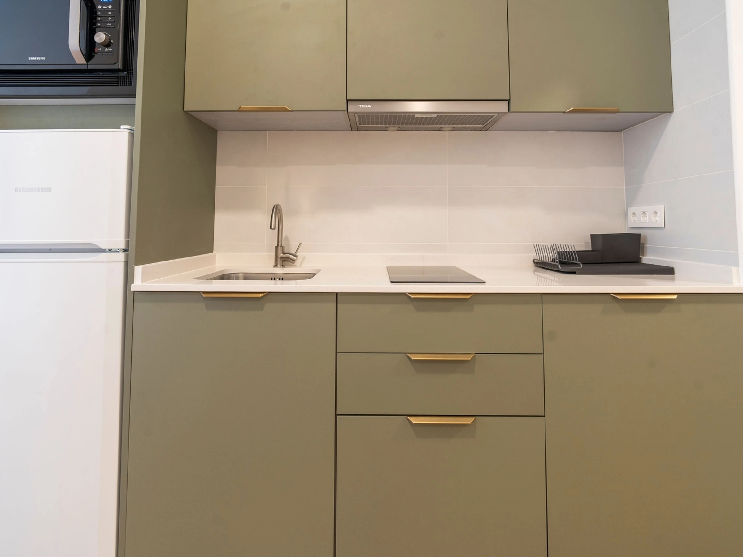 Die Küche ist komplett ausgestattet mit Mikrowelle, Cerankochfeld, Nespresso-Kaffeemaschine, Kühlschrank und allem, was Sie zum Zubereiten eigener Mahlzeiten benötigen.