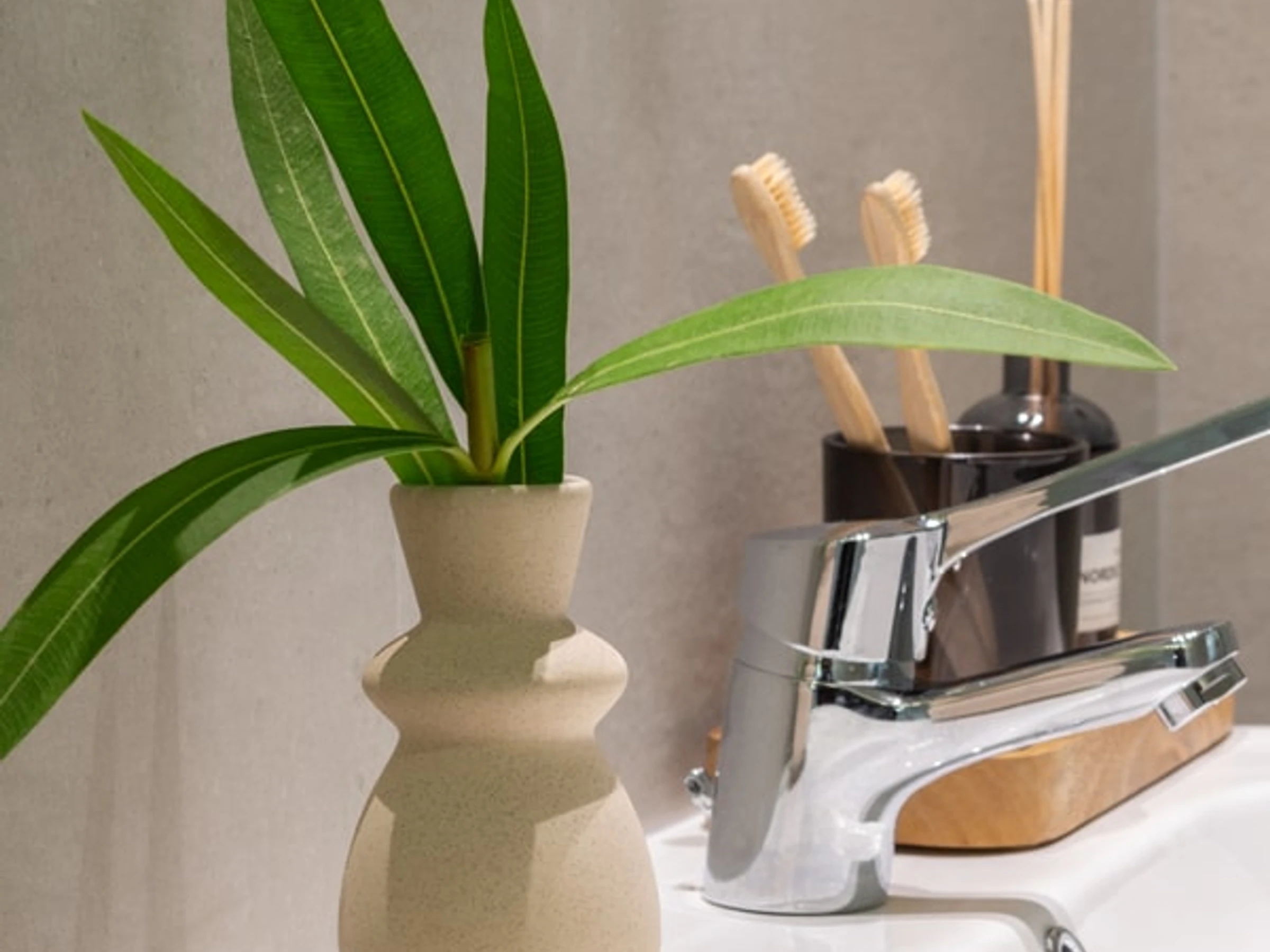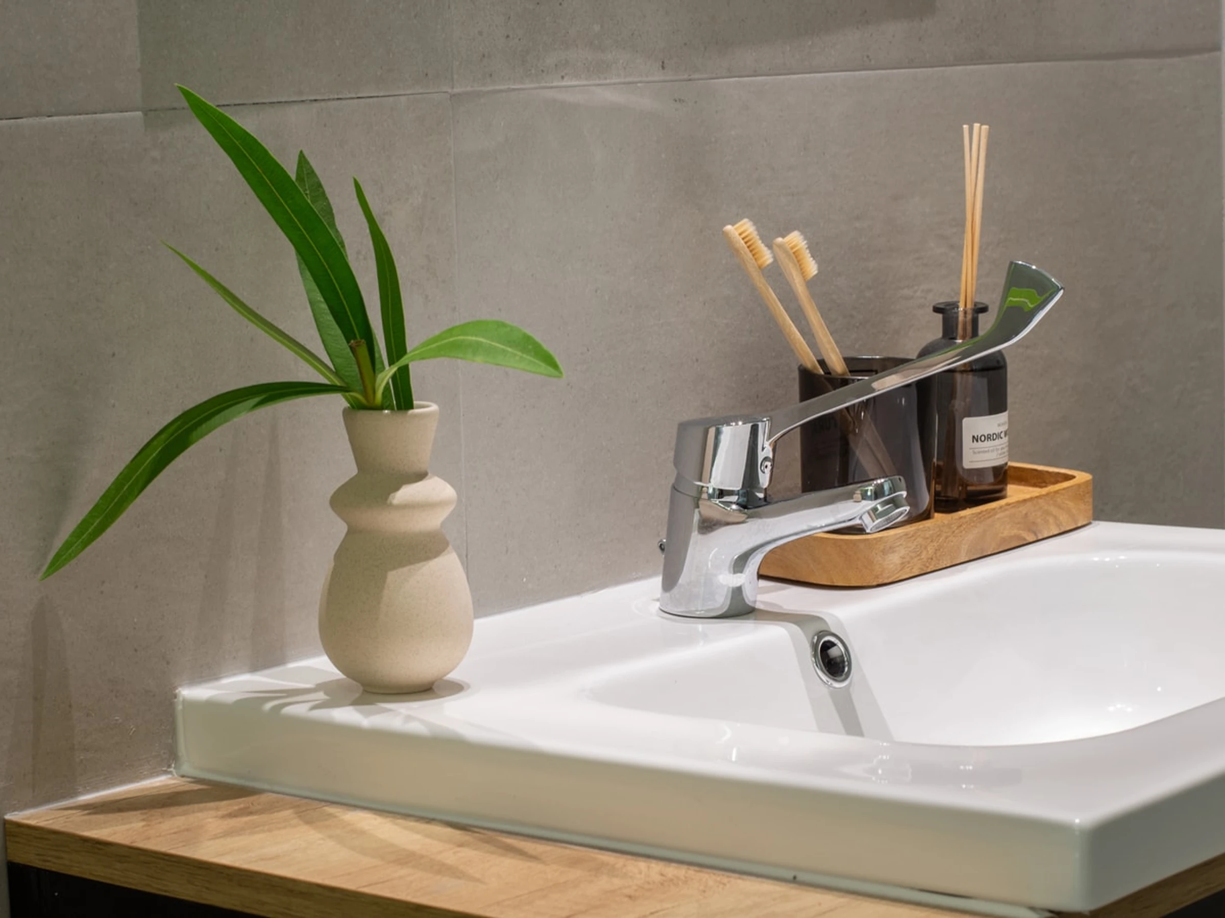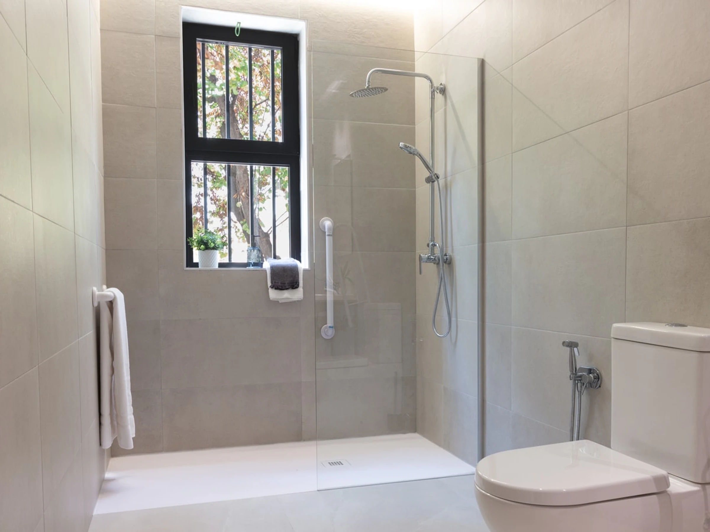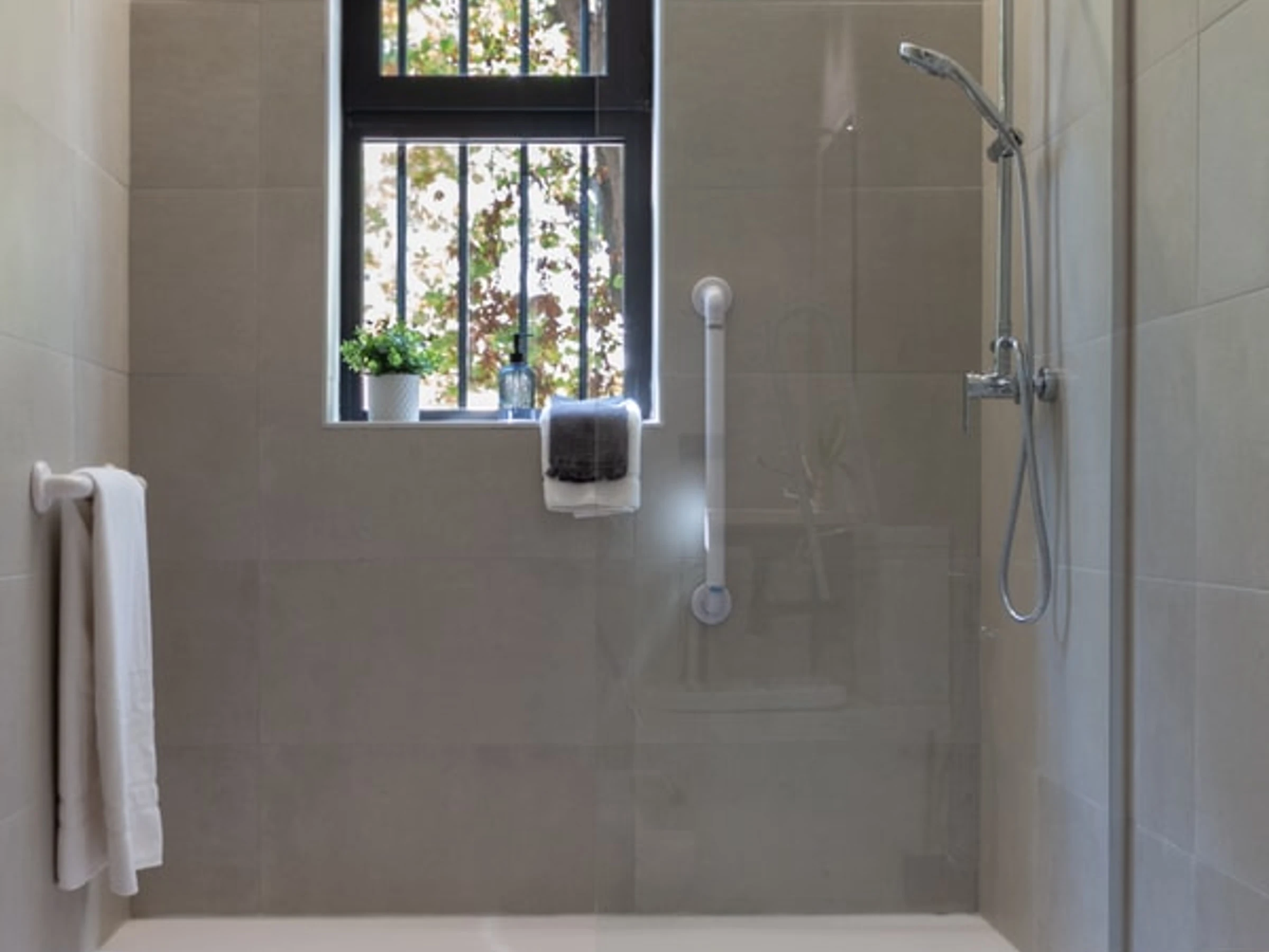 Das Badezimmer ist barrierefrei gestaltet und bietet Funktionen für Menschen mit eingeschränkter Mobilität.