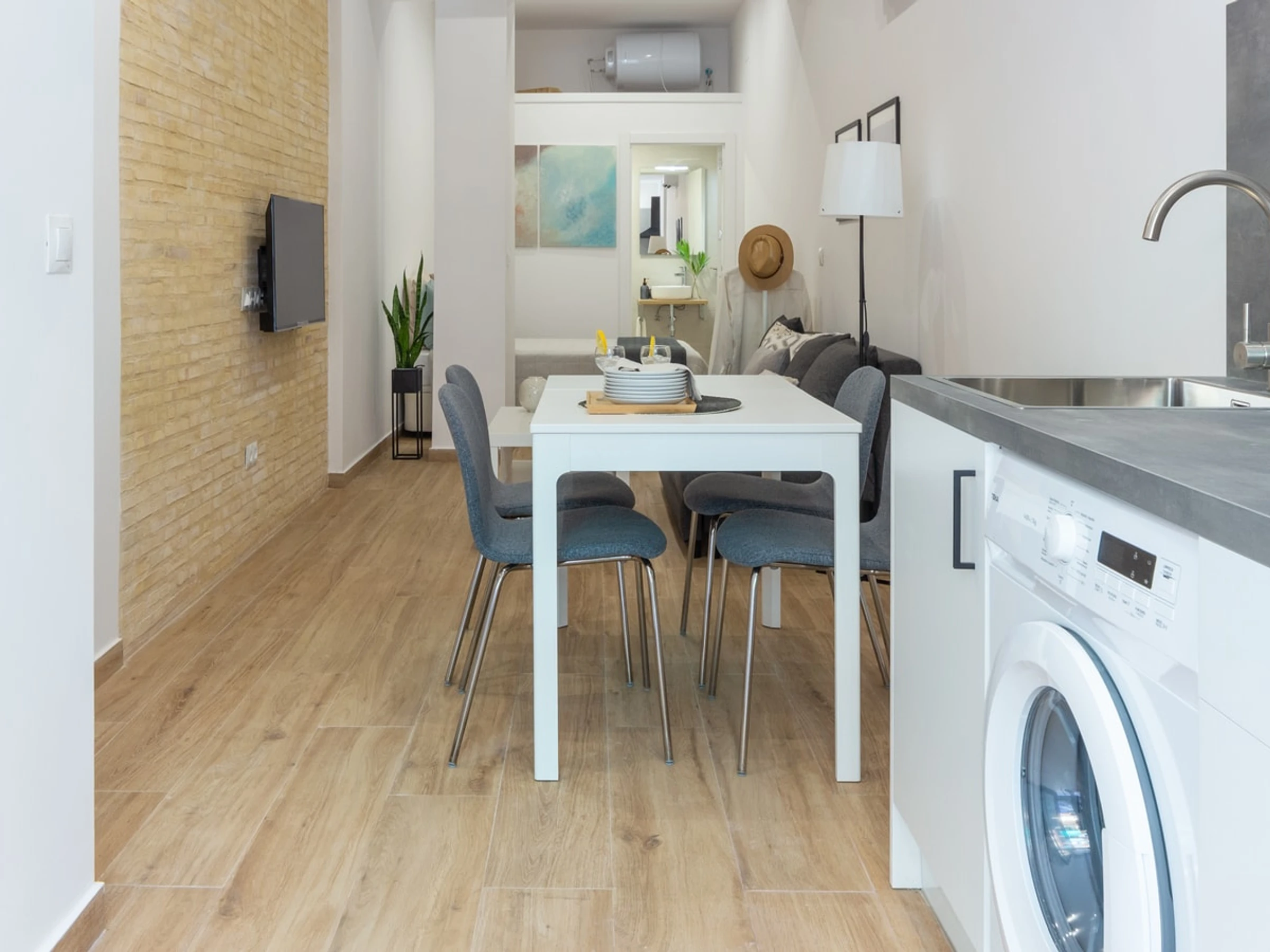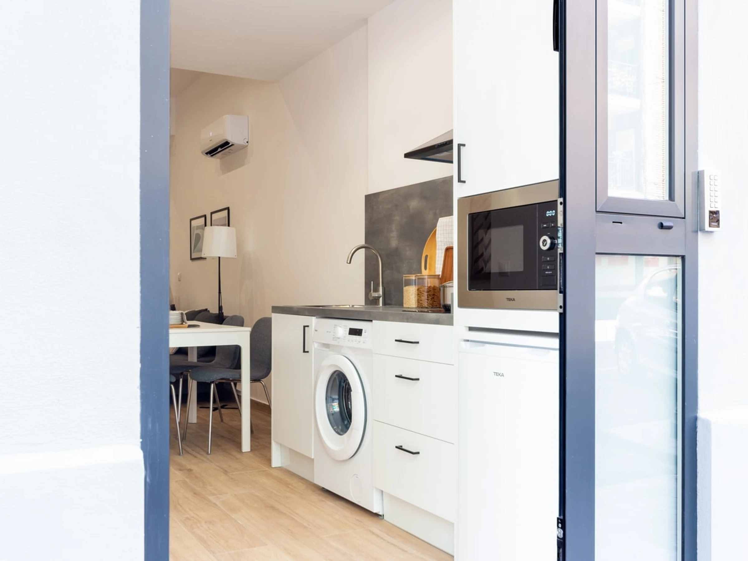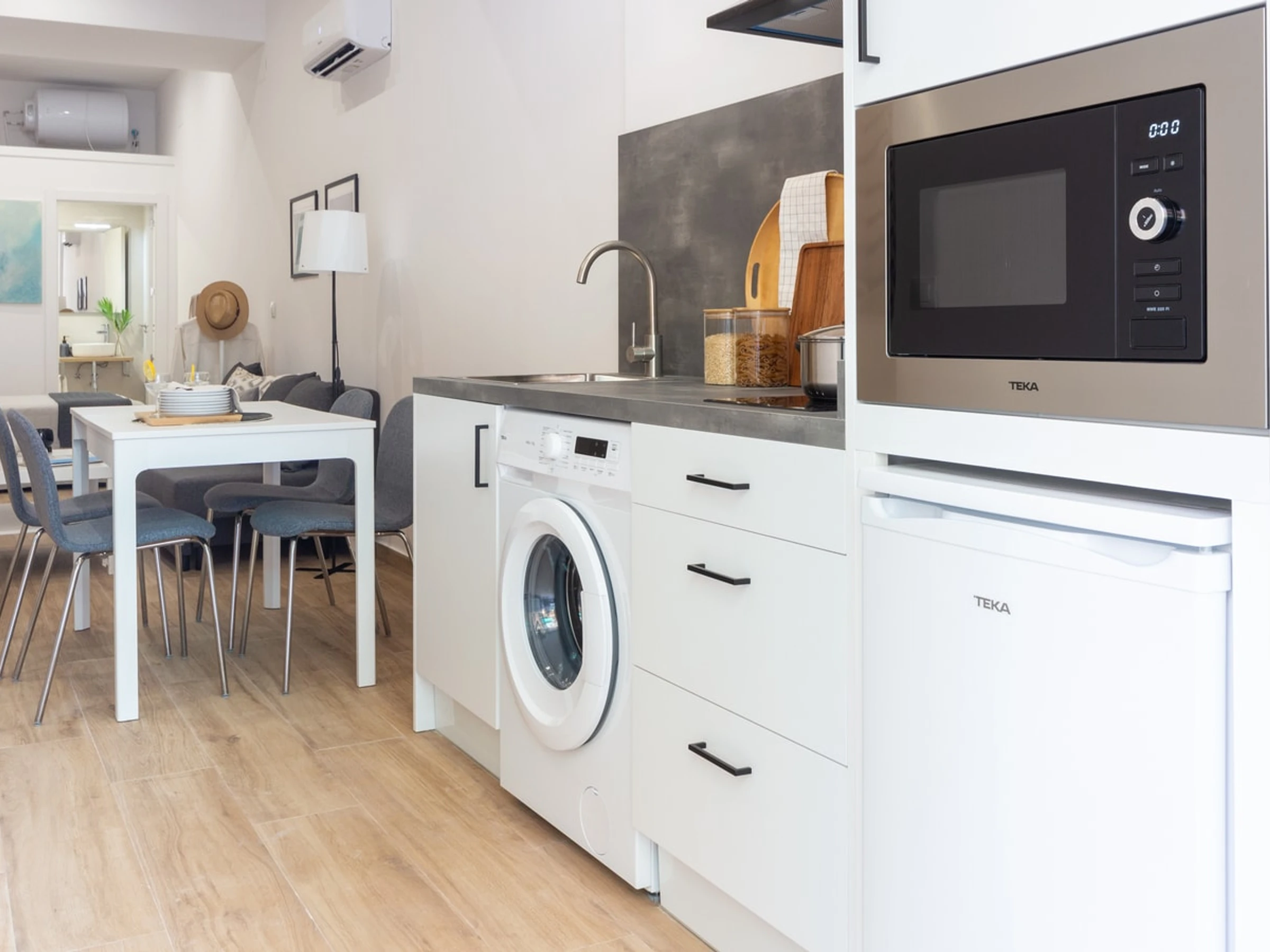 Treten Sie ein in den offenen und durchdacht gestalteten Grundriss, der den gemütlichen Schlafbereich nahtlos mit dem einladenden Wohnbereich verbindet. Die voll ausgestattete Küchenzeile ermöglicht Ihnen die einfache Zubereitung von Mahlzeiten. Die moderne Einrichtung und die stilvollen Möbel schaffen ein einladendes Ambiente und eignen sich für Alleinreisende, Paare oder kleine Gruppen. Direkt neben dem pulsierenden Viertel Ruzafa finden Sie eine vielfältige Auswahl an trendigen Cafés, Künstlerateliers, Restaurants und ein aufregendes Nachtleben.