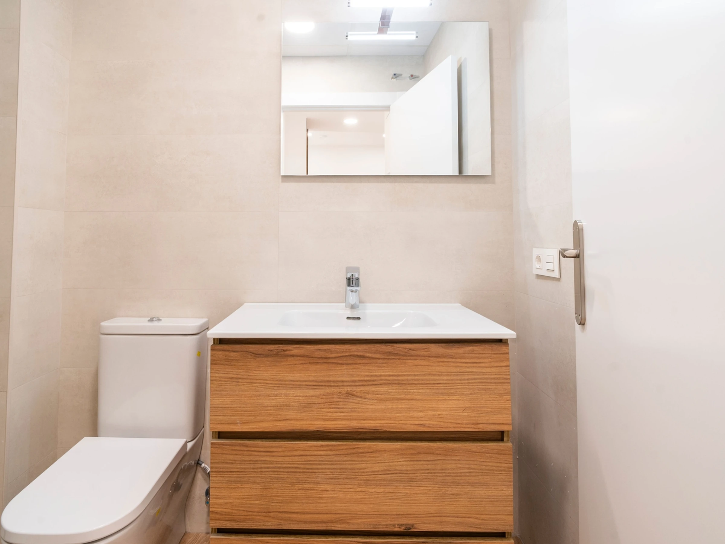 Das Badezimmer verfügt über eine komfortable Dusche und ein modernes, funktionales Design.