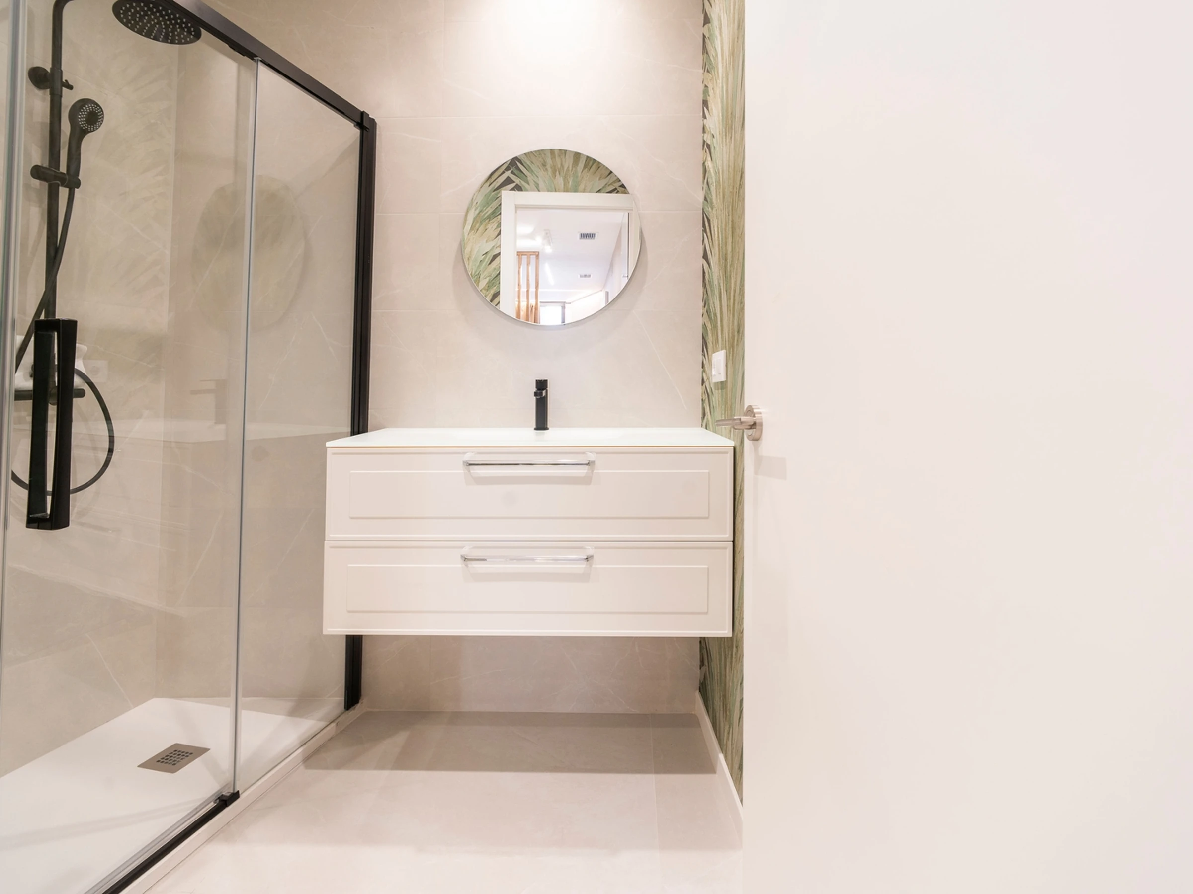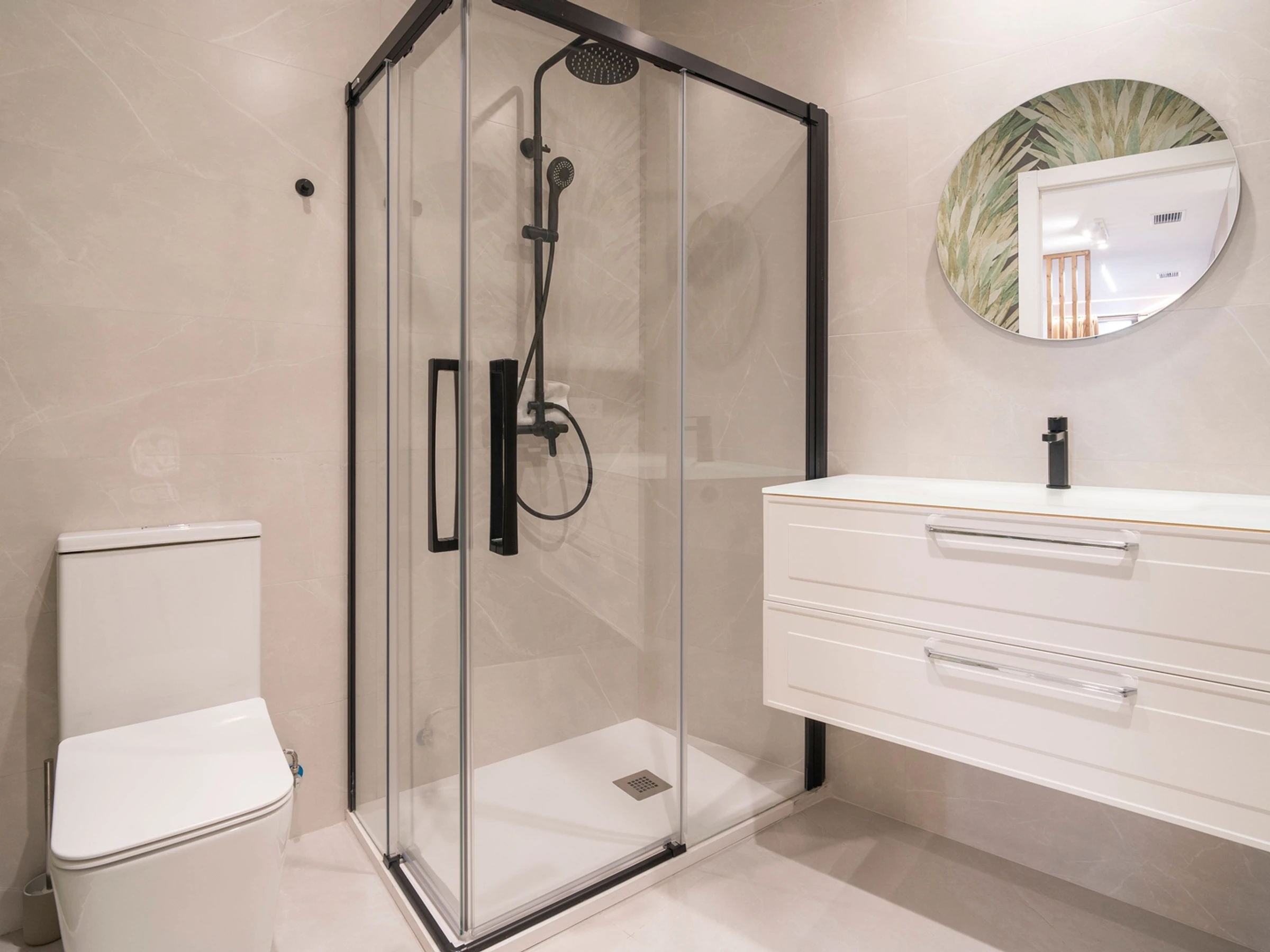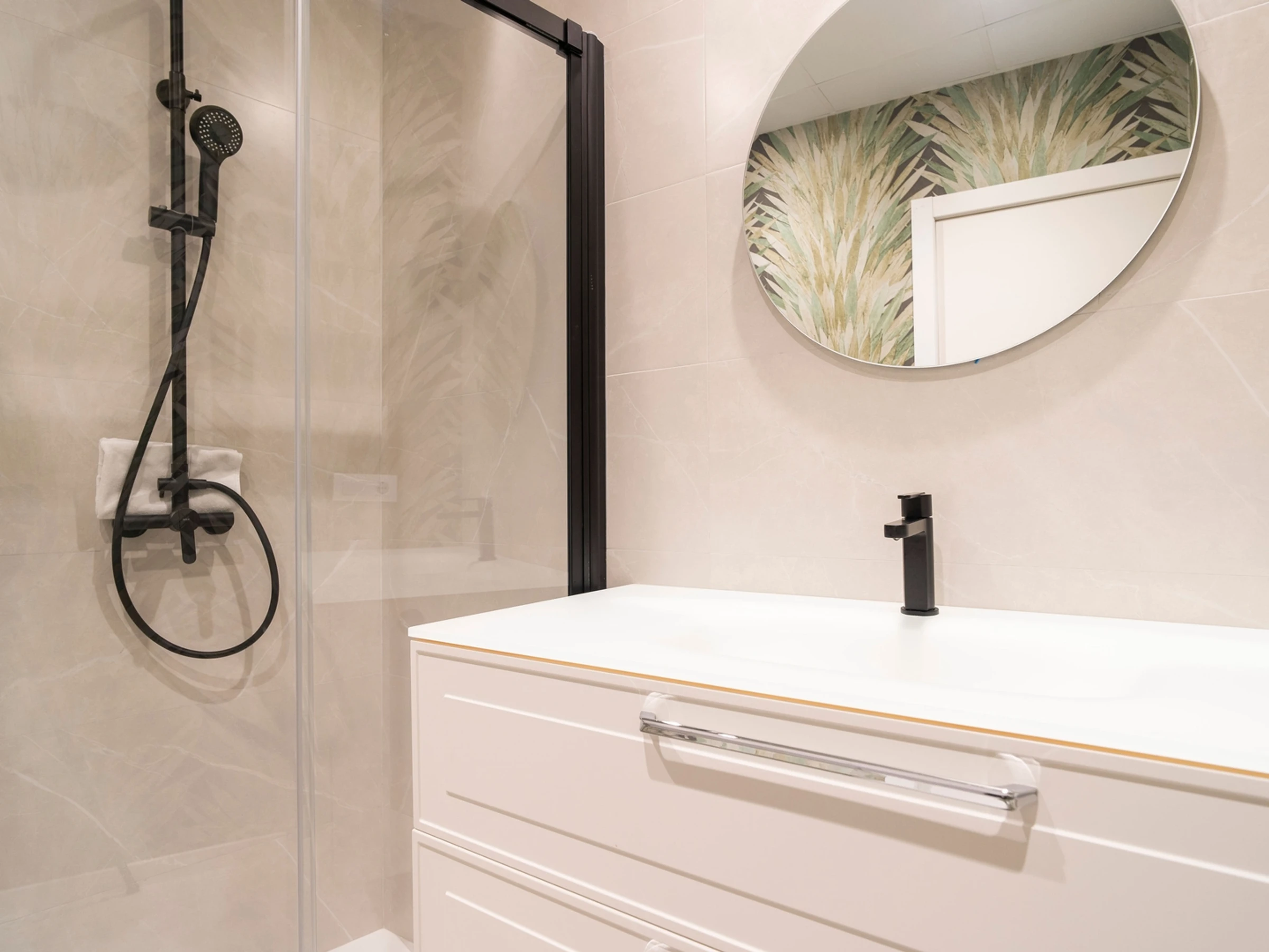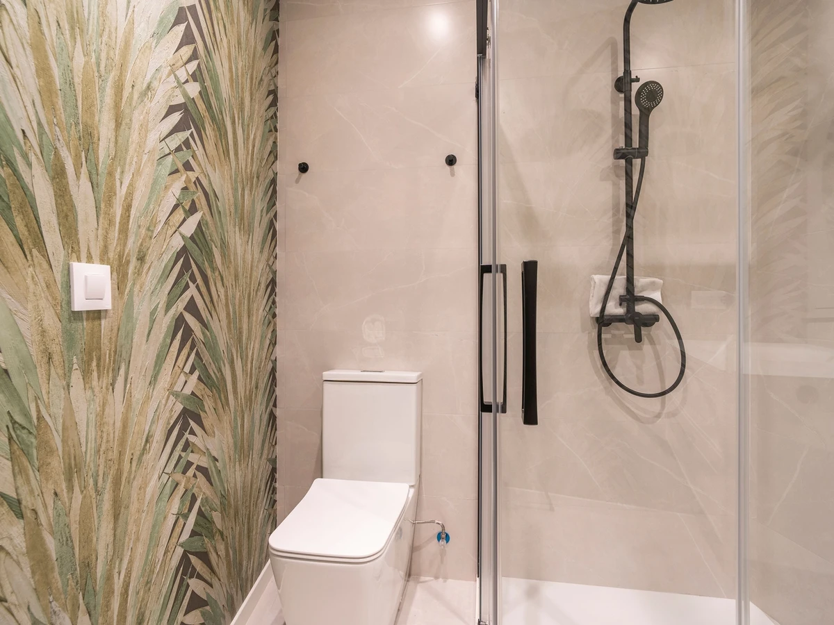 Das Badezimmer besticht durch eine elegante und geräumige Regendusche, die nach einem Tag in der Stadt für Erfrischung sorgt.