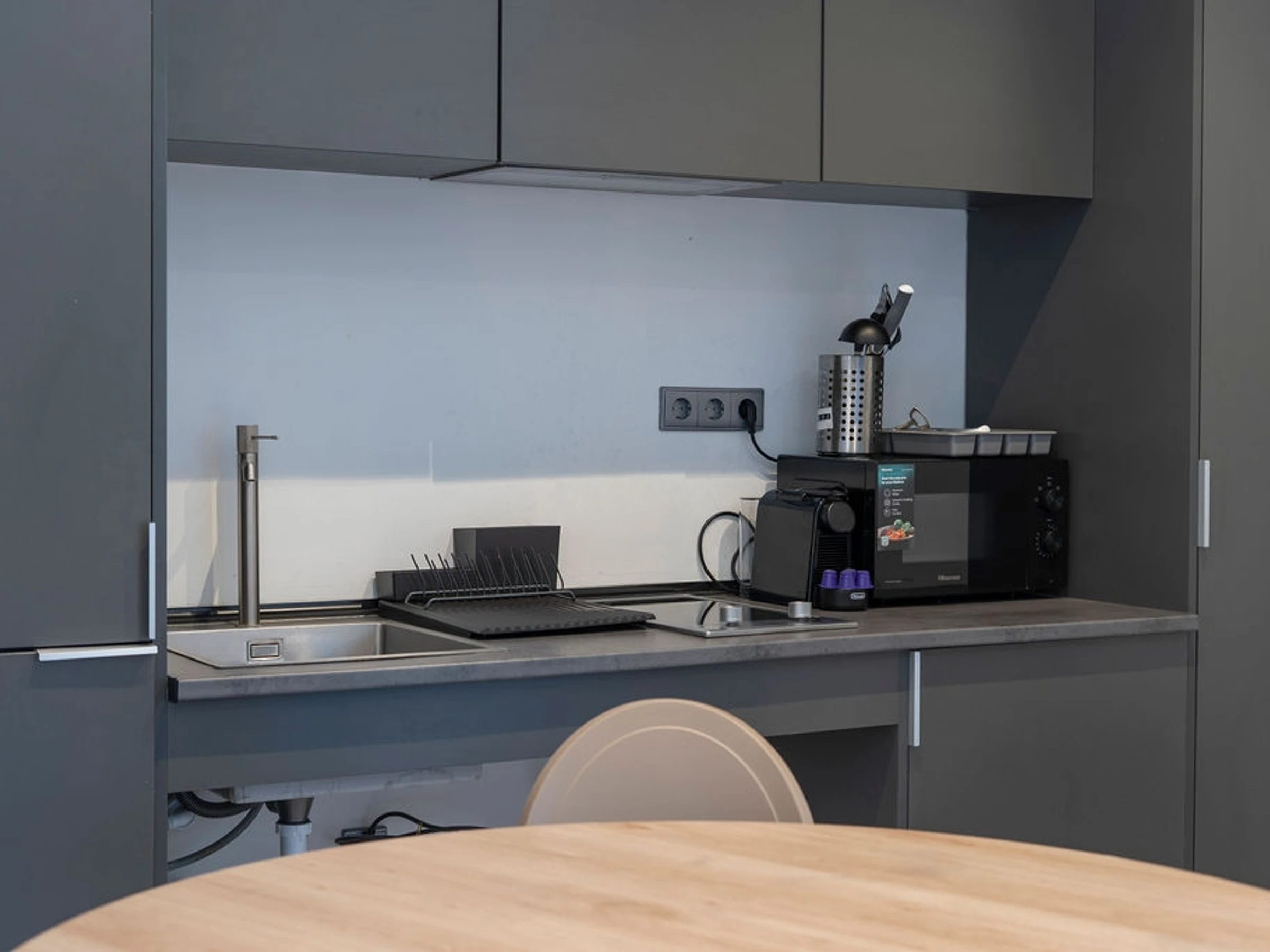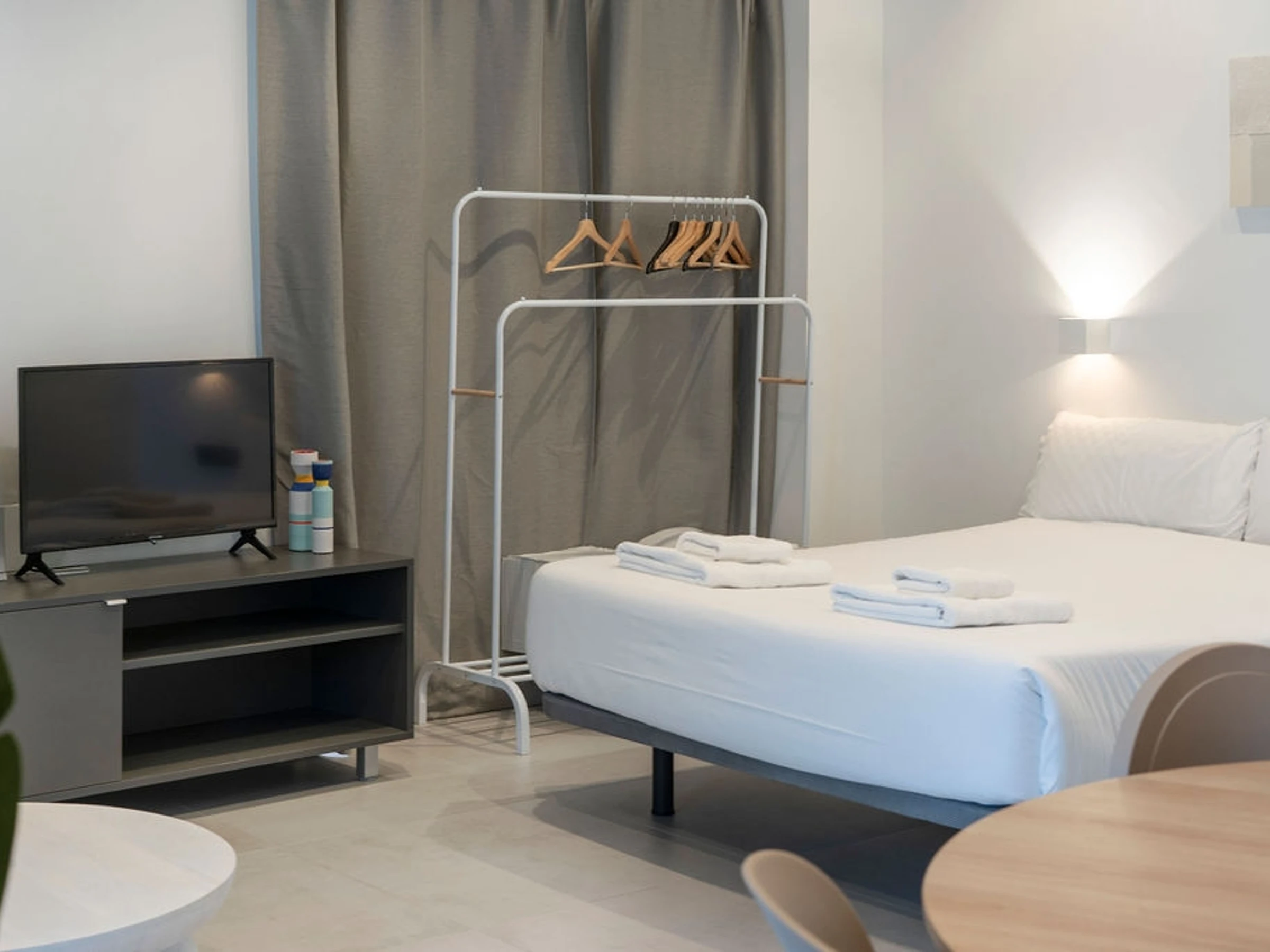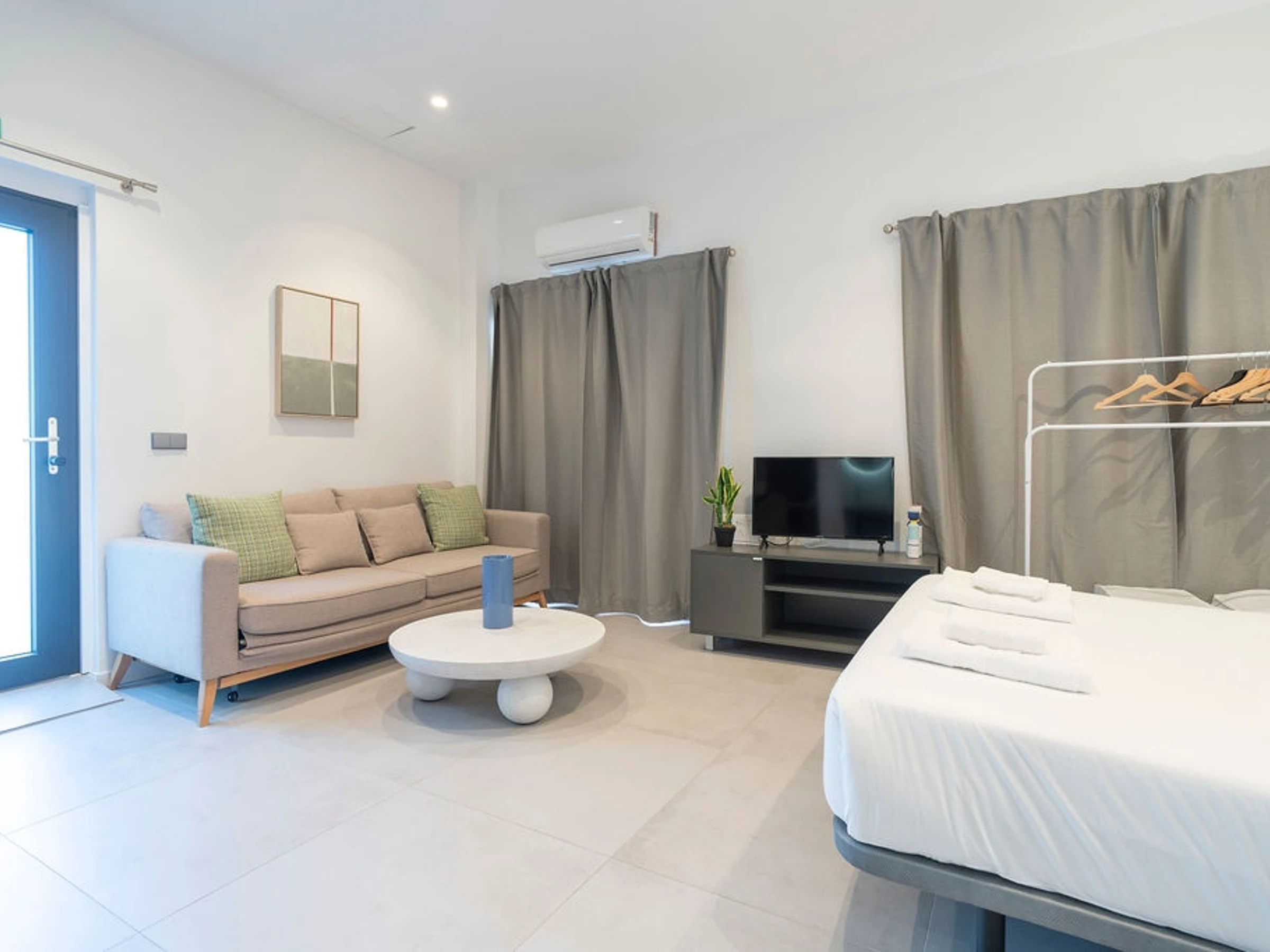 Dieser Raum ist ideal für anspruchsvolle Singles und Paare und bietet Ihnen Komfort und Bequemlichkeit. Die Raumaufteilung des Studios zeugt von intelligentem Design und maximiert den Platz, sodass der Wohnbereich nahtlos in die integrierte Küche übergeht.