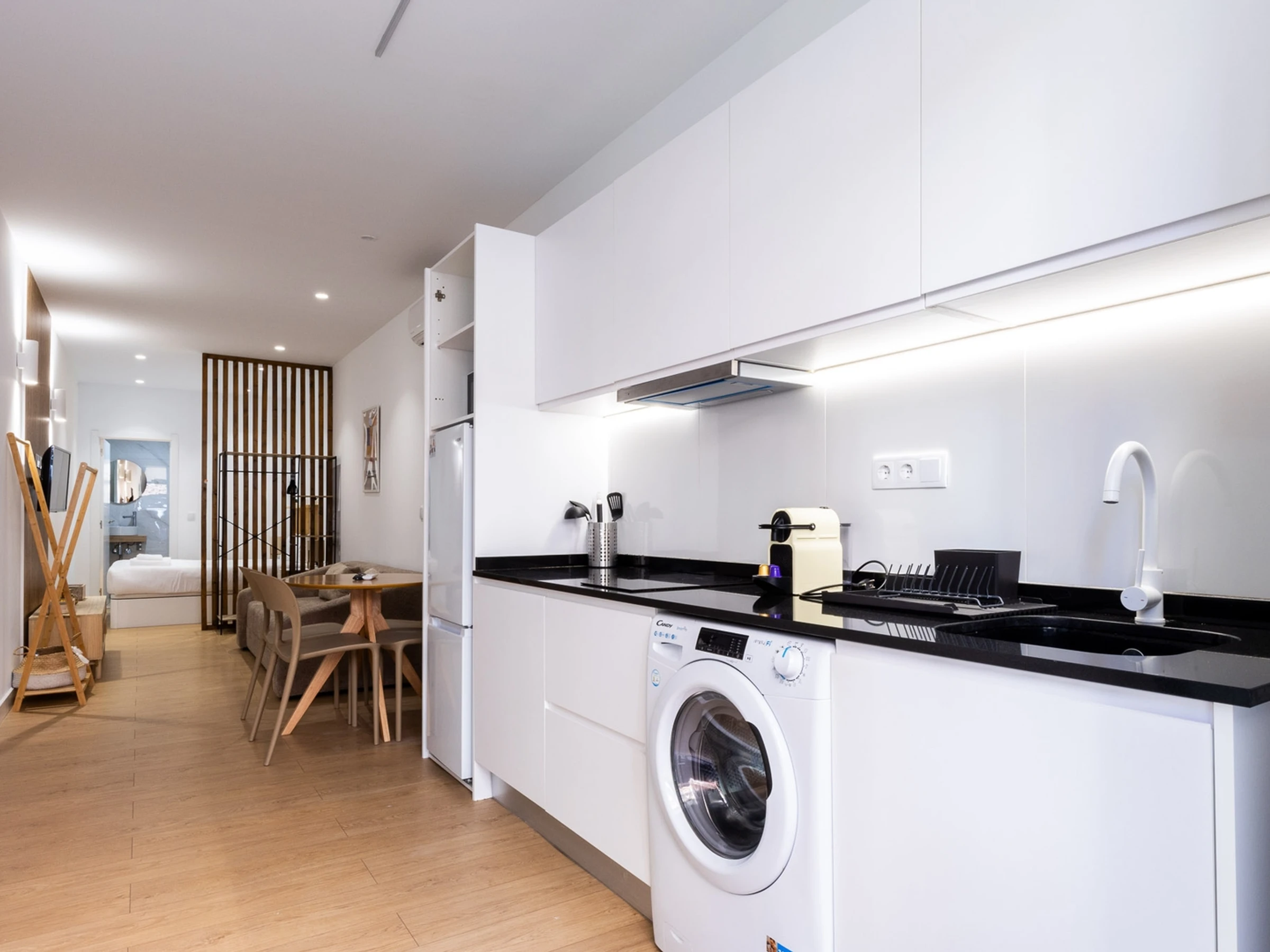 Das Studio bietet Platz für bis zu vier Gäste und verfügt über ein Schlafsofa, das sich in ein gemütliches Doppelbett verwandeln lässt, sowie ein geräumiges Queensize-Bett für erholsamen Schlaf. Die Küche ist komplett ausgestattet mit allen Geräten, die Sie benötigen, darunter eine Nespresso-Maschine für genussvolle Morgenstunden, eine Mikrowelle für die schnelle Zubereitung von Mahlzeiten und ein Wasserkocher für Ihre Lieblingsgetränke. Dank kostenlosem WLAN bleiben Sie stets in Verbindung und können sowohl private als auch berufliche Angelegenheiten erledigen. Die charmanten Cafés, Restaurants und Geschäfte von Ruzafa sind nur wenige Schritte entfernt, sodass Sie das pulsierende Stadtleben bequem erkunden können.