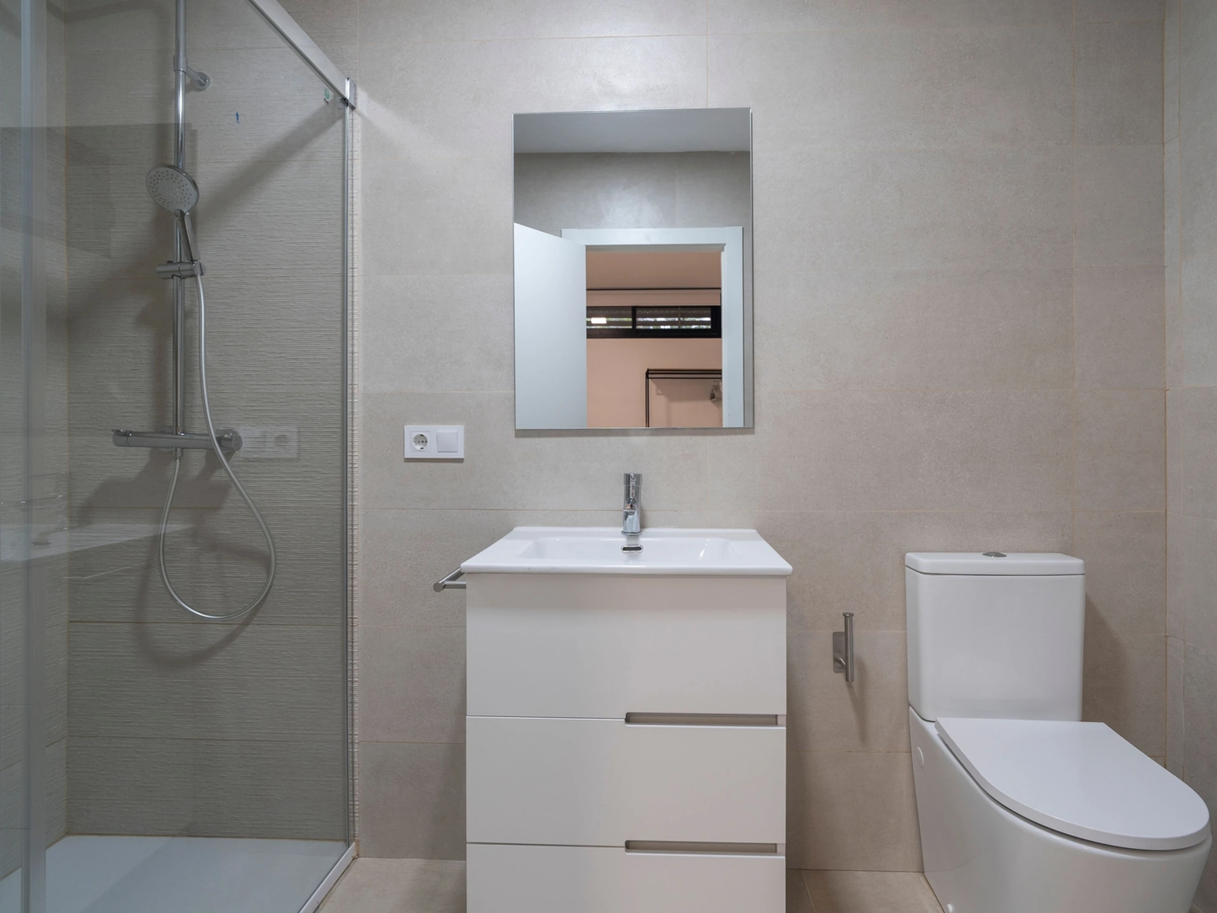 Das Badezimmer besticht durch sein elegantes und modernes Design und verfügt über eine Regendusche mit neutralen Farbtönen – ideal zum Entspannen nach einem erlebnisreichen Tag in der Stadt.