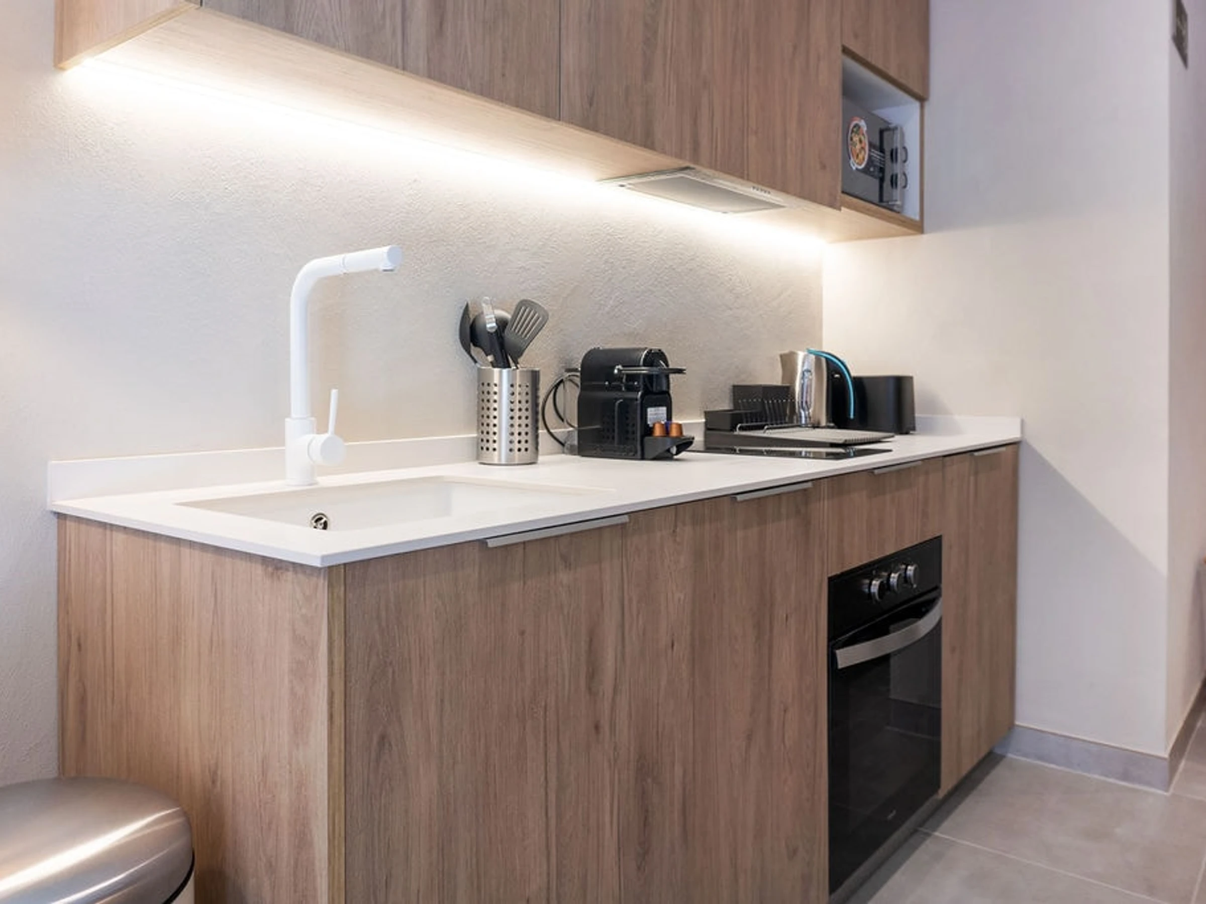 Die Küche ist komplett ausgestattet mit allen Geräten, die Sie benötigen, darunter eine Nespresso-Kaffeemaschine für köstlichen Kaffee am Morgen, eine Mikrowelle zum schnellen Aufwärmen Ihrer Mahlzeiten und ein Wasserkocher für Ihren Lieblingstee zu jeder Tageszeit. Für alle, die in Verbindung bleiben möchten, steht WLAN zur Verfügung, damit Sie Ihre privaten oder beruflichen Angelegenheiten erledigen können.