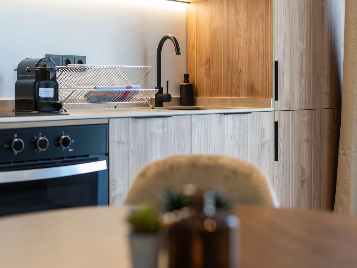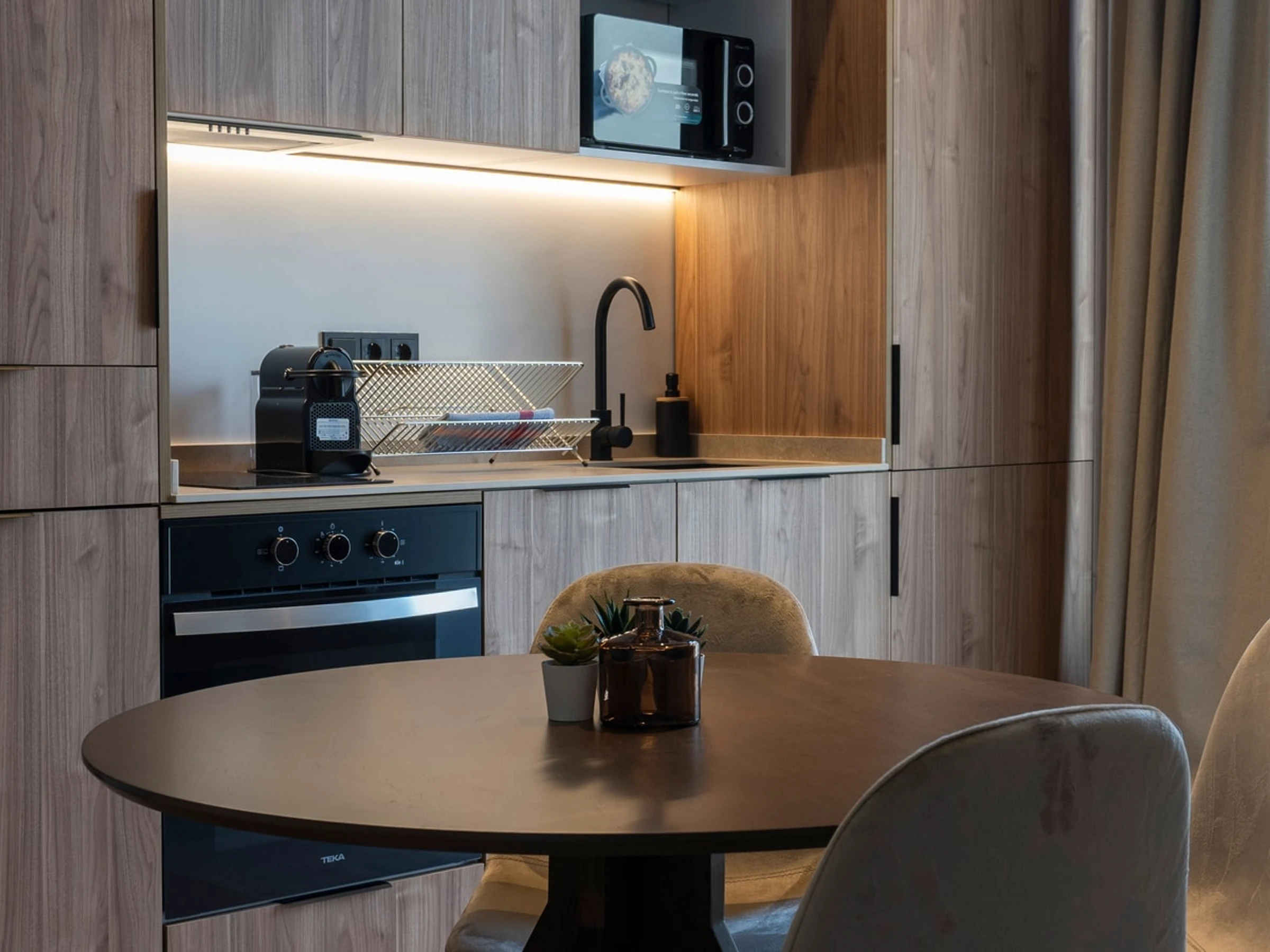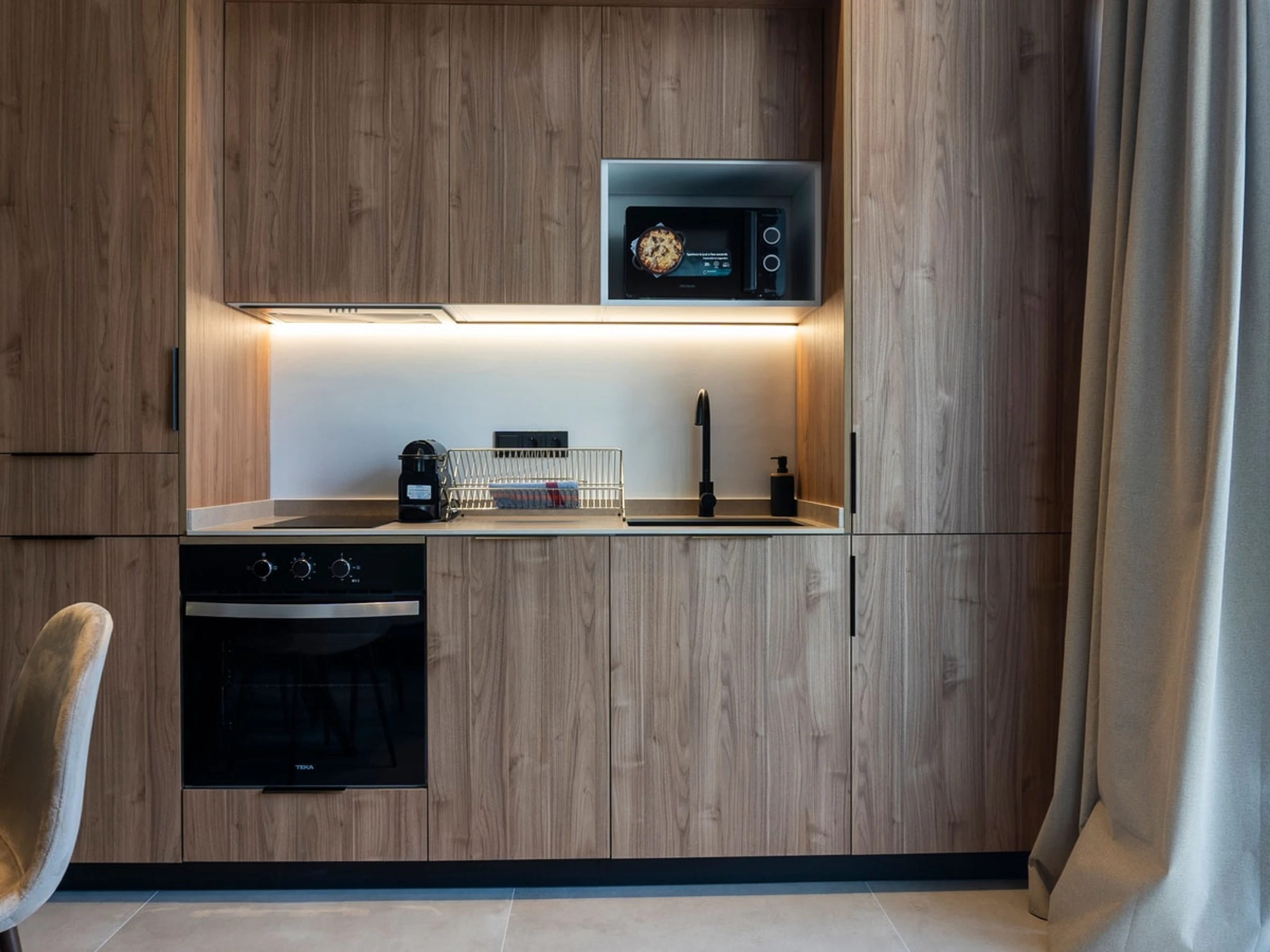 Beim Betreten empfängt Sie ein sorgfältig gestalteter Raum, der Komfort und Funktionalität vereint. Das Studio bietet Platz für drei Personen und verfügt über ein Schlafsofa, das sich in ein bequemes Bett verwandeln lässt, sowie ein geräumiges Queensize-Bett für erholsamen Schlaf. Die Küche ist komplett ausgestattet mit allen Geräten, die Sie benötigen, darunter eine Nespresso-Kaffeemaschine für köstlichen Kaffee am Morgen, eine Mikrowelle zum schnellen Aufwärmen Ihrer Mahlzeiten und ein Wasserkocher für Ihren Lieblingstee zu jeder Tageszeit. Für alle, die in Verbindung bleiben möchten, steht WLAN zur Verfügung, damit Sie Ihre privaten oder beruflichen Angelegenheiten erledigen können.